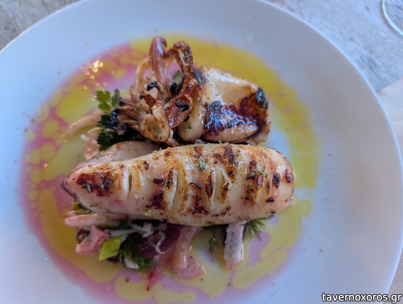 "Καλαμάρι* ντόπιο στη σχάρα με σαλάτα μαραθόριζα, ελιά, σουμάκ και μυρωδικά" (μια χαρά)