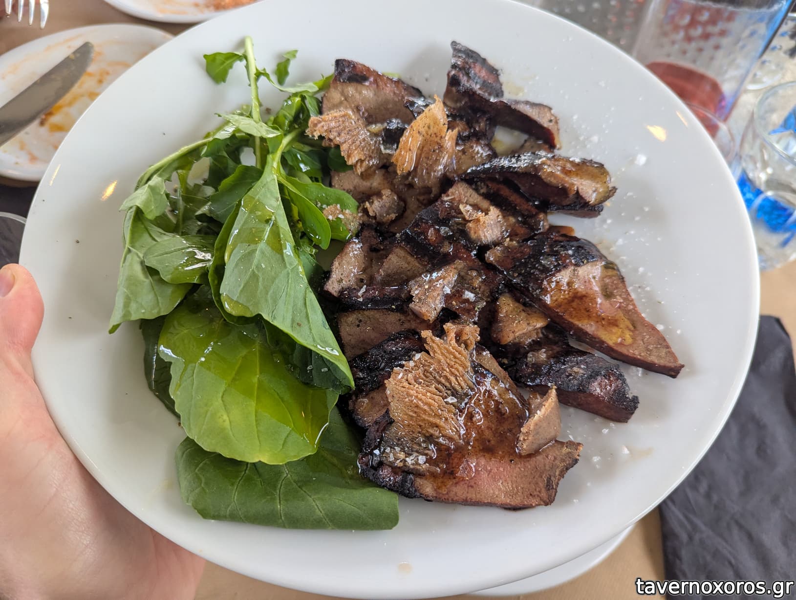 "Μοσχαρίσιο συκώτι στη σχάρα με βούτυρο βασιλομανίταρου και φύλλα ρόκας" (εξαιρετικό, το βούτυρο έπαιξε σοβαρή μπαλίτσα)