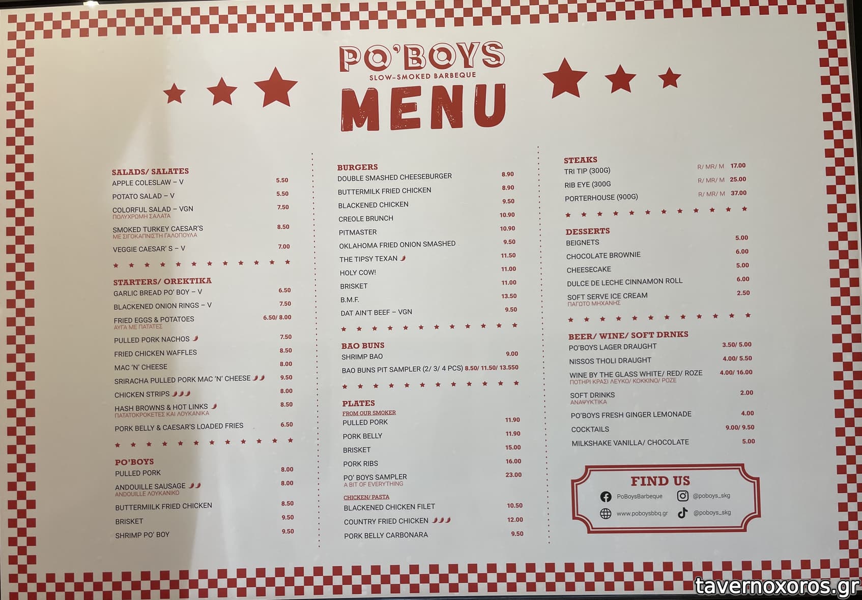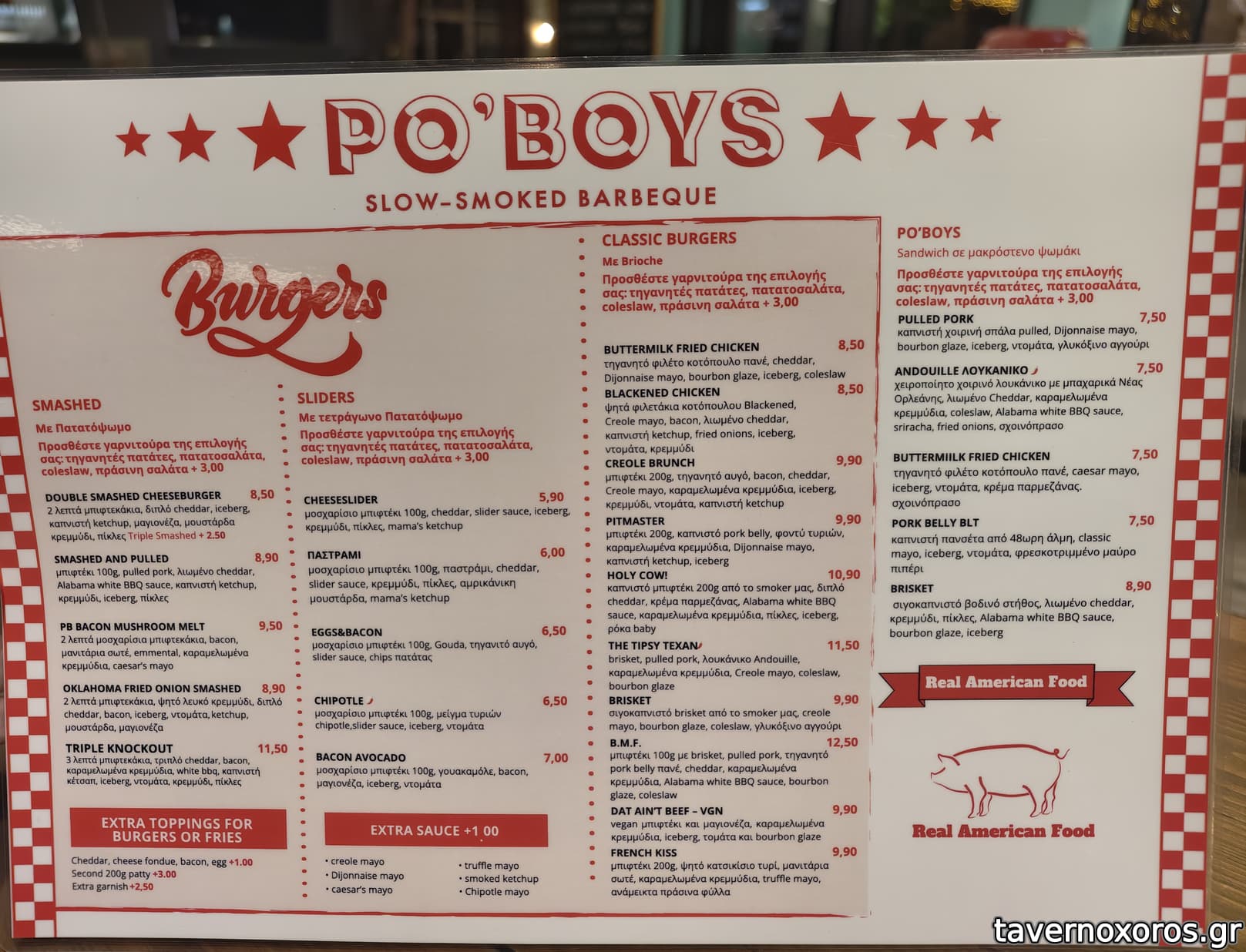 Το αυθεντικό σιγοκαπνιστό ΒBQ φυσικά είναι ο πρωταγωνιστής. Brisket, short ribs, spare ribs, crispy pork belly και pulled pork σε burgers ή πιατέλες με όλα τα αντίστοιχα συνοδευτικά πιάτα σιγοψήνονται στο custom offset smoker σε θερμοκρασία 120 ο C για τουλάχιστον 8 ώρες, ενώ το μενού, δεν περιορίζεται μόνο σε αυτά, αλλά έχει και άφθονες επιρροές από την κουλτούρα του Αμερικάνικου Νότου.