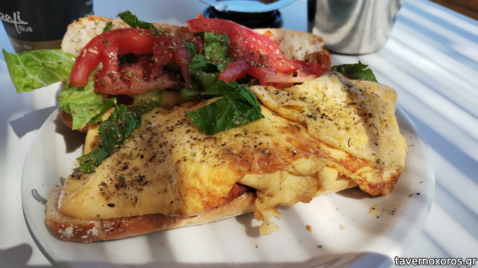 Ζήτησα αυγά ή ομελέτα και καταλήξαμε σε αυτό: ομελέτα σε τσαμπατα με κοτόπουλο, ντομάτα, μαρούλι. Εξαιρετικό! (3.2€)