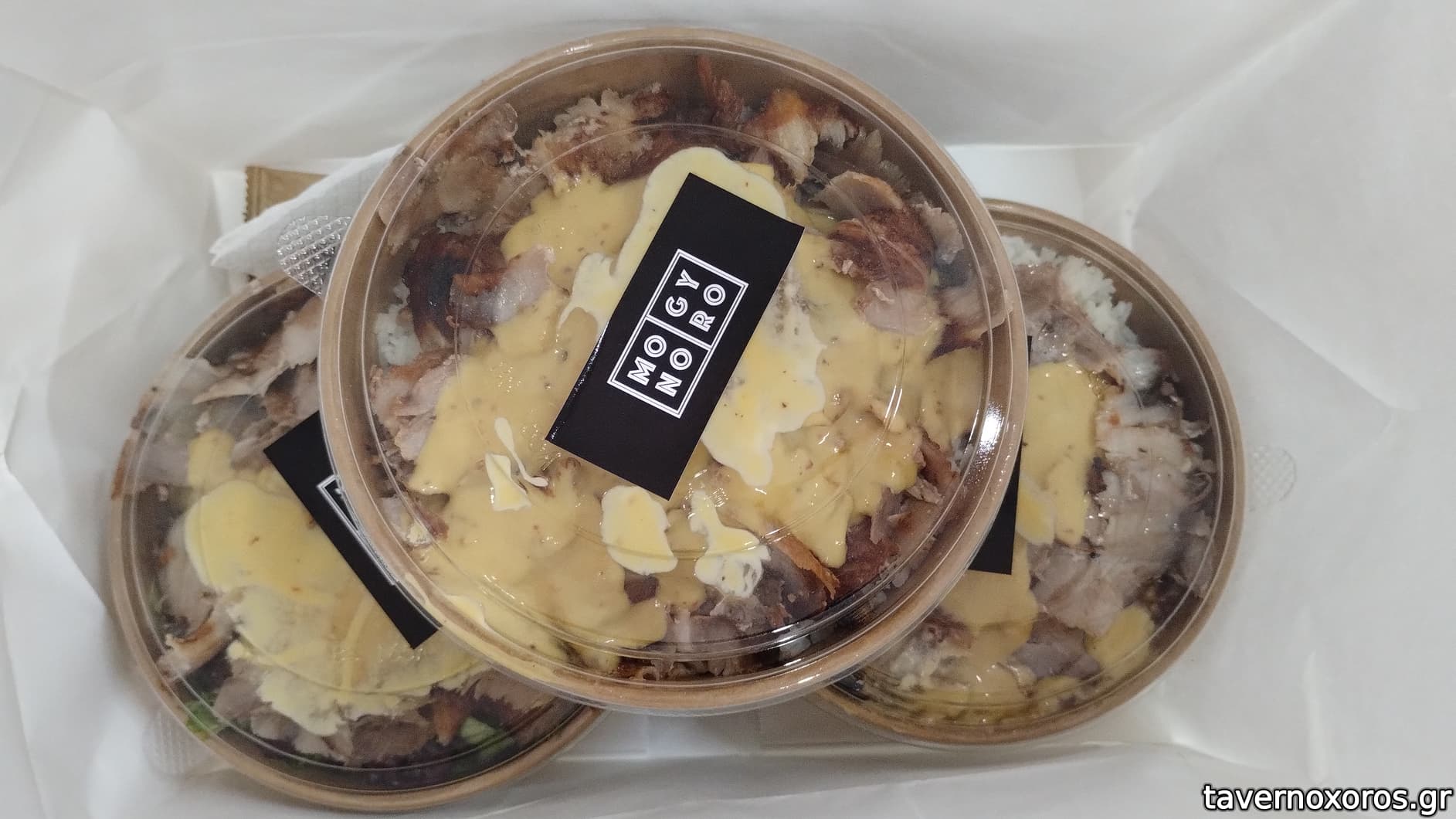Πήραμε μπωλ με ρύζι και χοιρινό γύρο. Μπορείς να προσθέσεις σως και επίσης σαλάτα, όποια θες (είχε 4 πολύ ελκυστικές), χωρίς επιπλέον χρέωση. Εμείς διαλέξαμε σως μουστάρδα με μέλι, που τελικά ήταν λίγο άκυρη με το ρύζι (δεν μού πάνε μαζί).