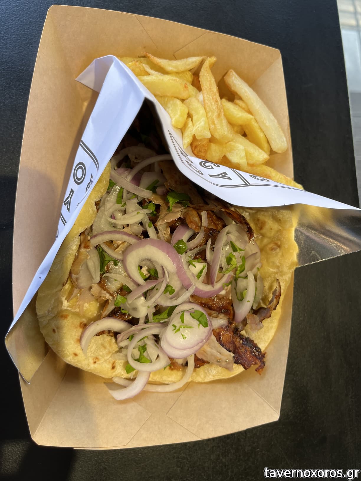 Ψωμάκι με γύρο χοιρινο (τεράστιο) και οι πατάτες on the side (δυνατό)