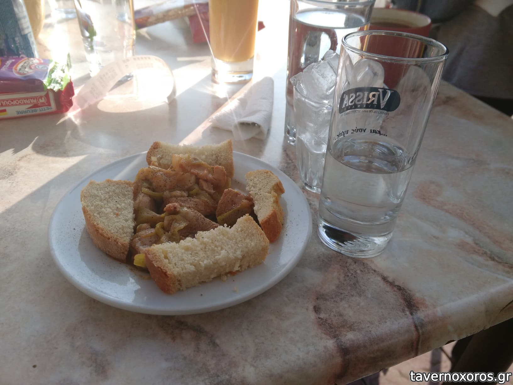 Μεζέδες: κοτόπουλο (οκ) & χοιρινό με πράσο (καλό) & αντζούγιες (κλασικής κονσέρβας)