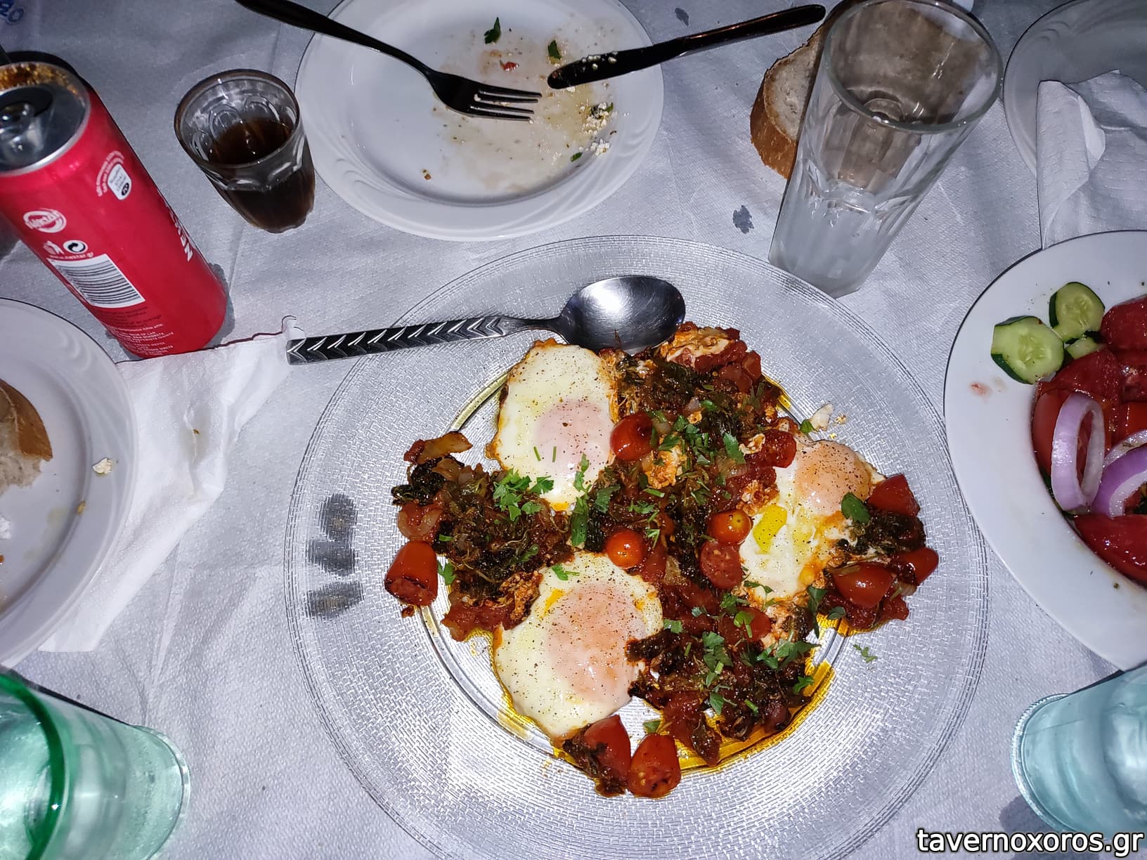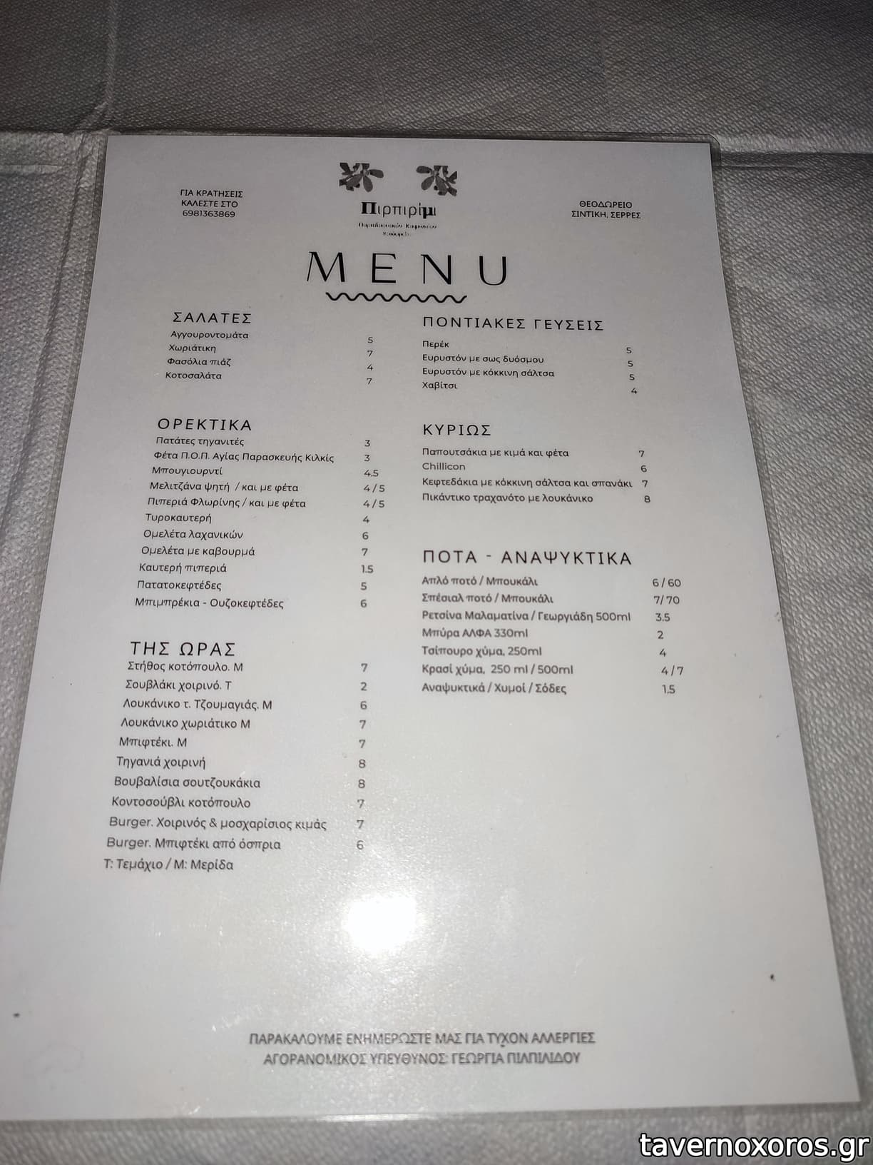 Πήραμε ψητή πιπεριά Φλωρίνης με φέτα, πολύ καλό το τυρί και άφθονος ο μαϊντανός. Αγγουροντομάτα με ορίτζιναλ χωραφίσια ντομάτα. Πατάτες τηγανιτές χεράτες άριστα τηγανισμένες. Βλήτα με σάλτσα ντομάτας, ντοματίνια και αυγά μάτια ωραιότατα αν και λίγο βαριά, ήταν πιάτο εκτός μενού και μας το πρότειναν. Από κυρίως πιάτα επιλέξαμε το chillicon που είναι η δική τους εκδοχή του chilli con carne με άσπρα φασόλια, κιμά ολίγον καυτερό. Πολύ καλό. Επίσης πικάντικο τραχανότο με λουκάνικο, ωραιότατο με μια πινελιά που μου θύμισε χριστουγεννιάτικο γιορτινό φαγητό (ίσως κουκουνάρι), πολύ καλό κι αυτό. Επίσης πολύ καλοί οι ουζοκεφτέδες (μπιμπρέκια) με έντονο το στοιχείο του ούζου στη γεύση. Η σως ήταν γιαούρτι με άνηθο, κάτι σαν τζατζίκι χωρίς σκόρδο, ταίριαζε. Σωστά ψημένο κοντοσούβλι κοτόπουλο με πατατοσαλάτα, λίγο άκυρη για τα γούστα μου η συνοδευτική σως μαγιονέζας/κέτσαπ. Τέλος, πολύ ωραίο το ψωμί που σερβίρουν.
