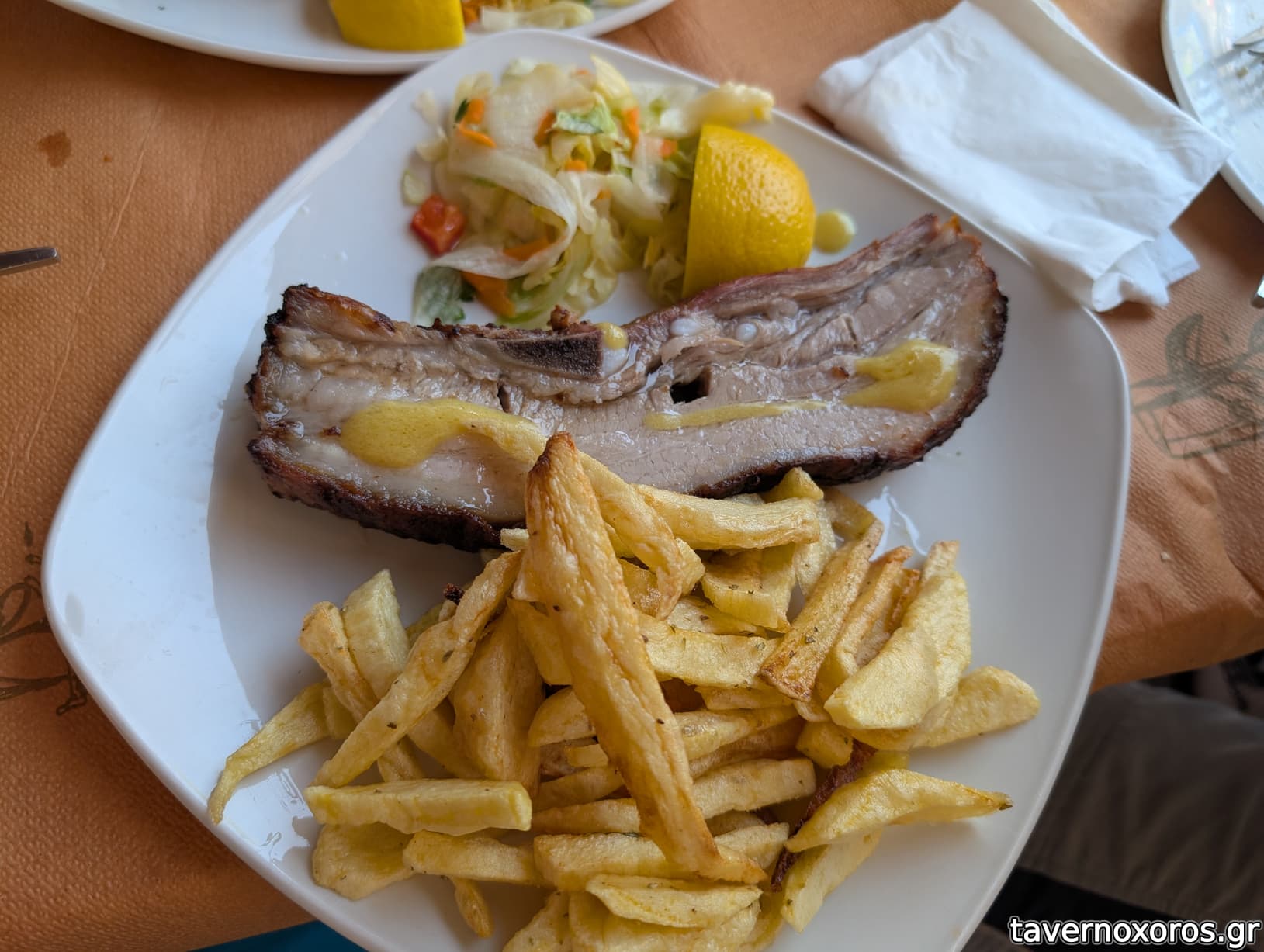 Μέσα στη μερίδα είχε πατάτα χεράτη πολύ καλή και γαρνιτούρα κανονική Πολίτικη (βουτηγμένη στο λάδι καί με πιπεριά Φλωρίνης και σέλινο) και όχι το κλασικό λάχανο/καρότο -πεθαμενα