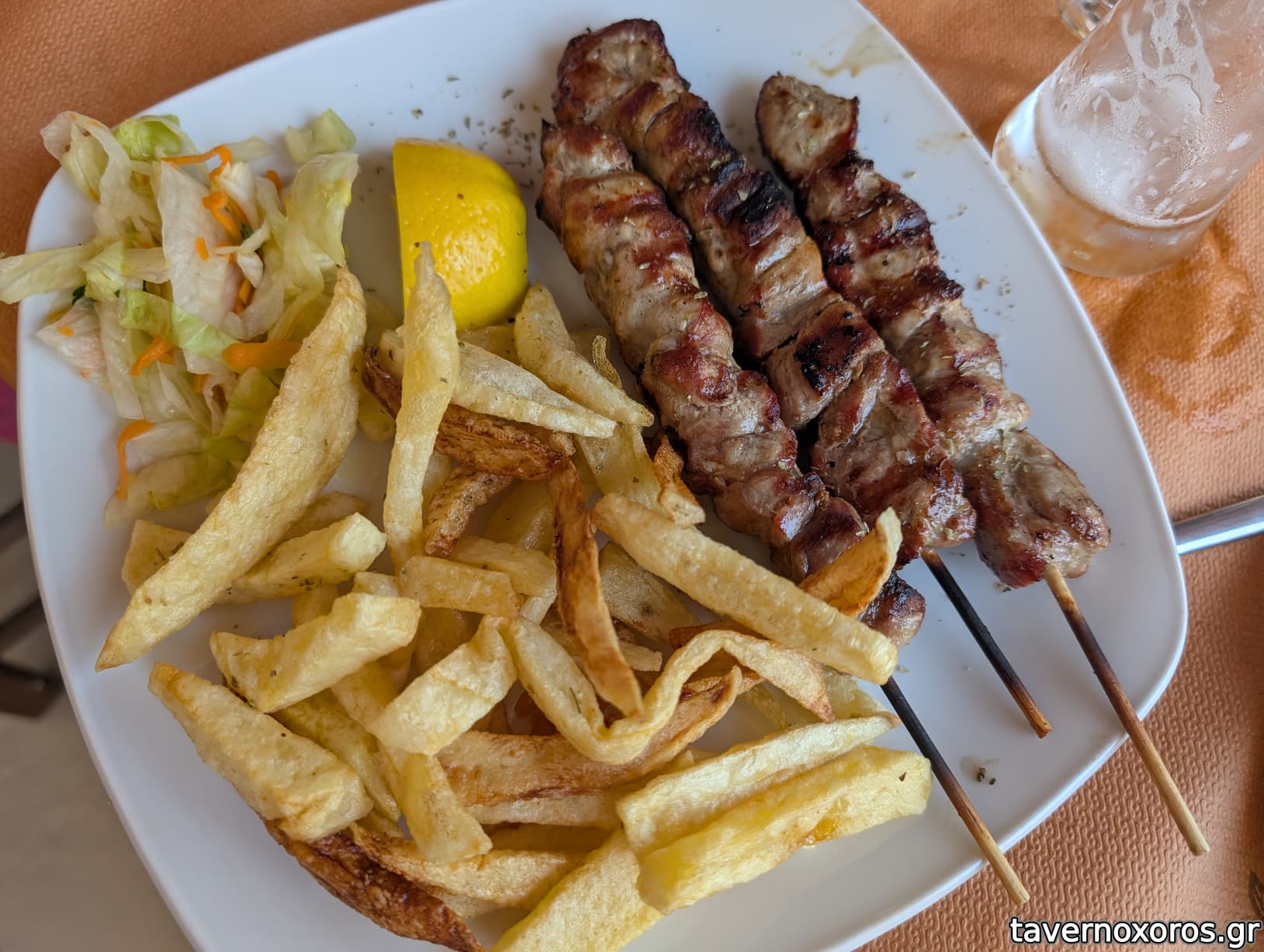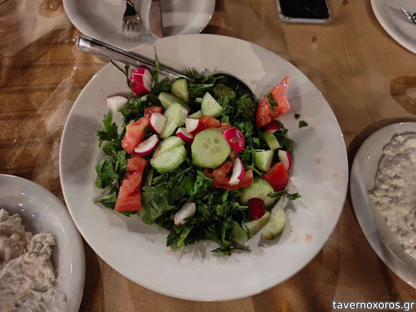 Οι σαλάτες σε γενικές γραμμές ήταν τυπικές, τίποτα θεαματικό, τίποτα κακό. Τζατζίκι και χτυπητή καλούτσικα, η χτυπητή υπερτερούσε. Οι μερίδες είχαν σαν συνοδεία πατάτες τηγανητές οι οποίες ήταν μέτριες προς καλές.