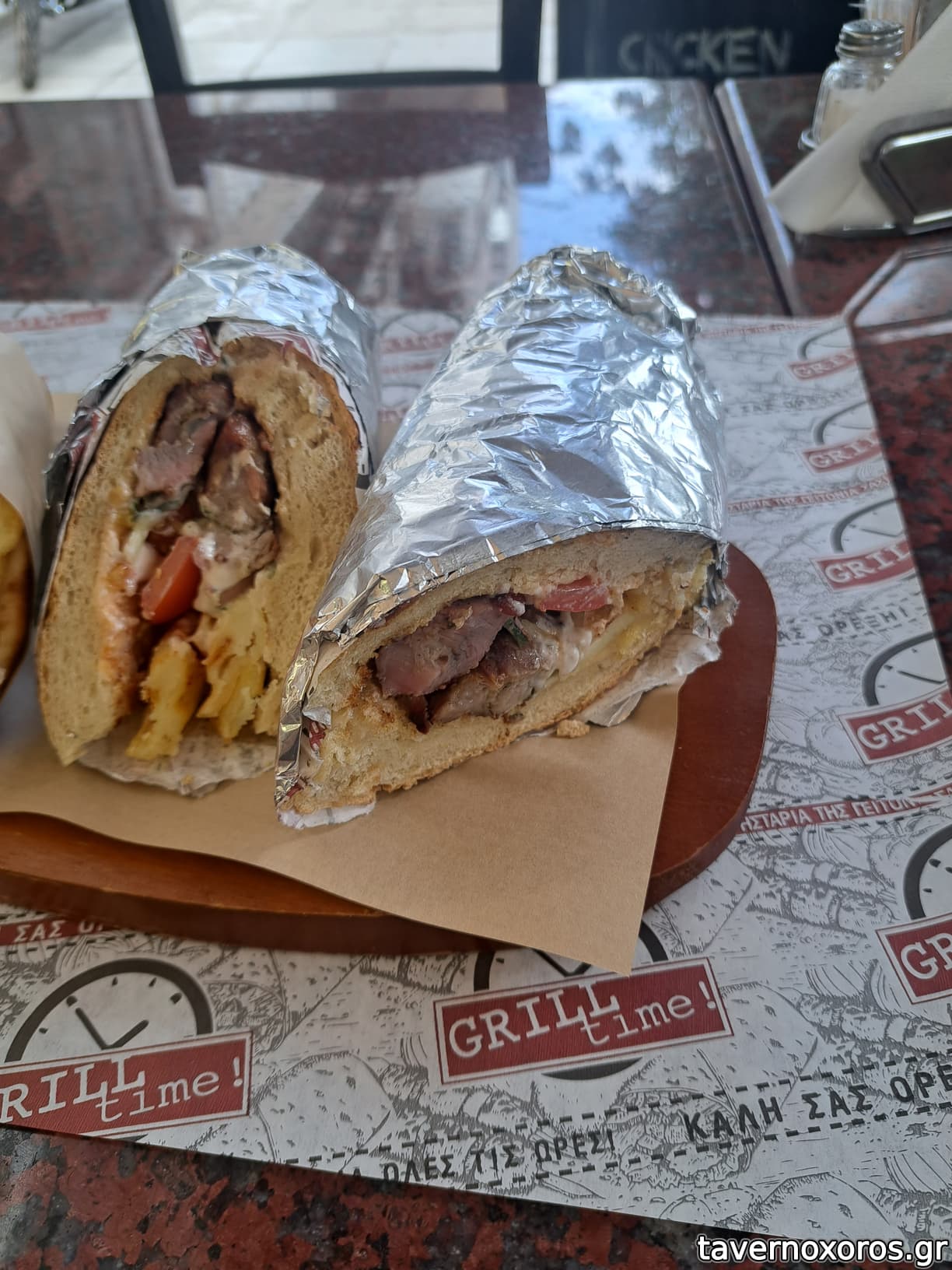 Πίτα γύρο τυποποιημένη με προκάτ πατάτα (3 ευρώ). Καλύτερη κατασταση στο ψημένο ψωμάκι με χοιρινό "καλαμάκι" αν και για το τεράστιο μέγεθος του θα μπορούσε να έχει μέσα περισσότερο κρέας (6 ευρώ).