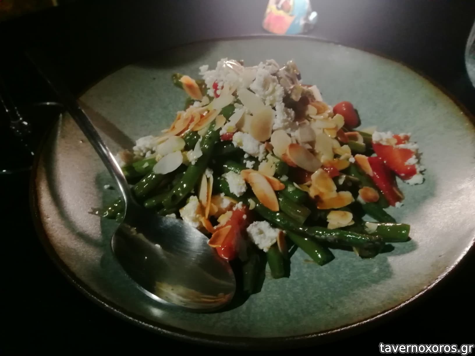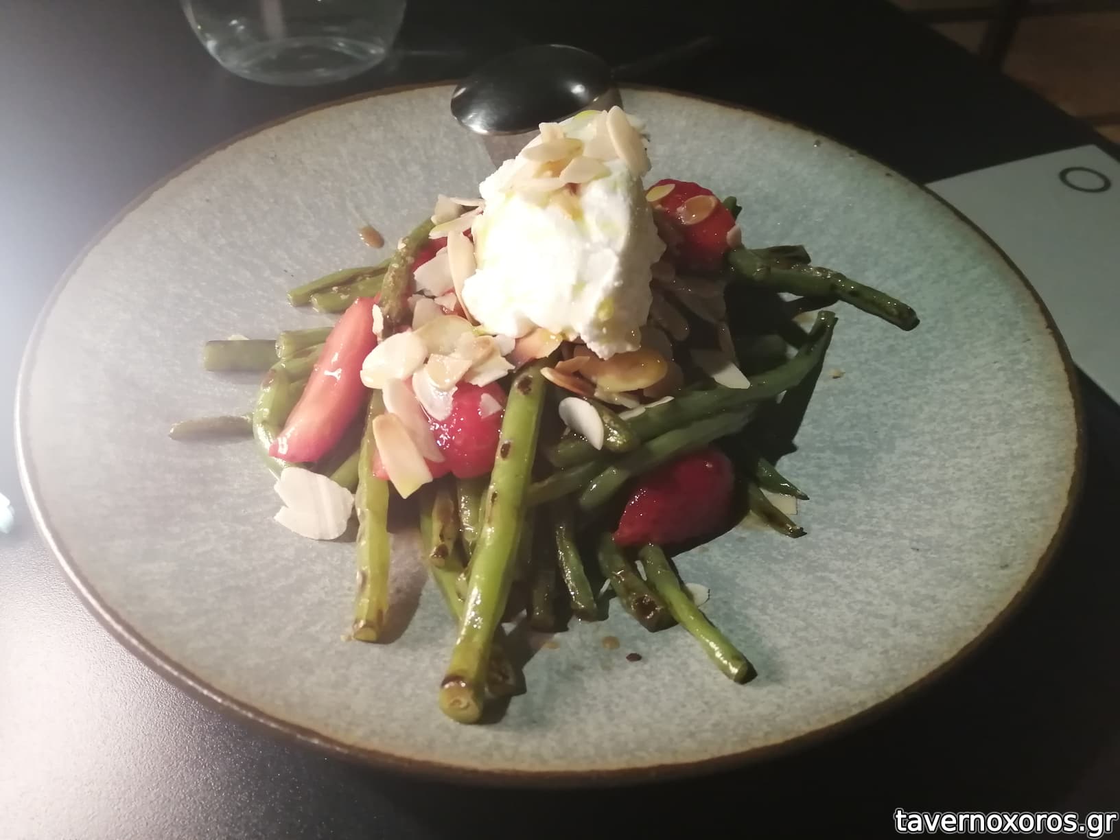Ψητά φασολάκια / ντρέσινγκ βαλσάμικο / φράουλες / ψητό αμύγδαλο (13€, πολύ καλά)