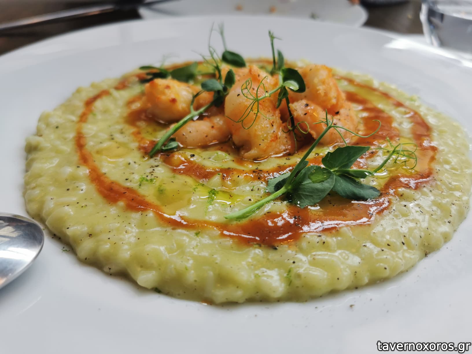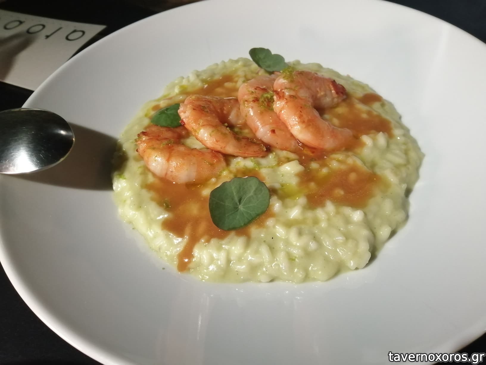 Ριζότο / κολοκύθι / κρέμα βασιλικού / γαρίδες / μαρμελάδα λεμόνι / μπισκ (16€, πολύ καλό, τρυφερότατες οι γαρίδες)