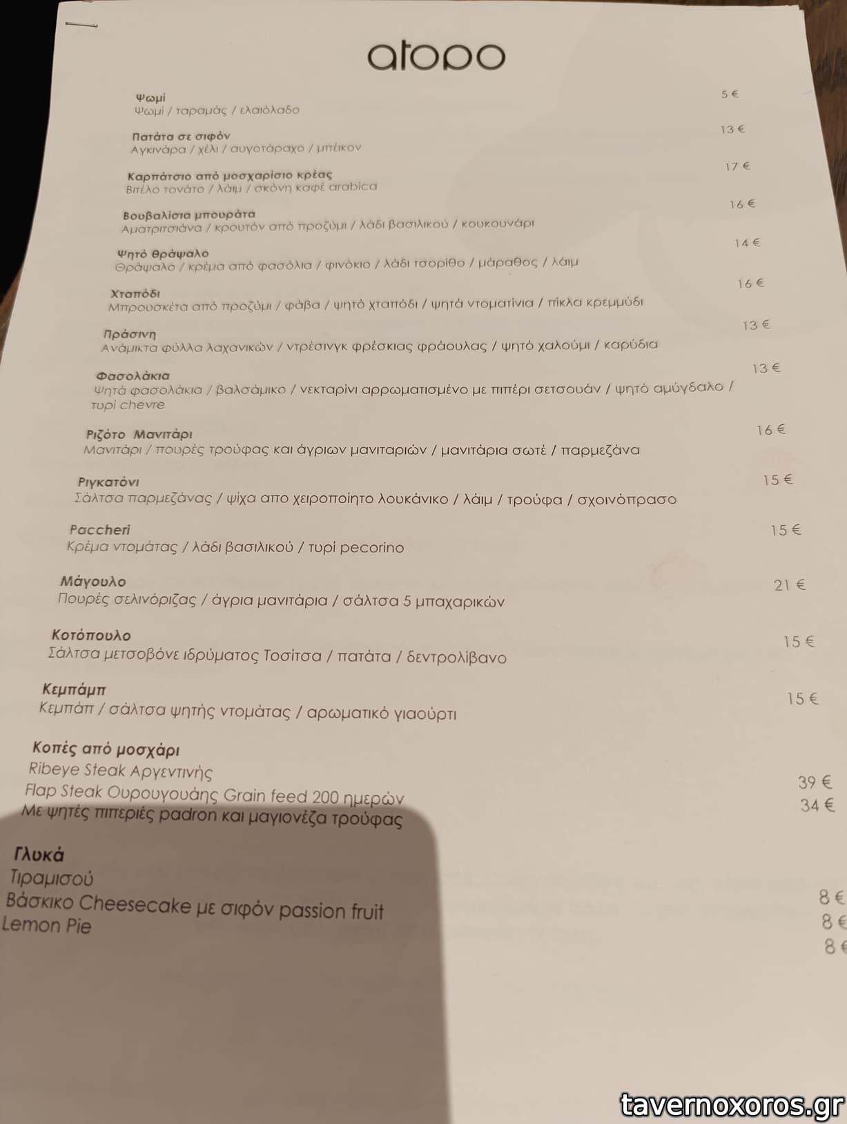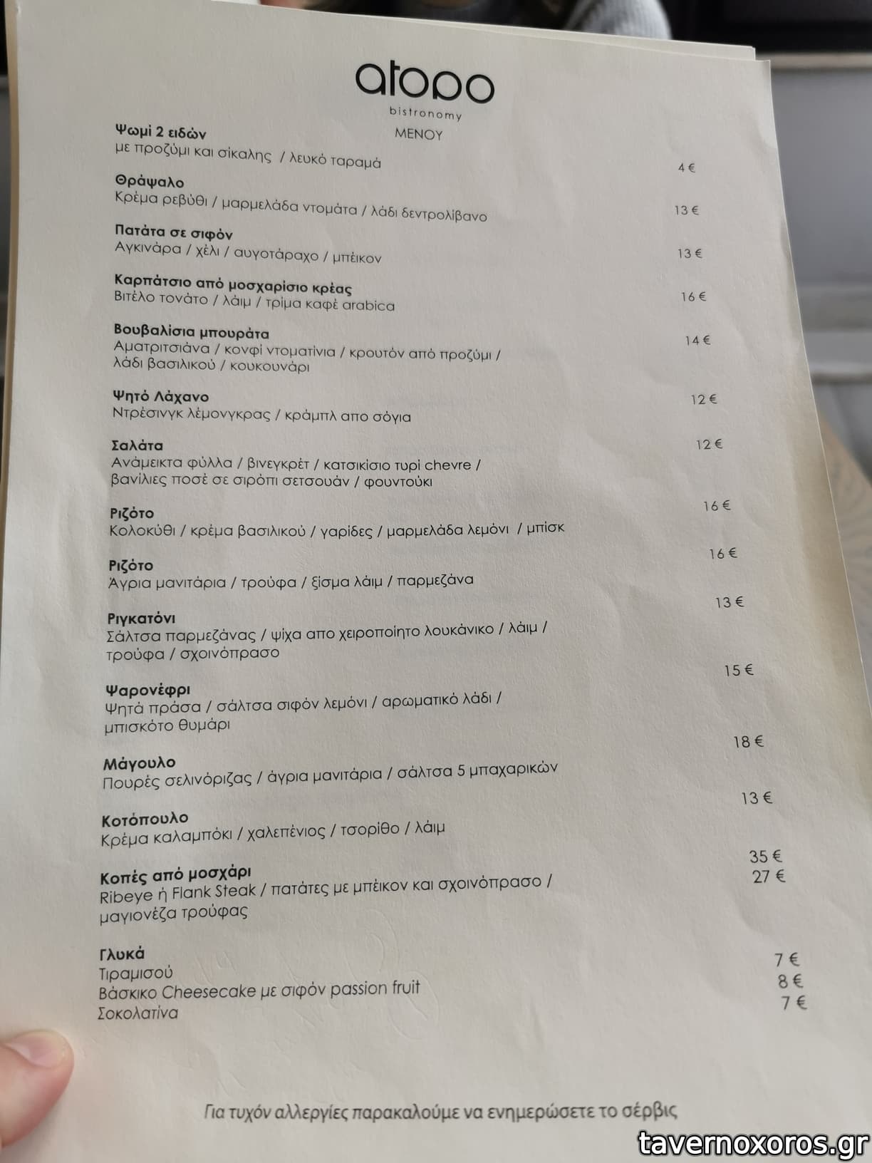 "Κρέμα πατάτας/αγκινάρα/καπνιστό χέλι/αυγοτάραχο/κράμπλ μπέηκον" (νόστιμο, ενδιαφέρον)