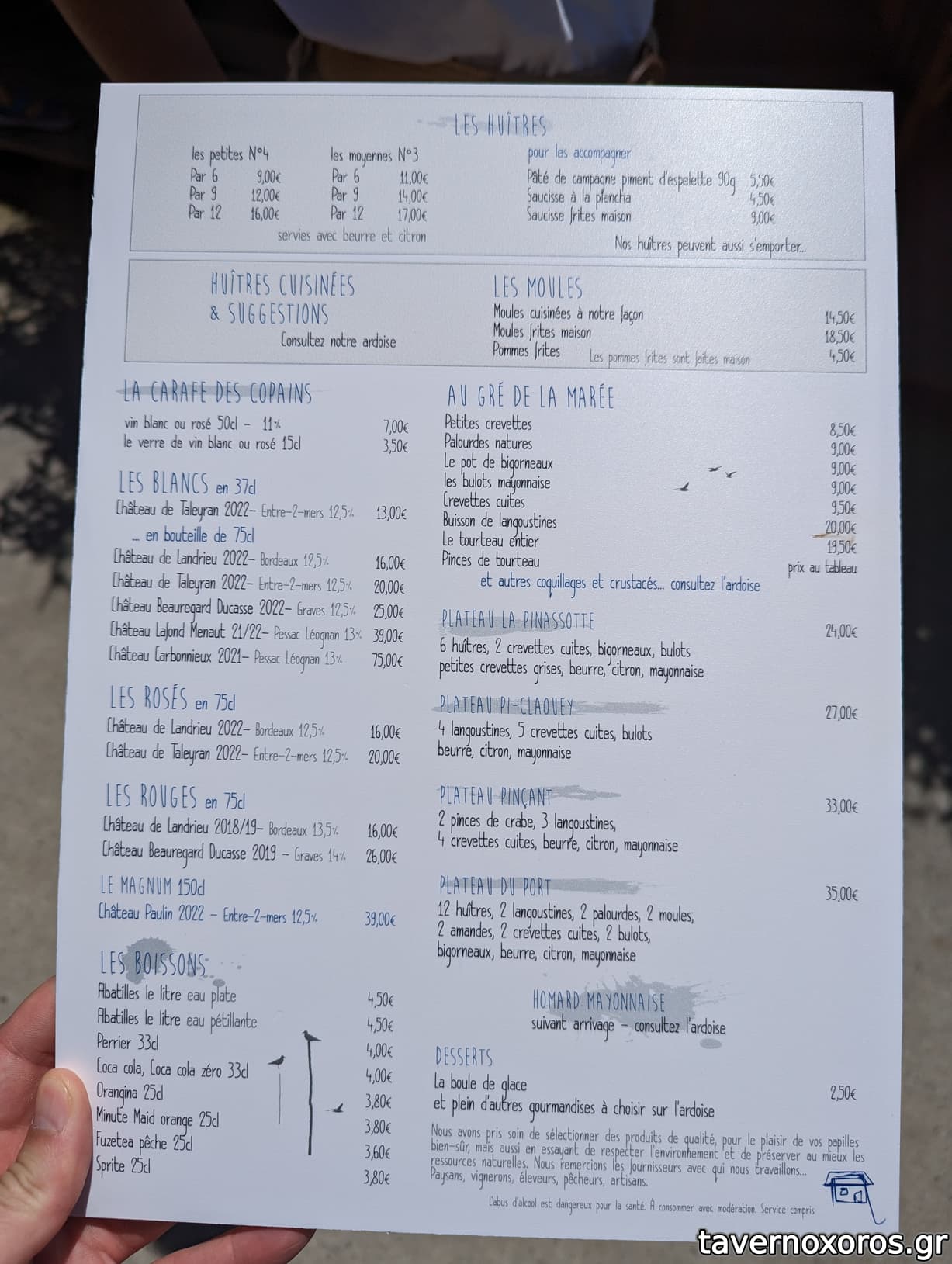 Ένα από τα πολλά στρειδάδικα του Cap Ferret, ένα ακρωτήρι/θέρετρο που φημίζεται για τα στρείδια του. Αυτό έχει ευχάριστη όψη προς τον κόλπο του Arcachon. Μικροσκοπικός κατάλογος, επέλεξα τα πολυαγαπημένα μου moules frites (δλδ μύδια με τηγανητές πατάτες που βουτάς μέσα στα ζουμιά του) πράγμα που ήξερα ότι ήταν ερασιτεχνικό γιατί στην περιοχή δεν παίζουν μύδια, αλλά τα είχα όρεξη. Τελικά μετριοκαλά, ούτε απογοήτευσε, ούτε ενθουσίασε. Επόμενη φορά θα δοκίμαζα αλλού.