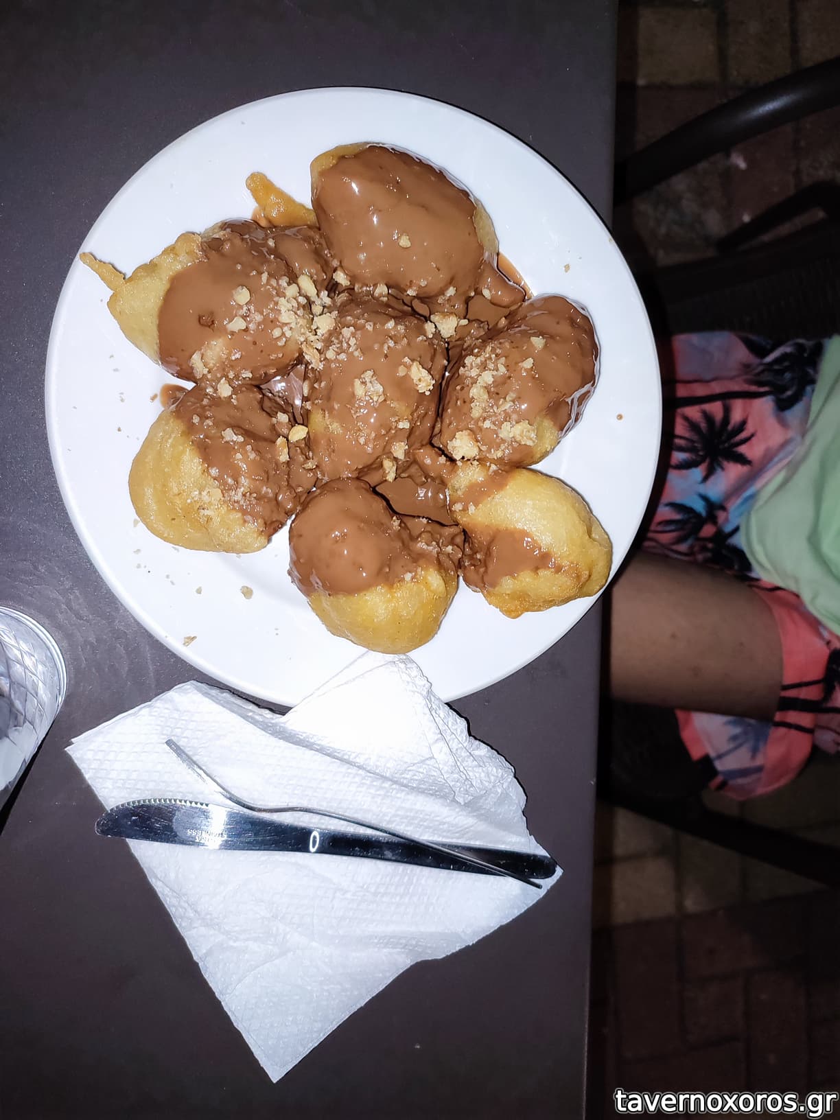 Το επισκεφθήκαμε και βραδάκι τόσο για τους λουκουμάδες όσο και για το τσίπουρο με μεζέ. Το τσίπουρο παραγωγής τους (επιλέξαμε με γλυκάνισο, καλό) και ο μεζές ό,τι βγάλει η βάρκα. Ο πρώτος γύρος ήταν με χταποδάκι βραστό, μικρά τηγανιτά ψαράκια, τηγανιτό κολοκύθι και ψητές πιπεριές ενώ ο δεύτερος γύρος πάλι με κολοκυθάκι τηγανιτό, γαρίδα τηγανιτή και αγγουράκι/ντομάτα. Πήραμε και μια μερίδα λουκουμάδες με πραλίνα για τον μικρό οι οποίοι δεν ήταν σιροπιασμένοι και άρα πιο ελαφροί.