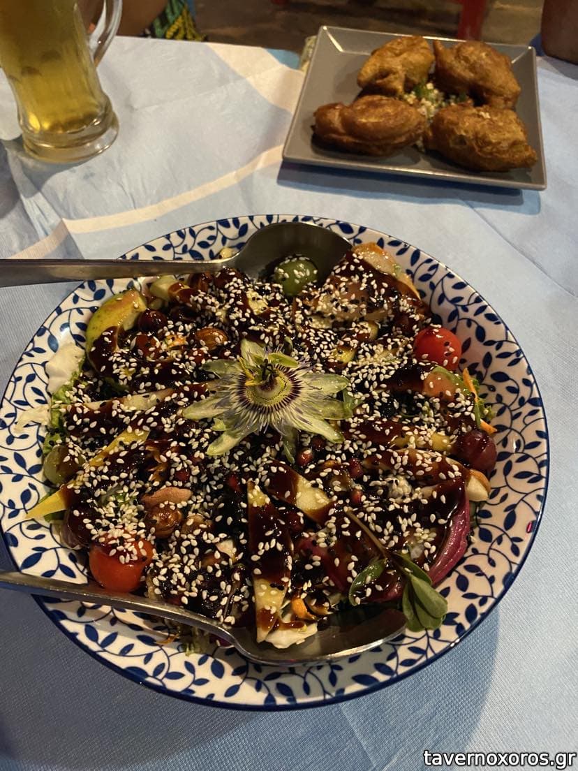 Ιδιαίτερη περίπτωση, γραφικό περιβάλλον, κρατήσεις δεν δέχονται, ωστόσο μαζεύεται πολύς κόσμος. Απόσταση από το Ρέθυμνο περίπου 20΄ οδήγηση. Πήραμε την διάσημη σαλάτα «Στρατηγός» που έχει μέσα 49 υλικά (βλ. φωτο), τα οποία τρώγονται όλα, ακόμη και τα λουλούδια της, μία μπουρέκια με μυζήθρα, μία απάκι τηγανητό, μία πανσέτες χοιρινές, μία τηγανητές πατατούλες φρέσκιες και δύο μπύρες. Τιμές φυσιολογικές.