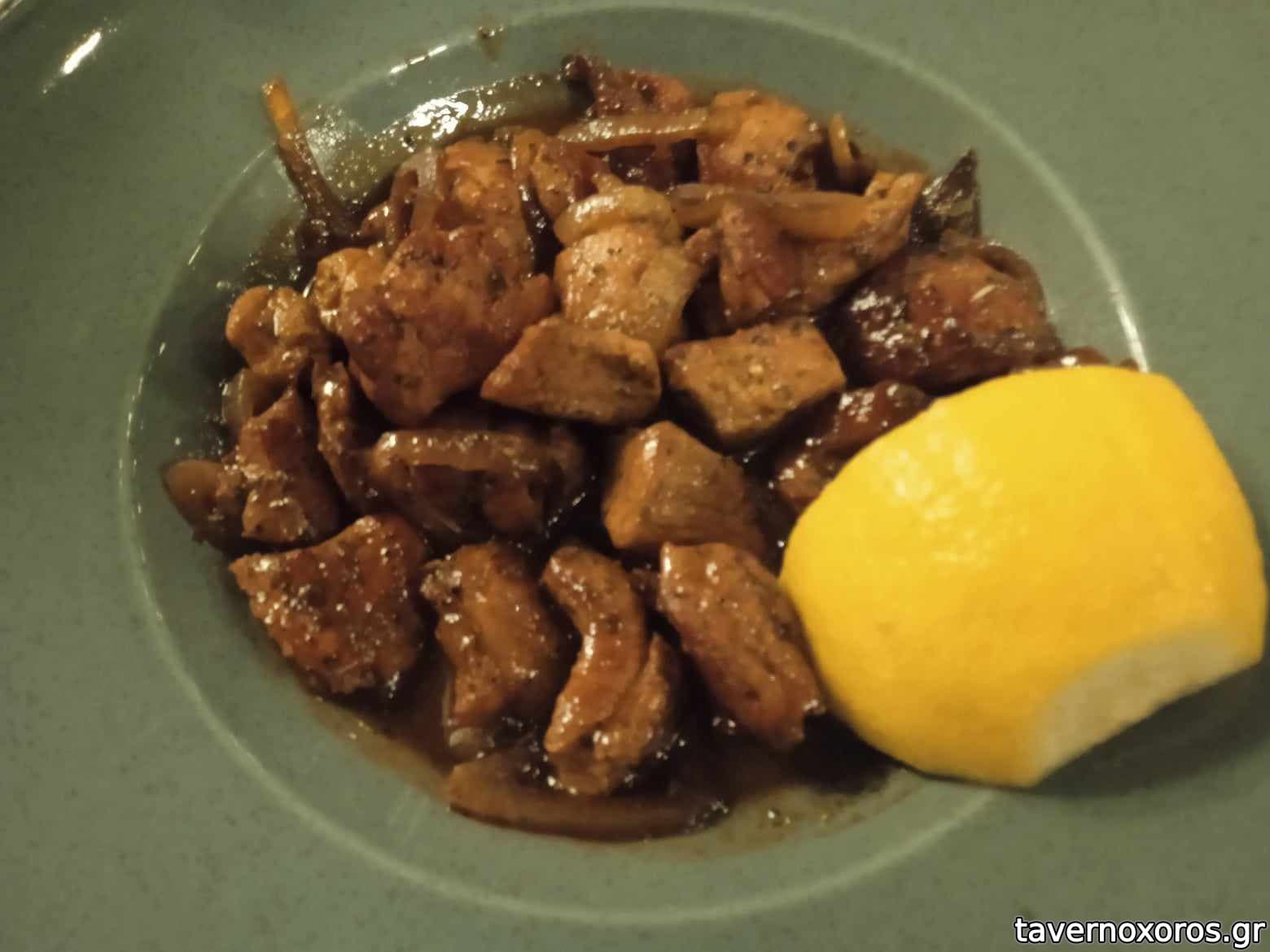 Χοιρινή τηγανιά με σάλτσα μαδέρα και καραμελωμένα κρεμμύδια