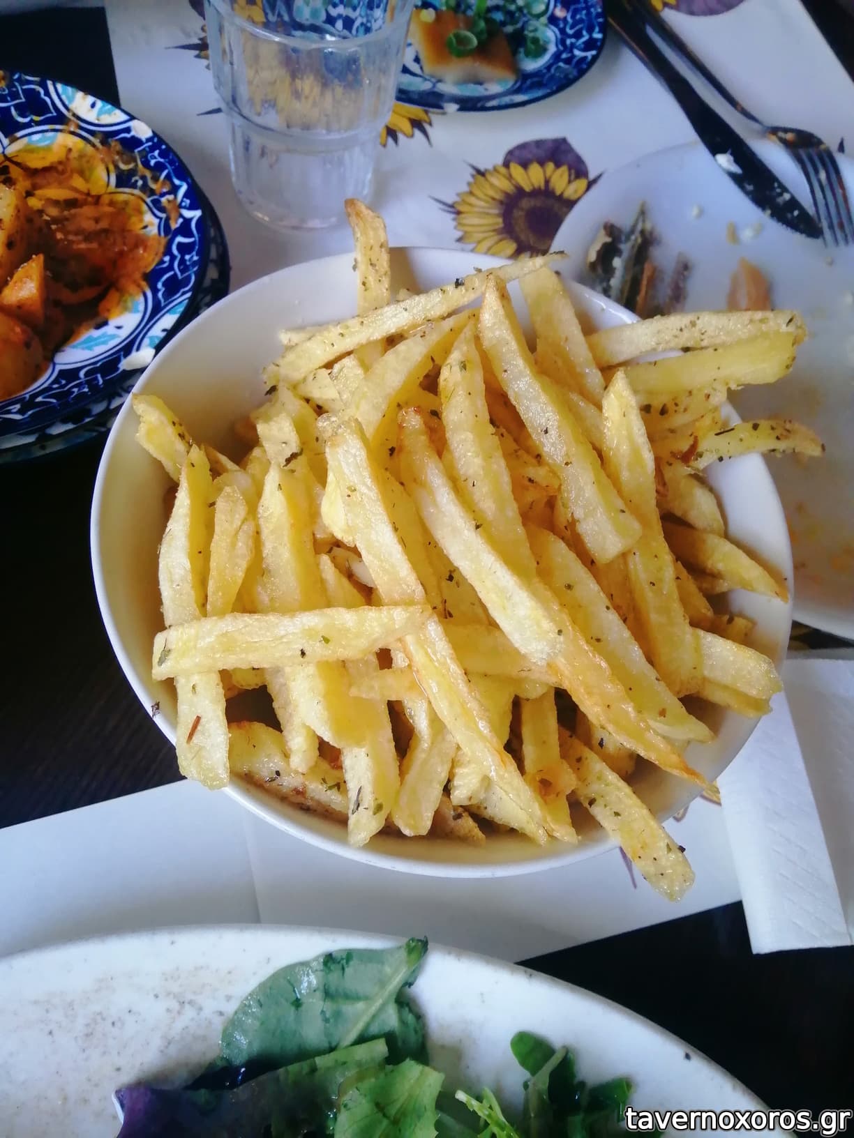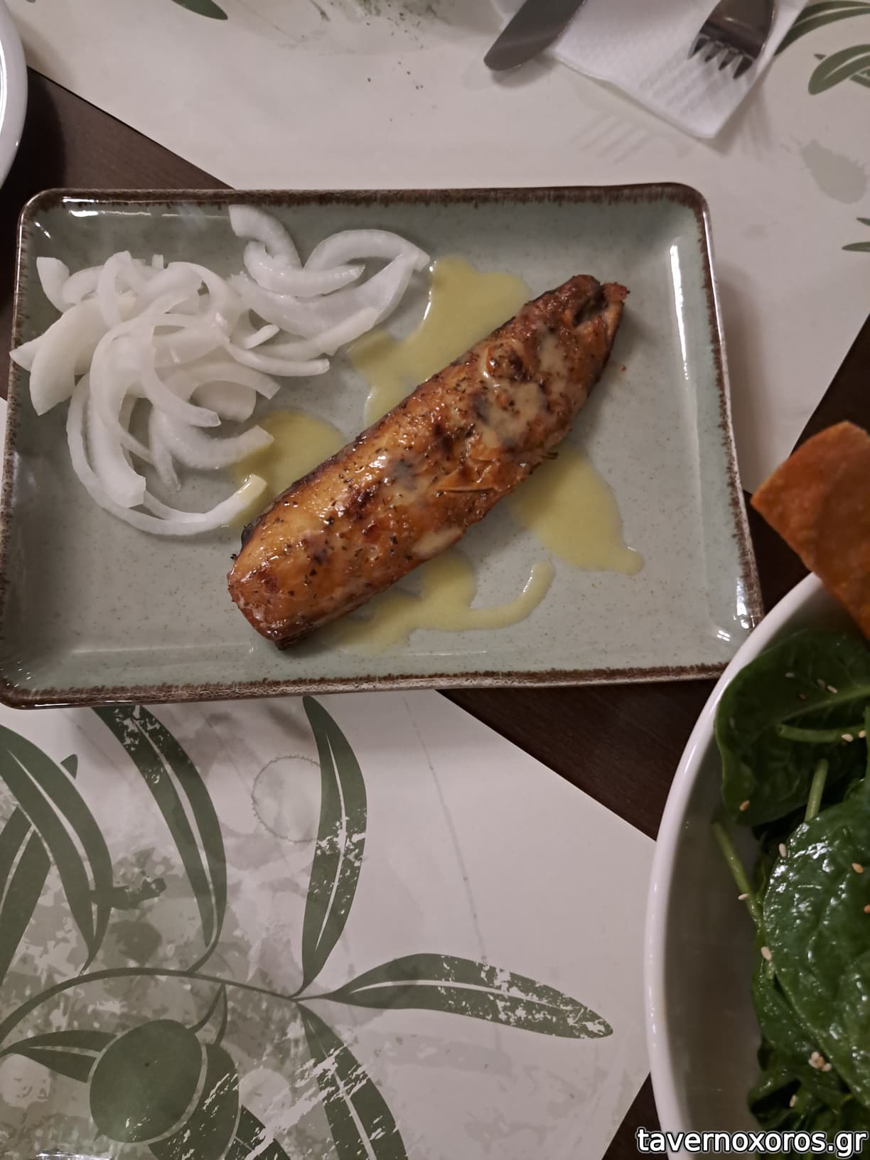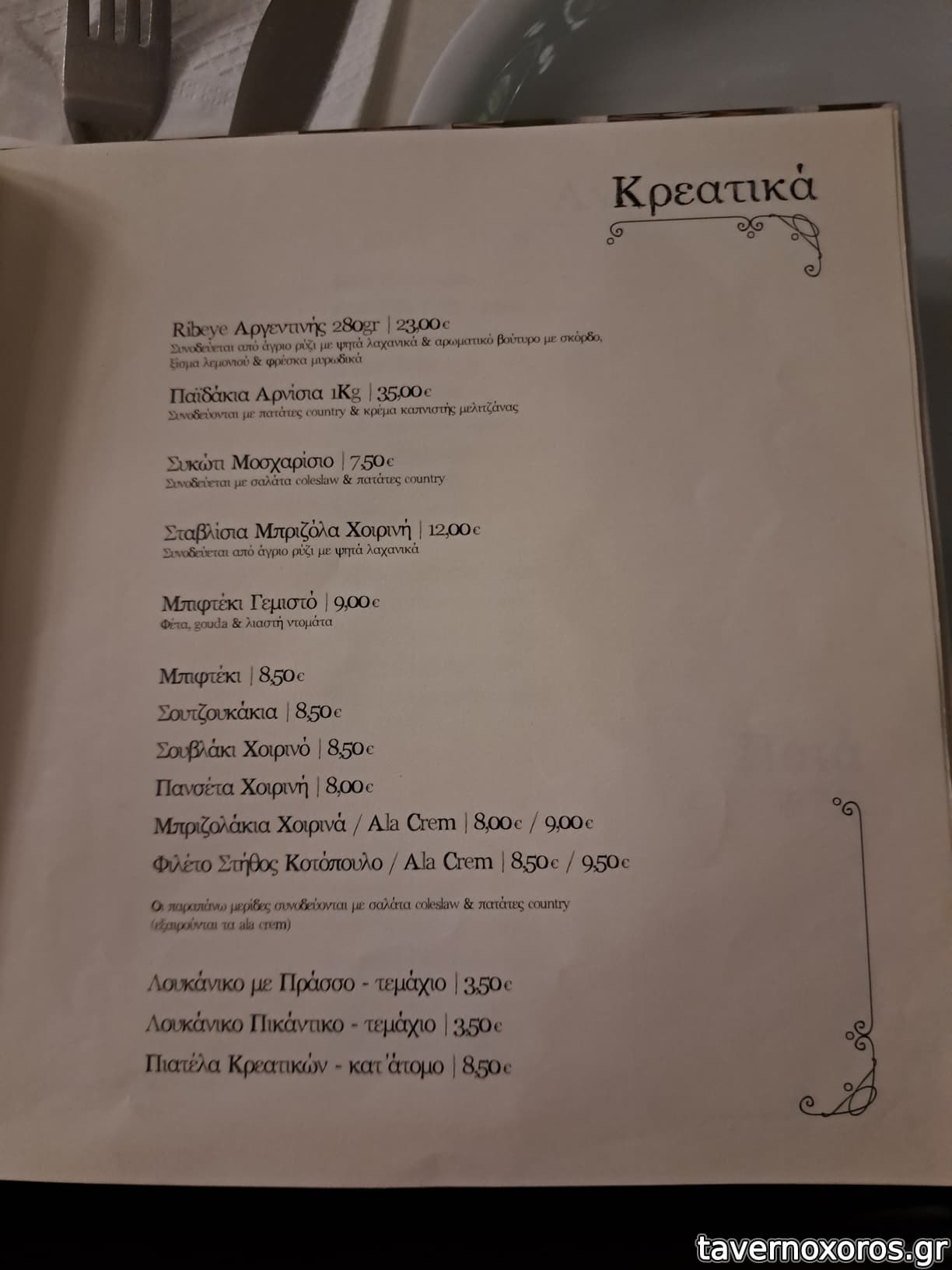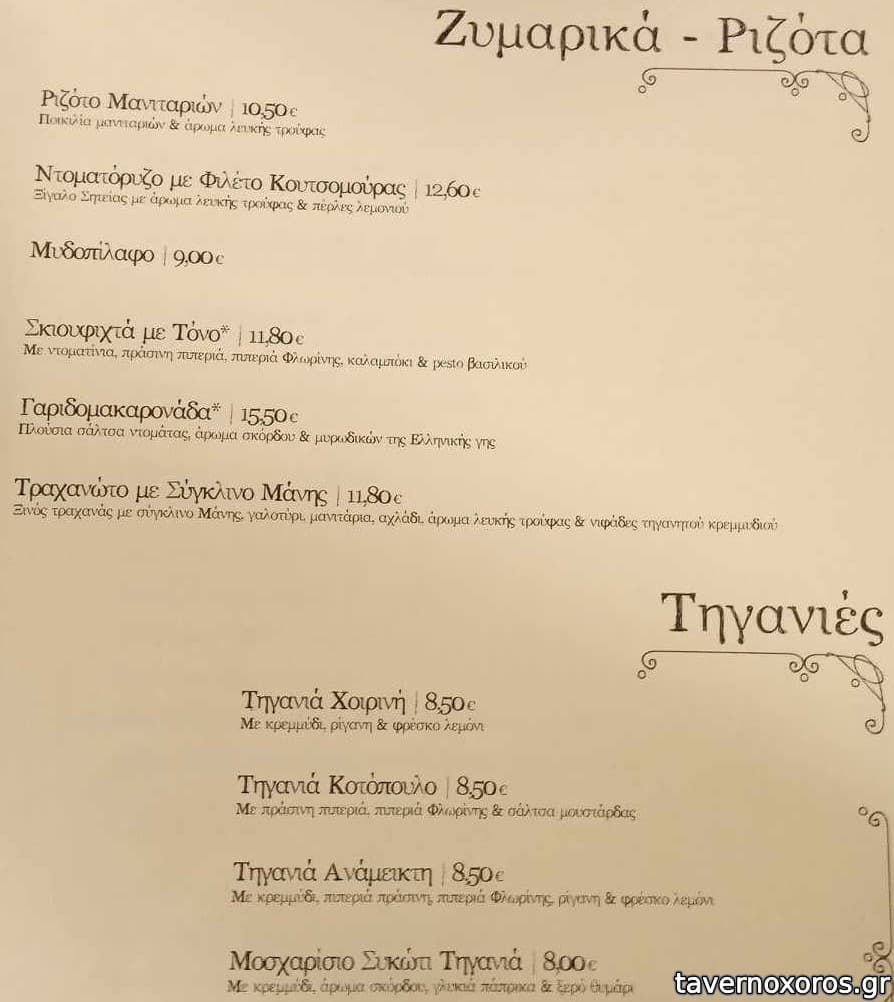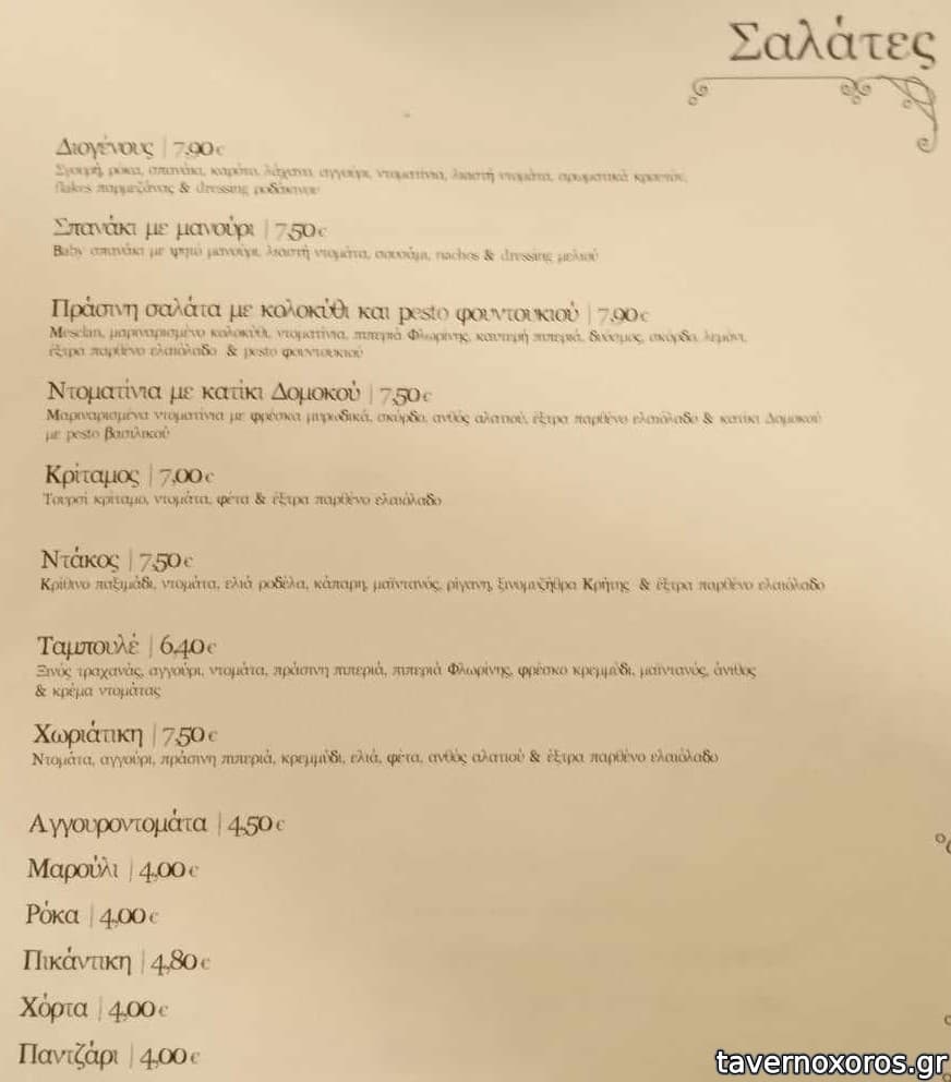 Σαλάτα σπανάκι-μανούρι, πατάτες τηγανητές, ταραμάς, σκουμπρί, κολοκυθάκια, καλαμαράκια, γεμιστό μπιφτέκι (αυτό πολύ καλό), χοιρινή τόμαχοκ. Μαζί με ρετσίνες, μπύρες, τσίπουρα στα 19 ευρώ το άτομο.