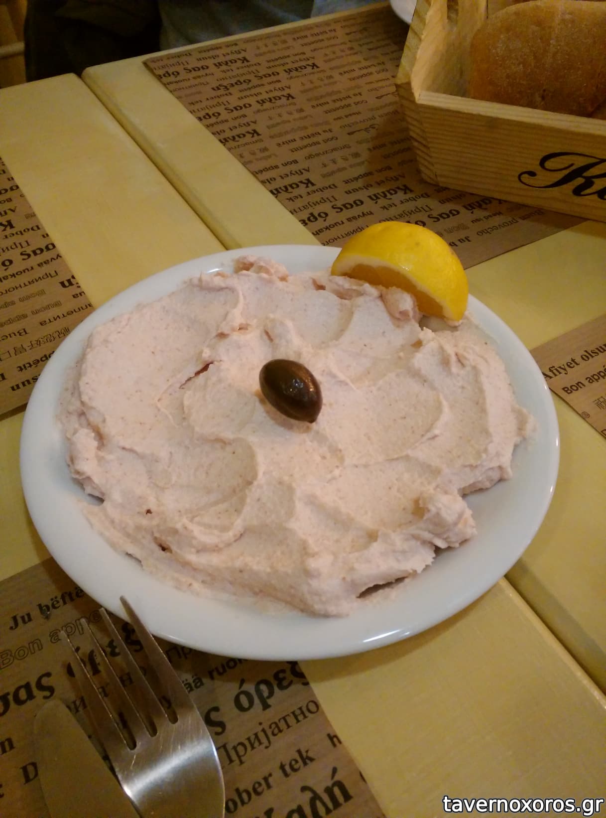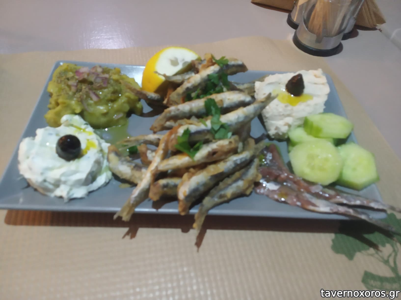 Μεζές τσίπουρου: από κάτω αριστερά τζατζίκι, φάβα και λευκός ταραμάς (πολύ καλός)