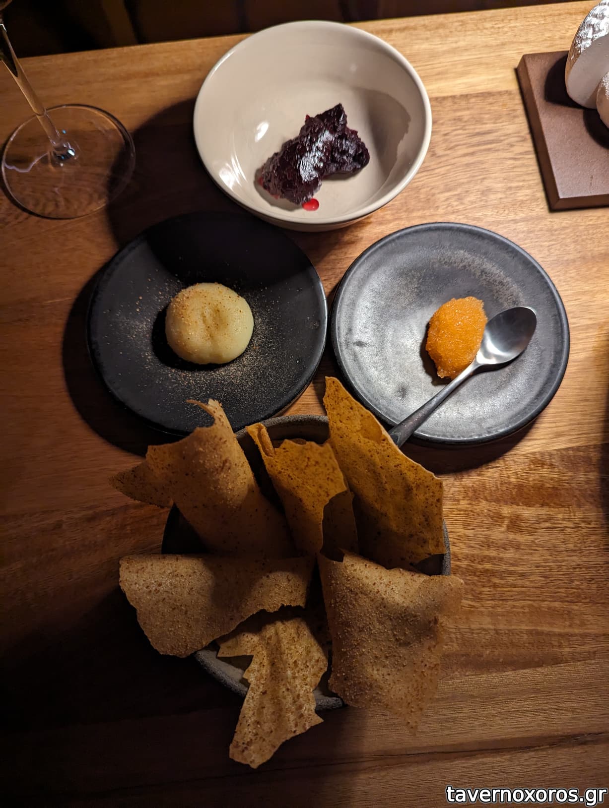 1st serving: chips (άγευστα) & πουρές πατάτας (νόστιμος) & πατζάρι (πολύ καλό) & σουηδικό χαβιάρι bleak roe (καλό)