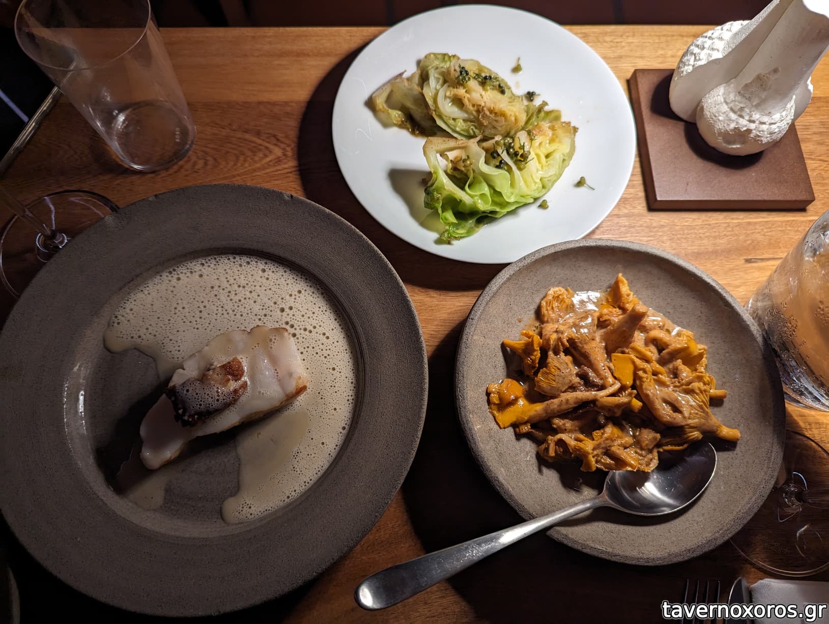 4th serving: monkfish με το συκώτι του (άγευστο το ψάρι, ουρίτσα/φανάρι που λέμε στα ελληνικά) & καμένο λάχανο (πολύ καλό, τα μικρά ramson capers που είναι σαν σκορδάτη κάπαρη εξαιρετική προσθήκη) & άγρια μανιτάρια Σουηδίας (εξαιρετικά)
