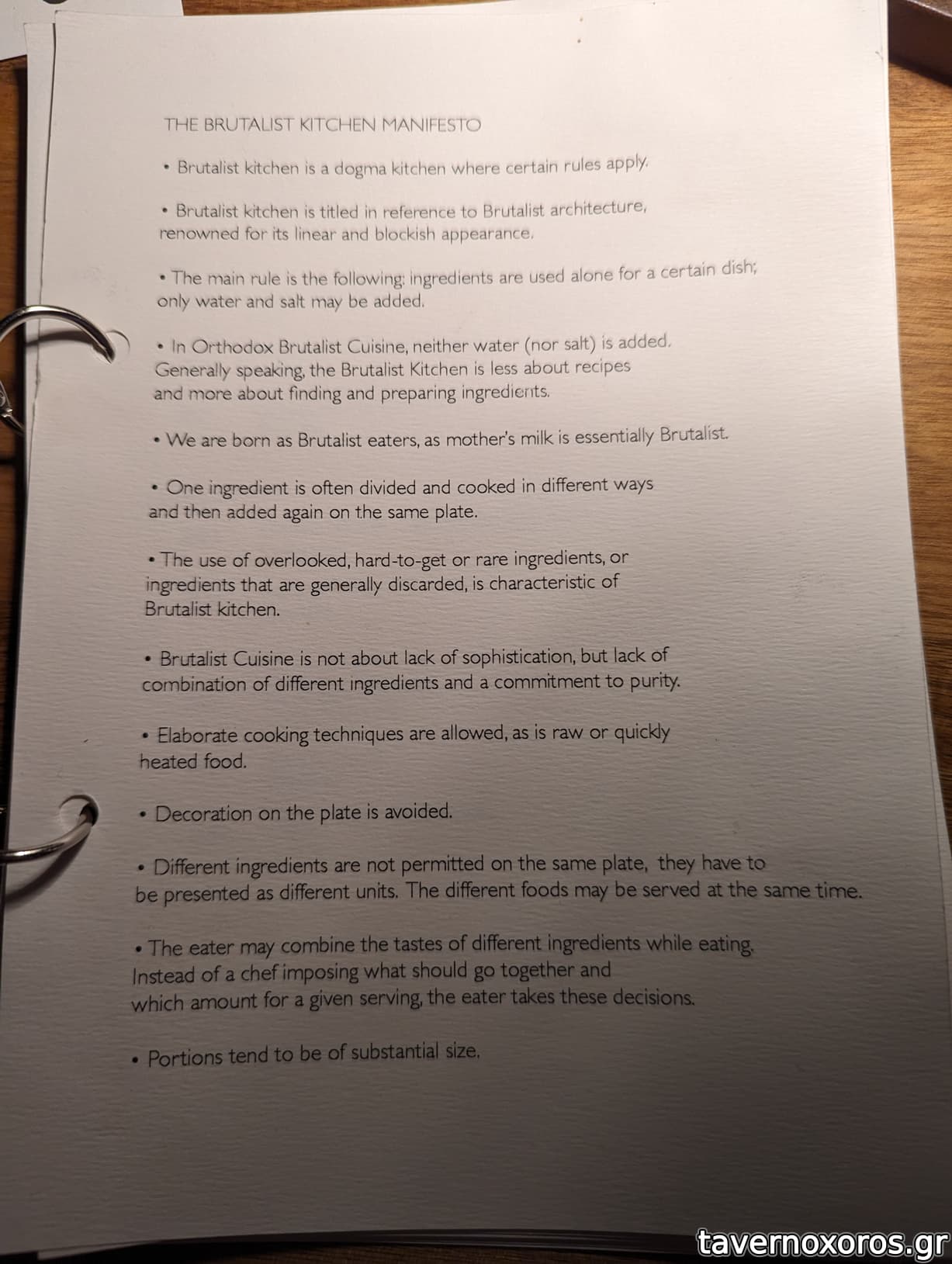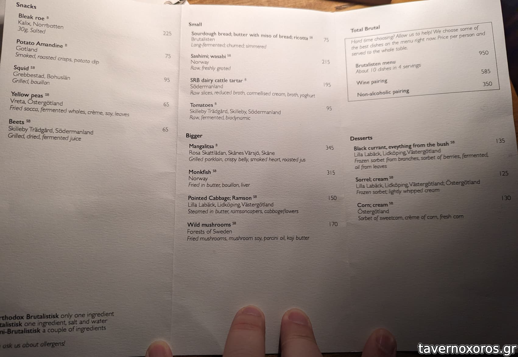 brutalisten menu" που είναι σαν να λέμε το degustation μενού τους, με 10 πιάτα στα 950SEK (82€) και το αντίστοιχο wine pairing στα 585SEK (50€). - Από το όνομα του μαγαζιού αλλά και το ντεμέκ μανιφέστο τους, είχα προσδοκίες ότι θα φάω hardcore πρώτες ύλες, σκέτες με νερό και αλάτι χωρίς συνδυασμούς. Τελικά ήταν marketing πρόλογος, δεν υπήρχε τίποτα μπρουτάλ.
