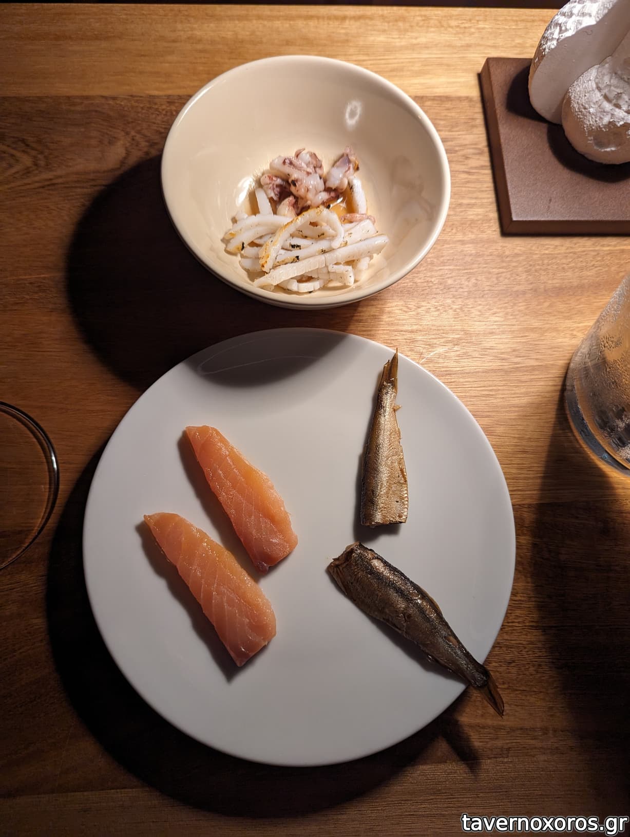 2nd serving: καπνιστός σολομός (εξαιρετικός) & ένα τοπικό ψάρι σαν σαρδέλα ελαφρώς καπνιστό (καλό) & καλαμάρι (εξαιρετικό)