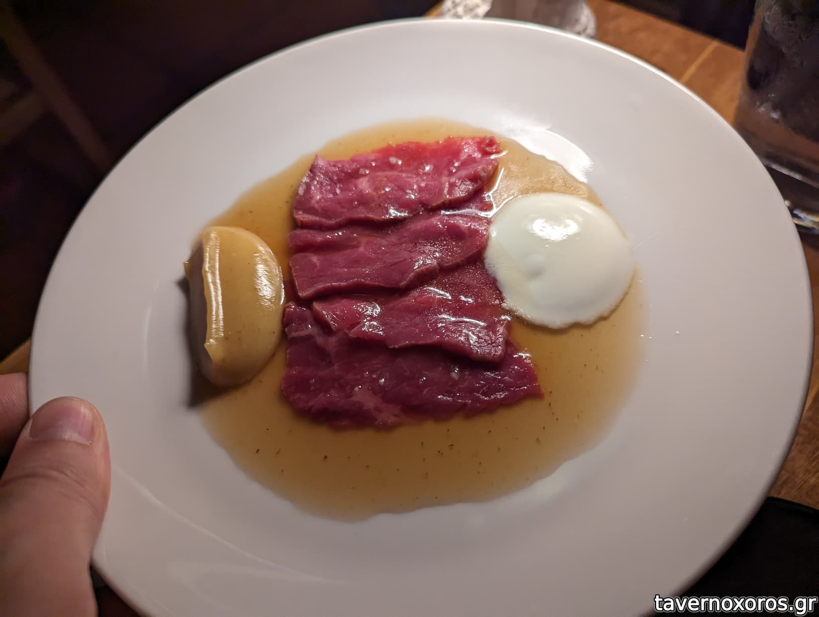 3rd serving: σουηδικό Red-and-White μοσχάρι ταρτάρ, με μια κρέμα καραμέλας και γιαούρτι (τέλειο!!)