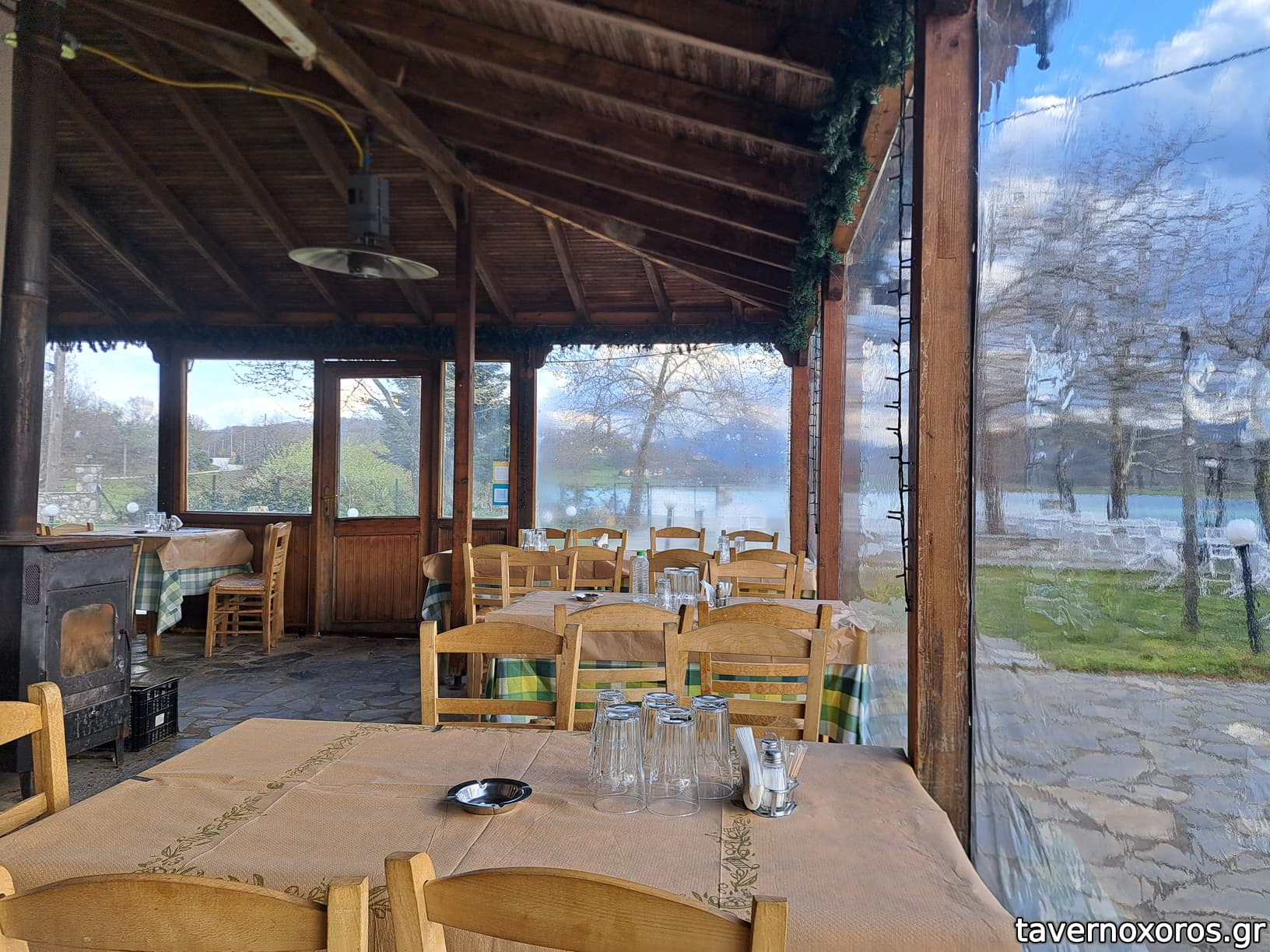 Πολύ ωραία τοποθεσία δίπλα στη λίμνη και με θέα τα Άγραφα. Τεράστιος και ο εσωτερικός χώρος με το τζάκι.