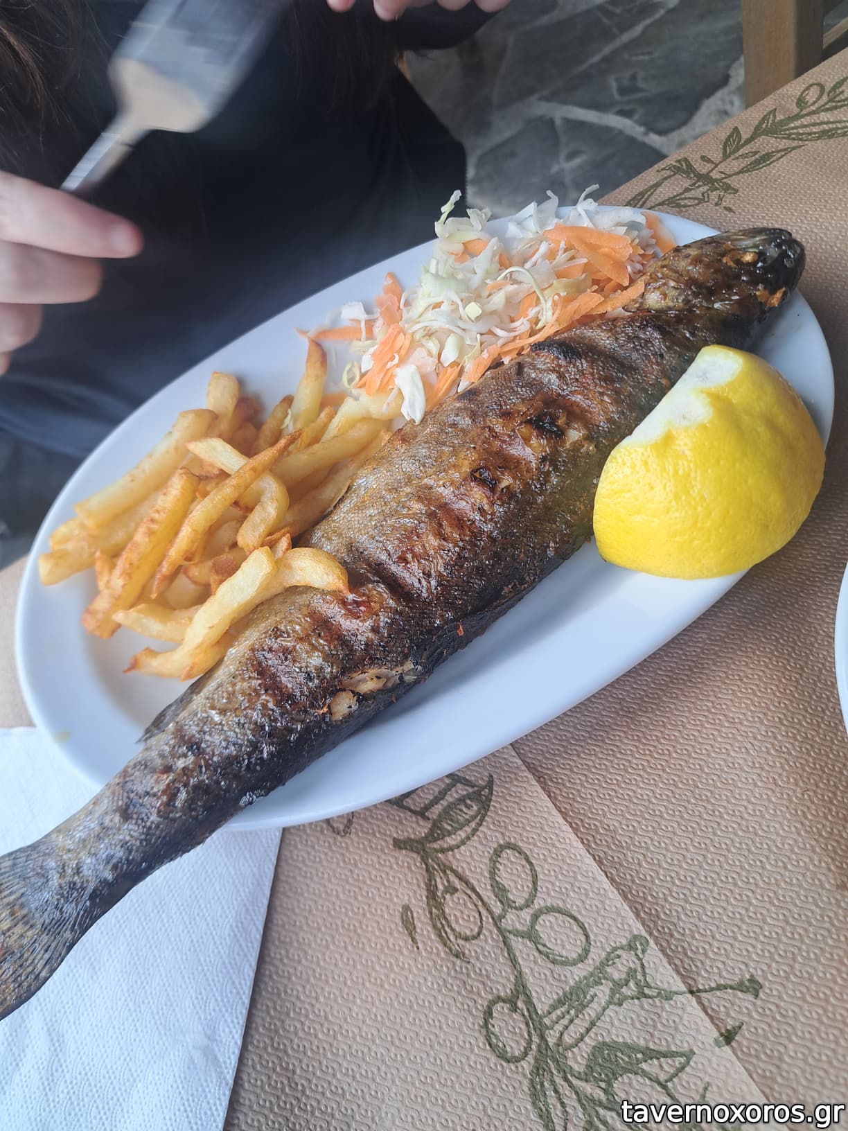Πέστροφα καλή, θα την ήθελα ελαφρώς λιγότερο ψημένη.