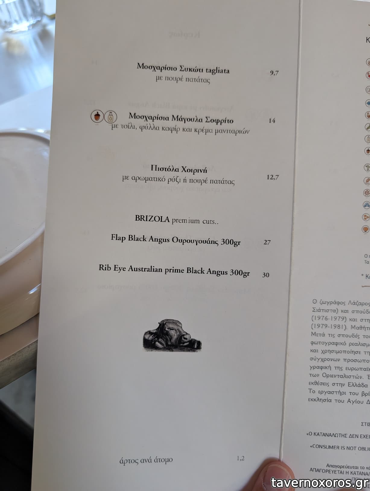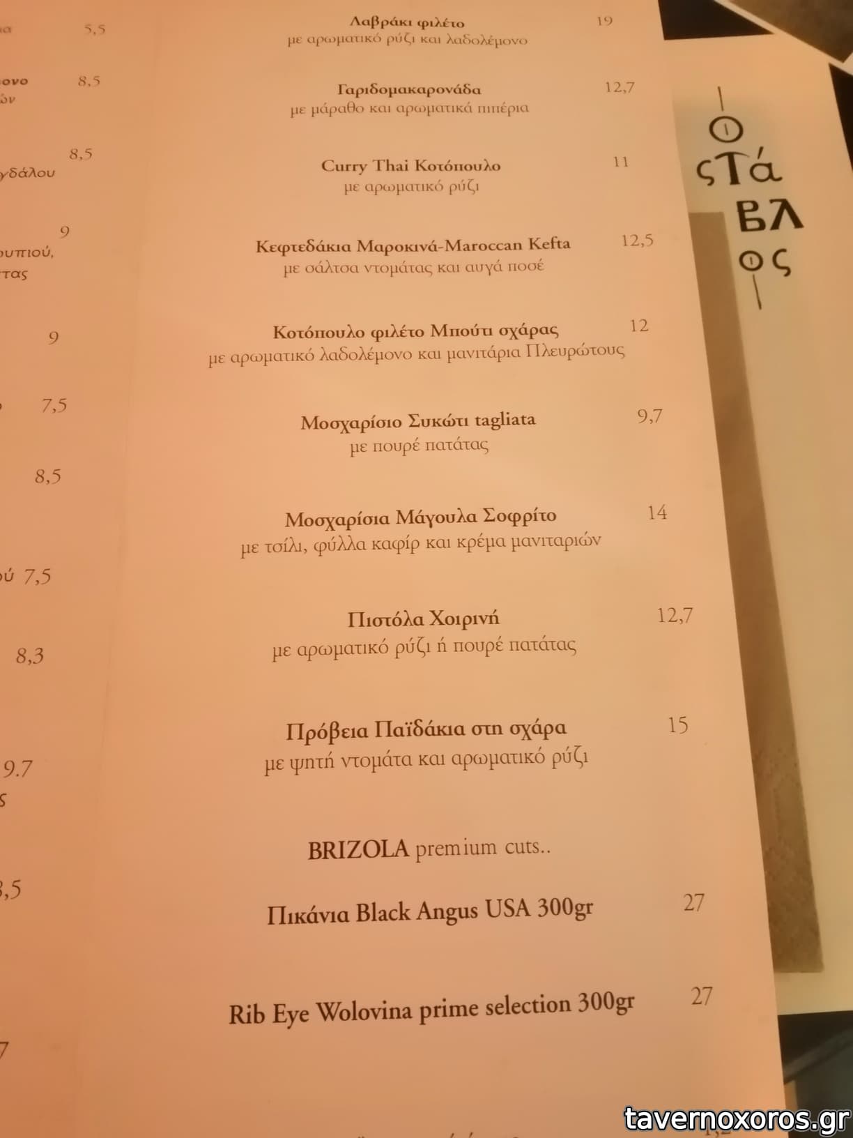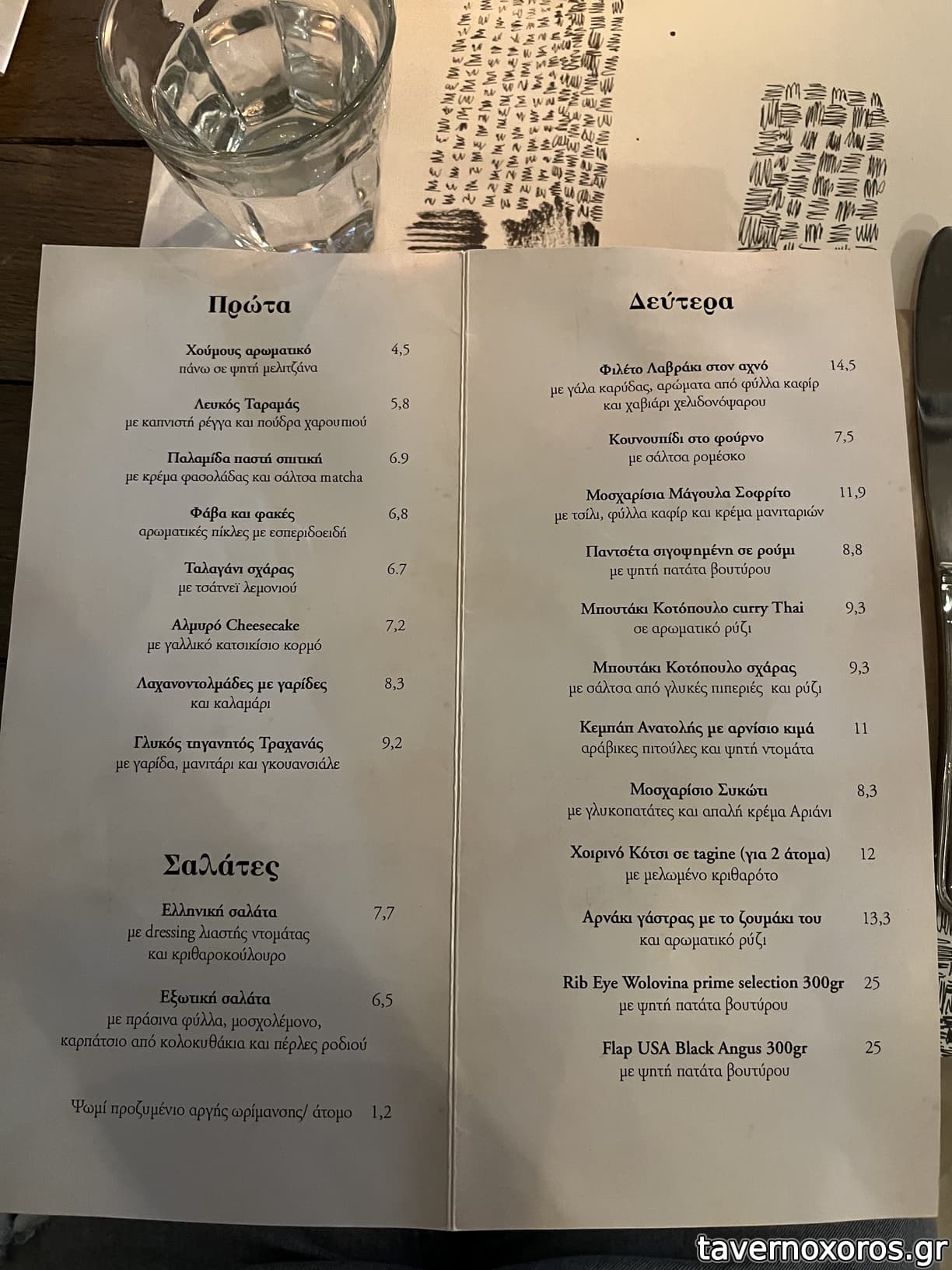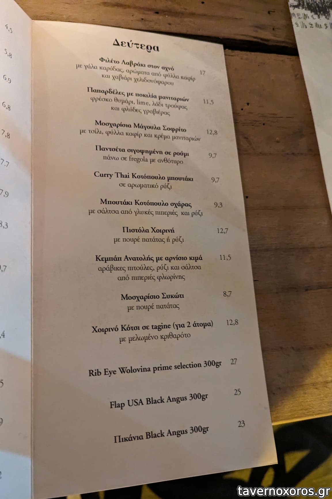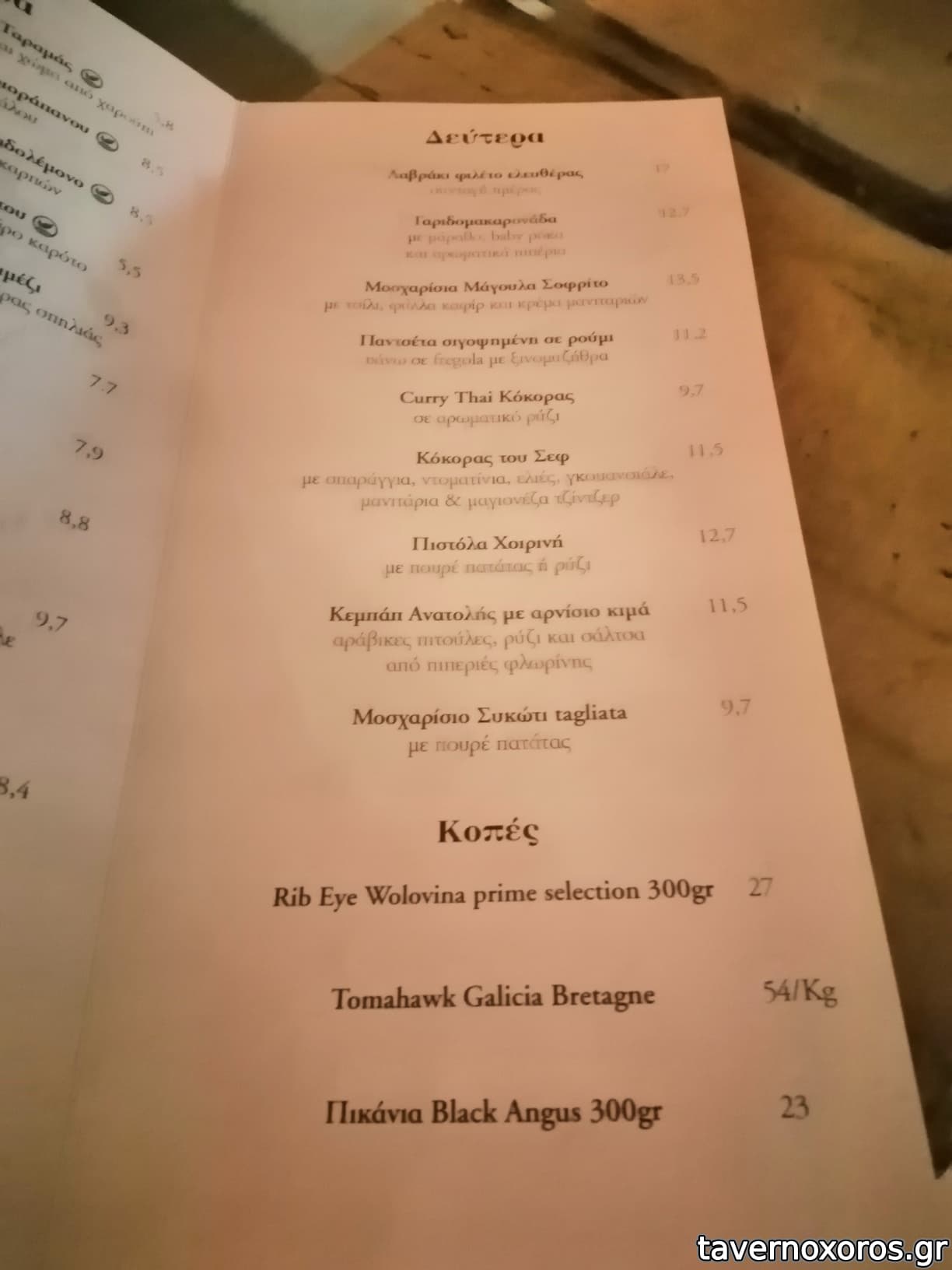 Το φαγητό γευστικά ήταν μέτριο χωρίς να έχει κάποιο κακό πιάτο αλλά και σε καμμιά περίπτωση να μας ενθουσιάσει. Ελληνική χωριάτικη σαλατα με άγευστη ντομάτα, χόρτα ωραία βρασμένα αλλά με αδιάφορο dressing, μανιτάρια πλευρώτους με πετιμέζι το οποίο δεν το γευόσουν καθόλου και σκληρό αμερικανικό ribeye… που του έλλειπε το λίπος και η νοστιμιά που περιμένεις σε ένα τέτοιο τύπο κρέατος… σαν να μην ήταν ribeye?