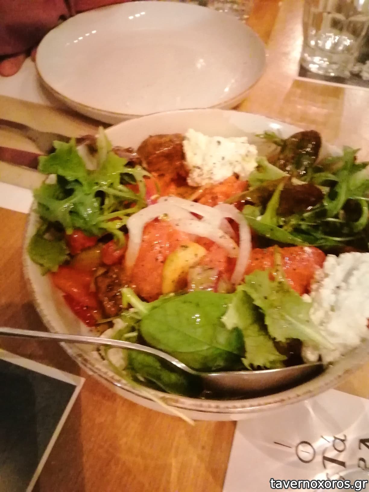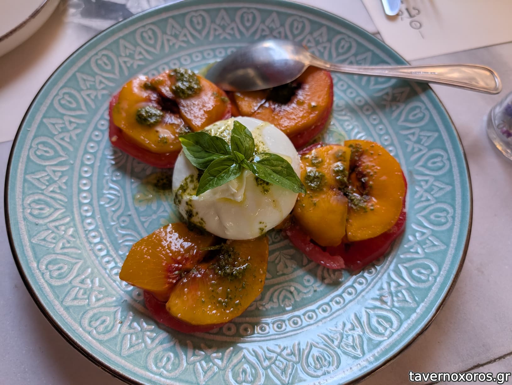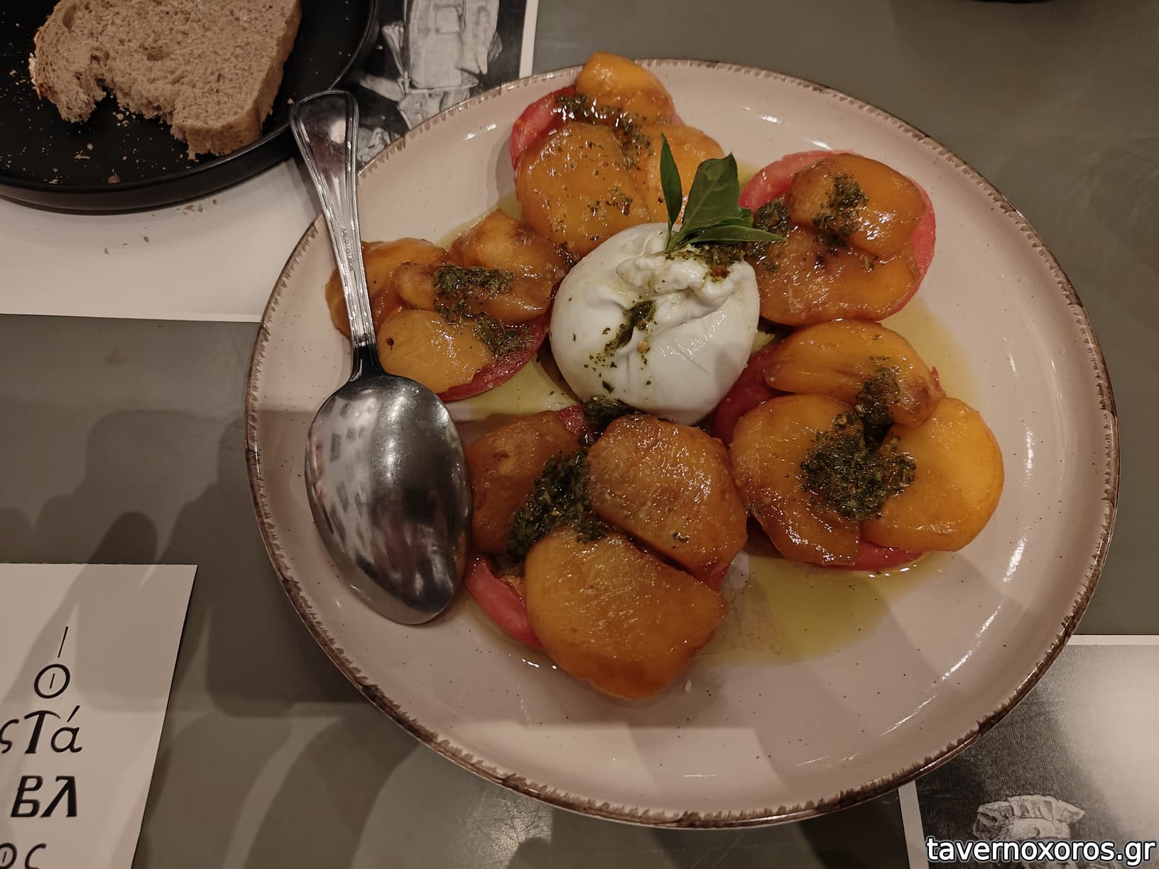 Σαλάτα ψητή ντομάτα με ροδάκινο και μπουράτα, εκτός καταλόγου. Ενδιαφέρουσα σκέψη, αλλά δεν την λες και σαλάτα, πιο πολύ ελαφρύ γλυκό.