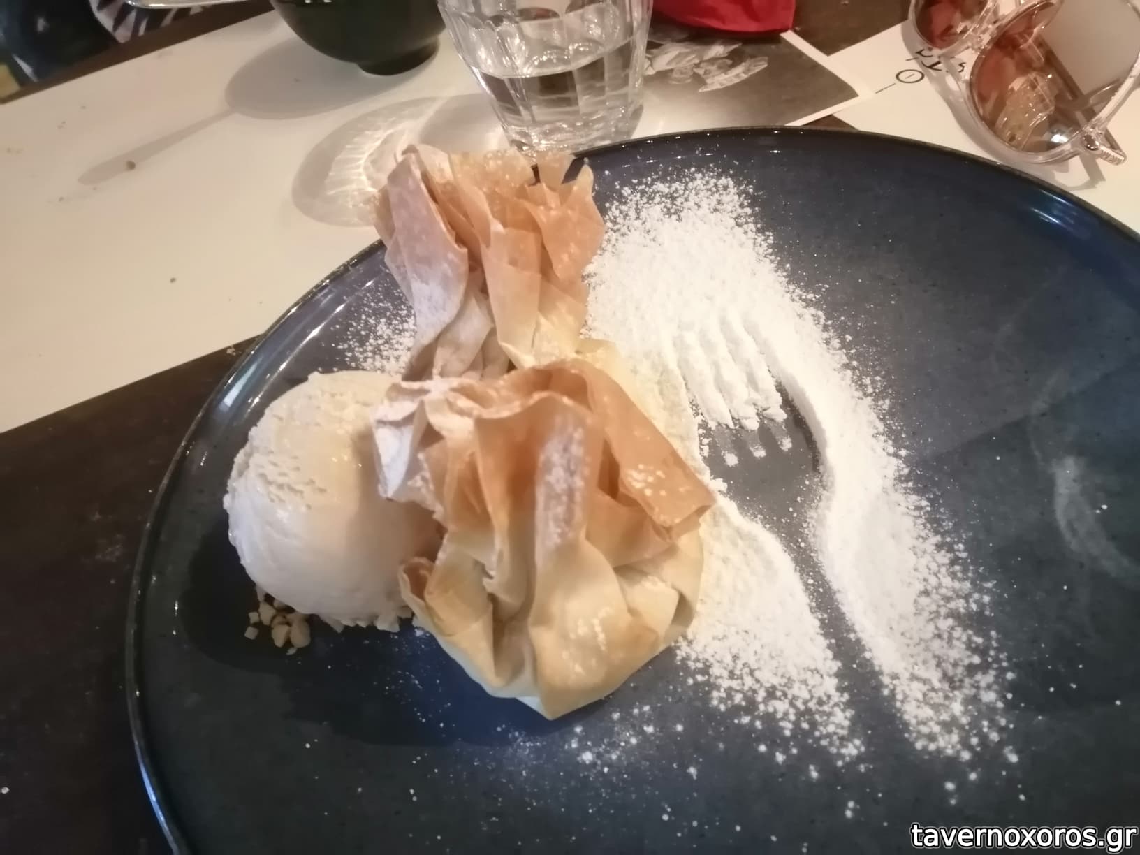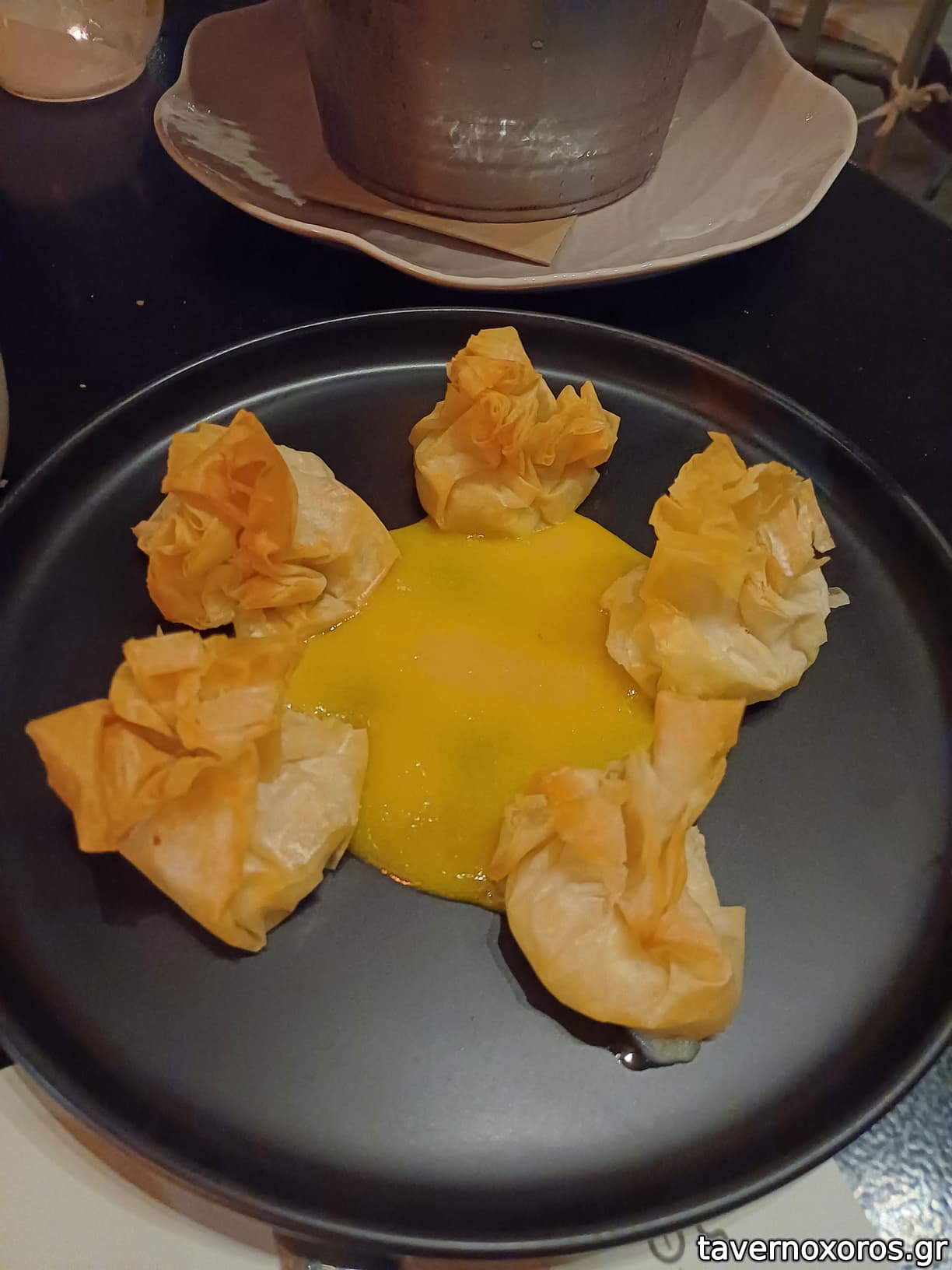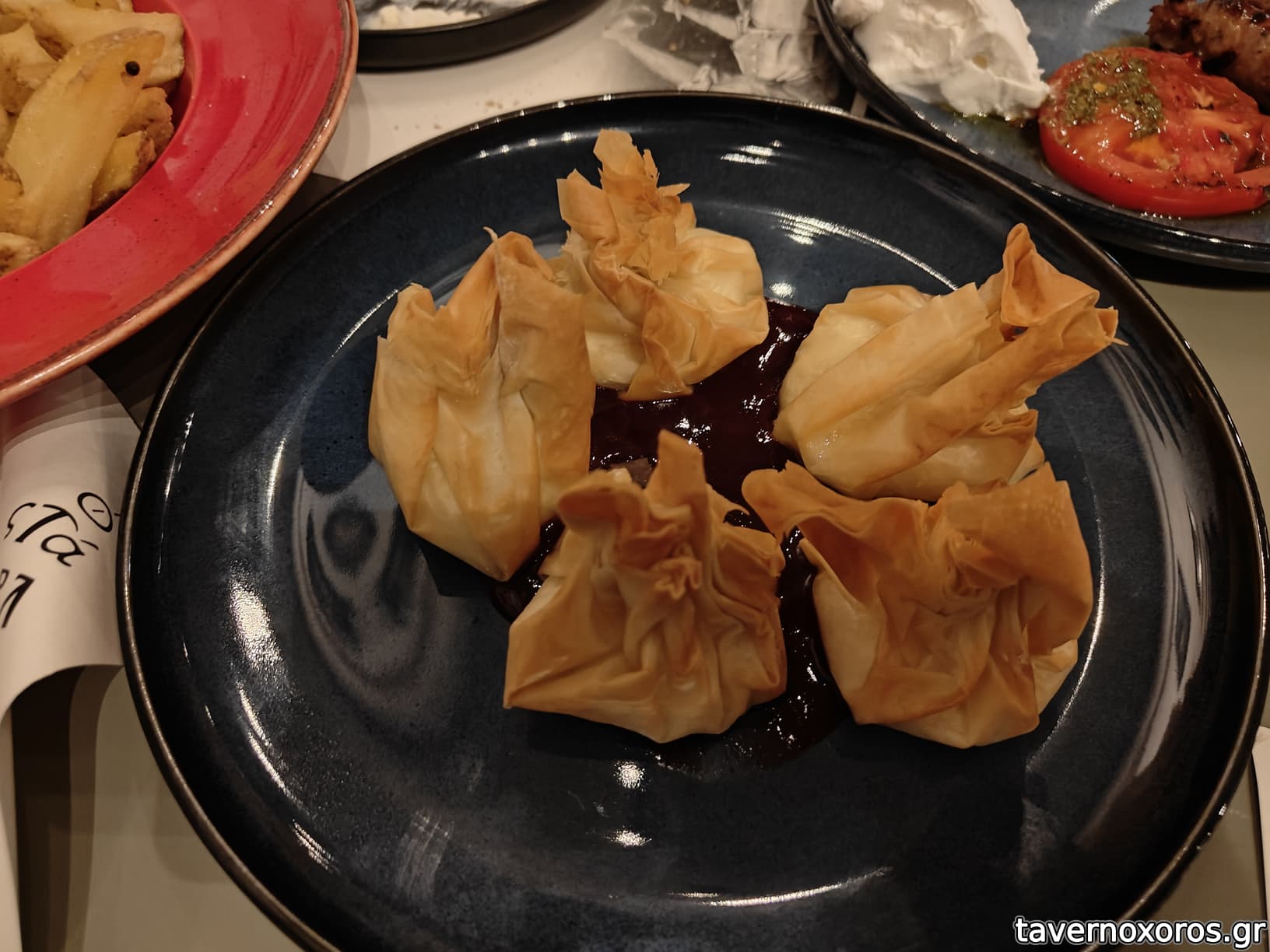-Πουγκάκια με κατσικίσιο τυρί, ωραιο αέρινο τραγανό φύλλο, σύνολο ταιριαστό με την αντίθεση του γλυκού τσάτνεϋ. (Αυτό μας το κέρασαν λόγω της ερώτησής μας για το συκώτι)