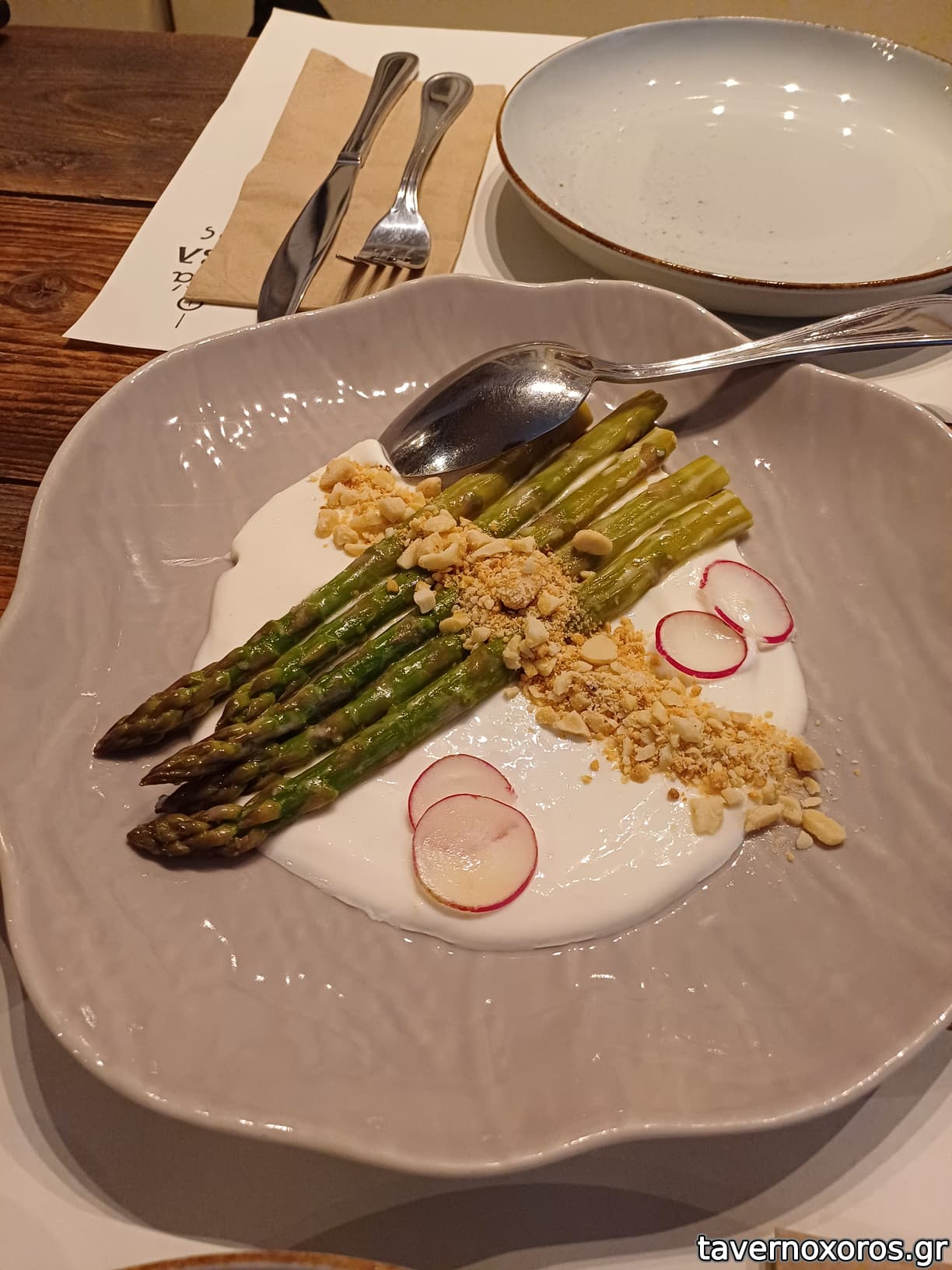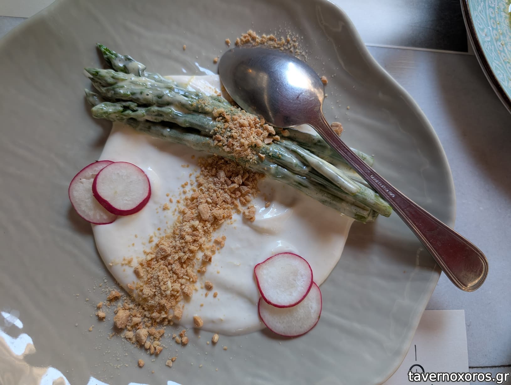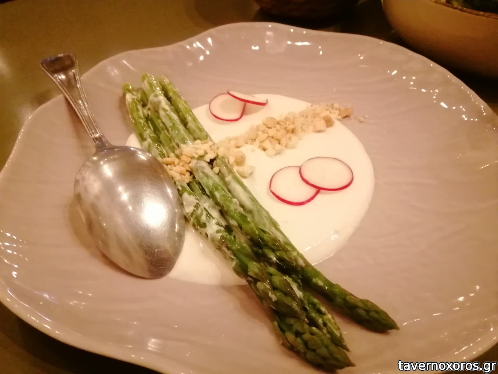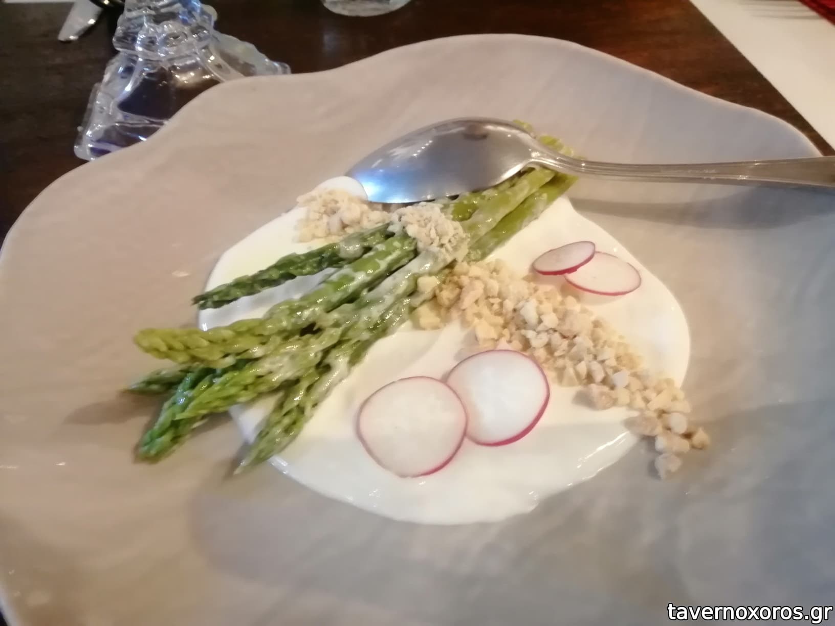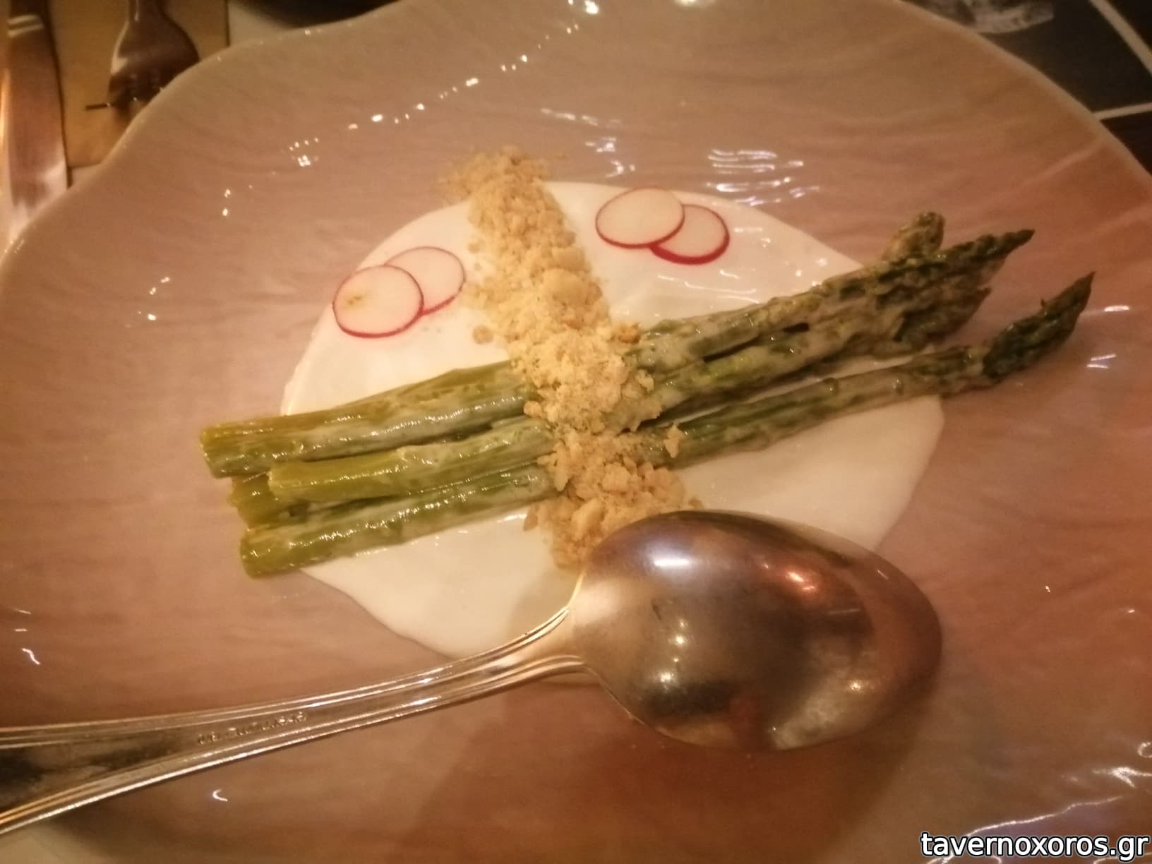 "Σπαράγγια σε κρέμα αγριοράπανο και κροκάν αμυγδάλου" (νόστιμη η σάλτσα)