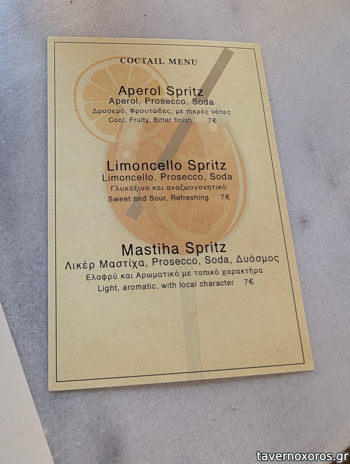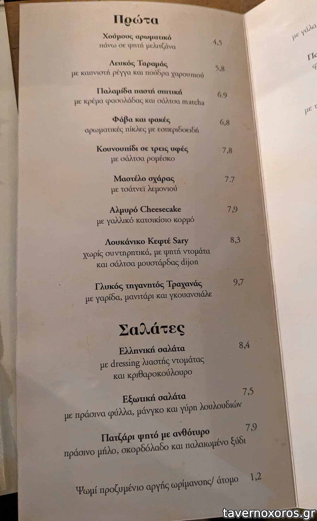 Δοκιμάσαμε σαλάτα παντζάρι με ανθότυρο ή ξινοτύρι, τηγανητό τραχανά με γαρίδες, φάβα και φακές (ορεκτικά) και μετά φιλέτο λαβράκι στον ατμό με γάλα καρύδας (πάρα πολύ καλό), πικάνια και χοιρινή πιστόλα. Το ψωμί ήταν καλό, η λίστα κρασιών μάλλον περιορισμένη.
