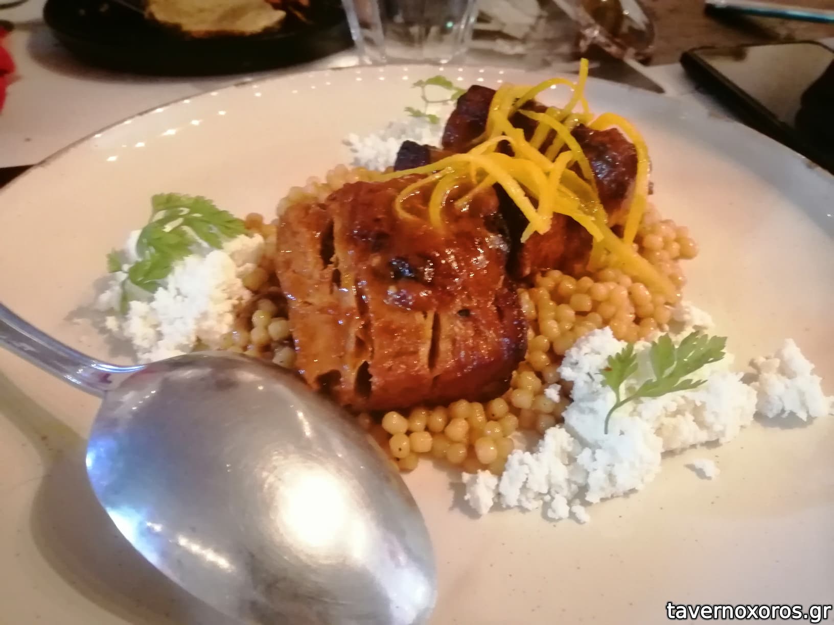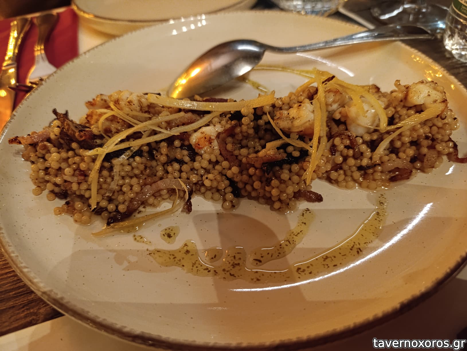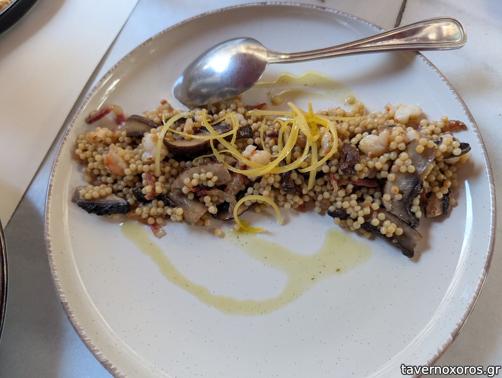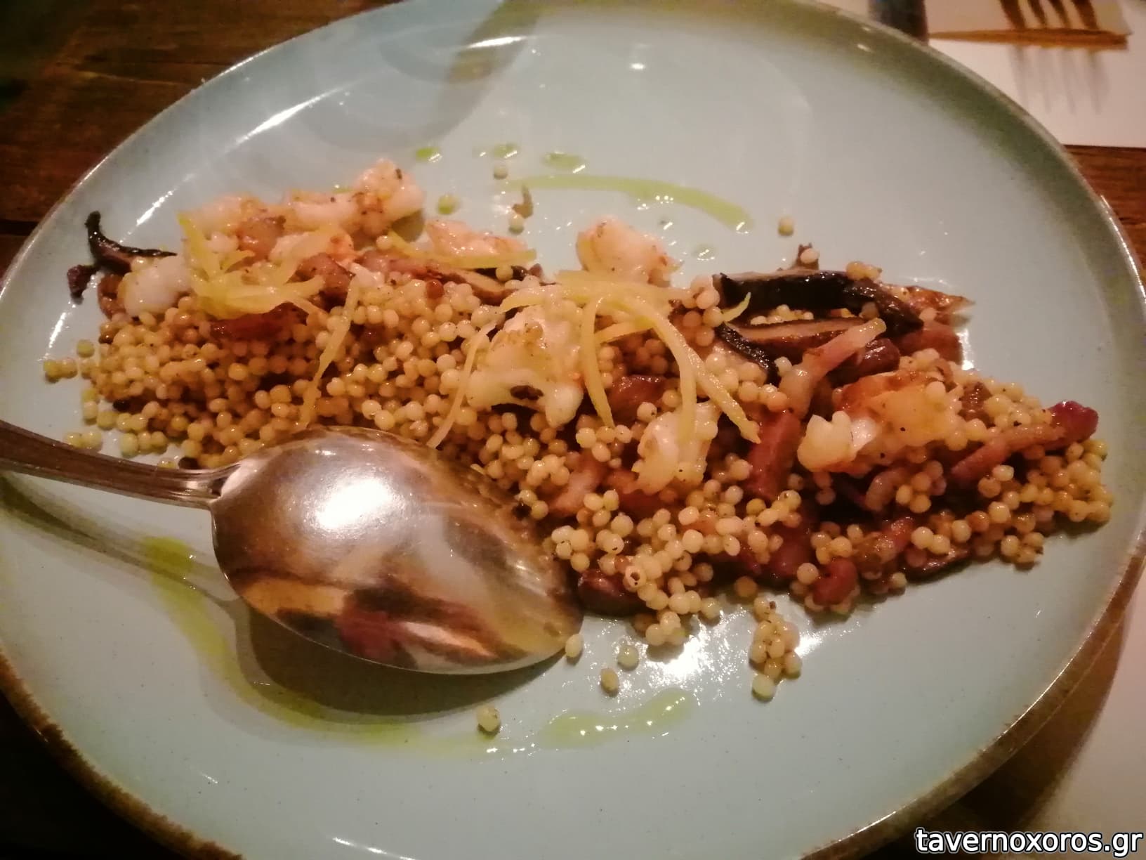 "Γλυκός τηγανητός τραχανάς με κους κους, γαρίδα, μανιτάρι και γκουανσιάλε" (καλό, δεν κατάλαβα γιατί το ονομάζει τραχανά αφού είναι κους κους)