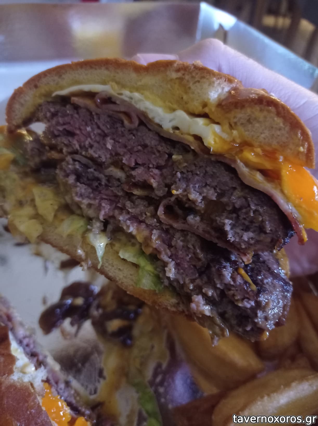 Double burger (ζόρικο) με πατάτες και σως