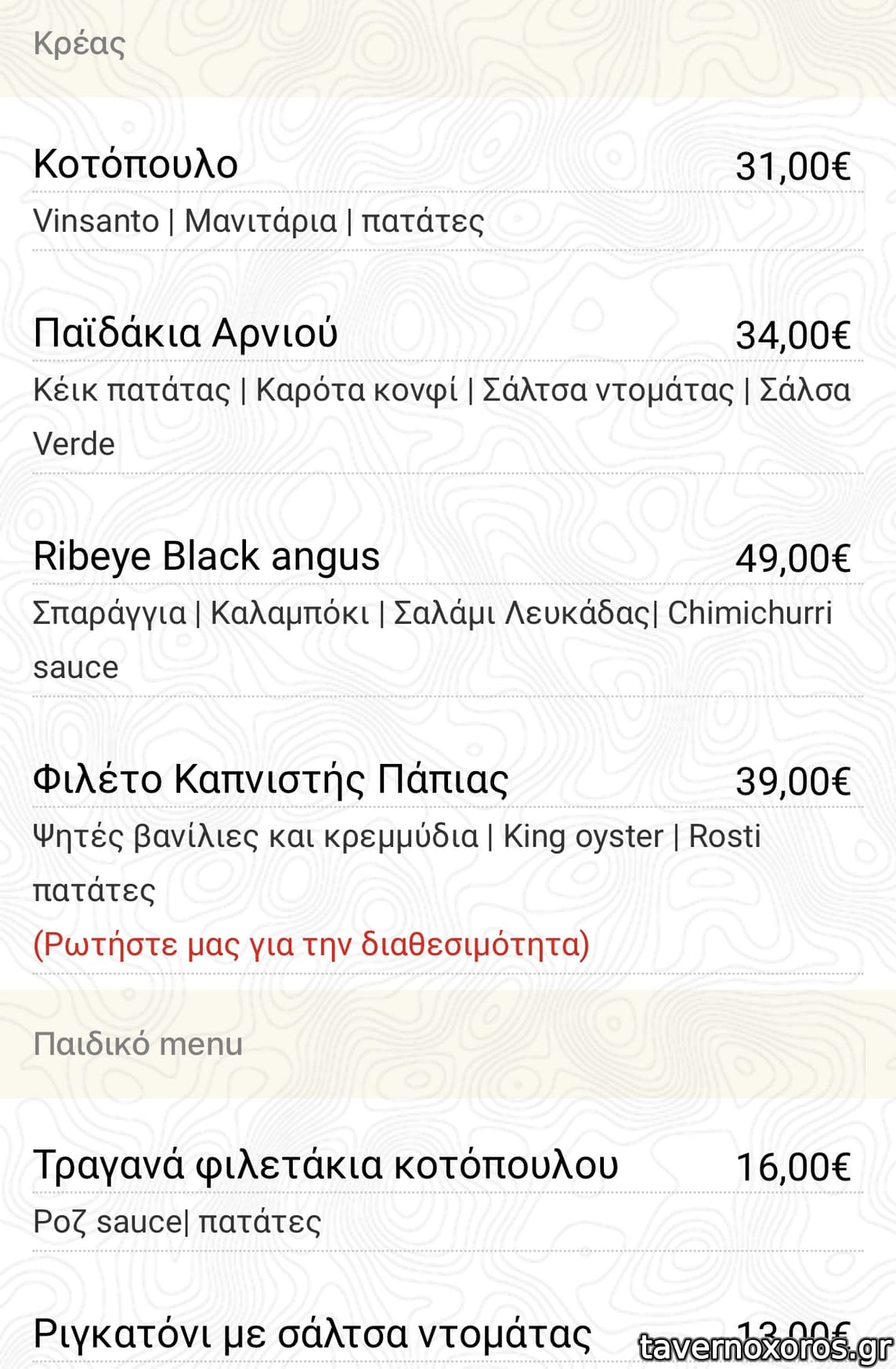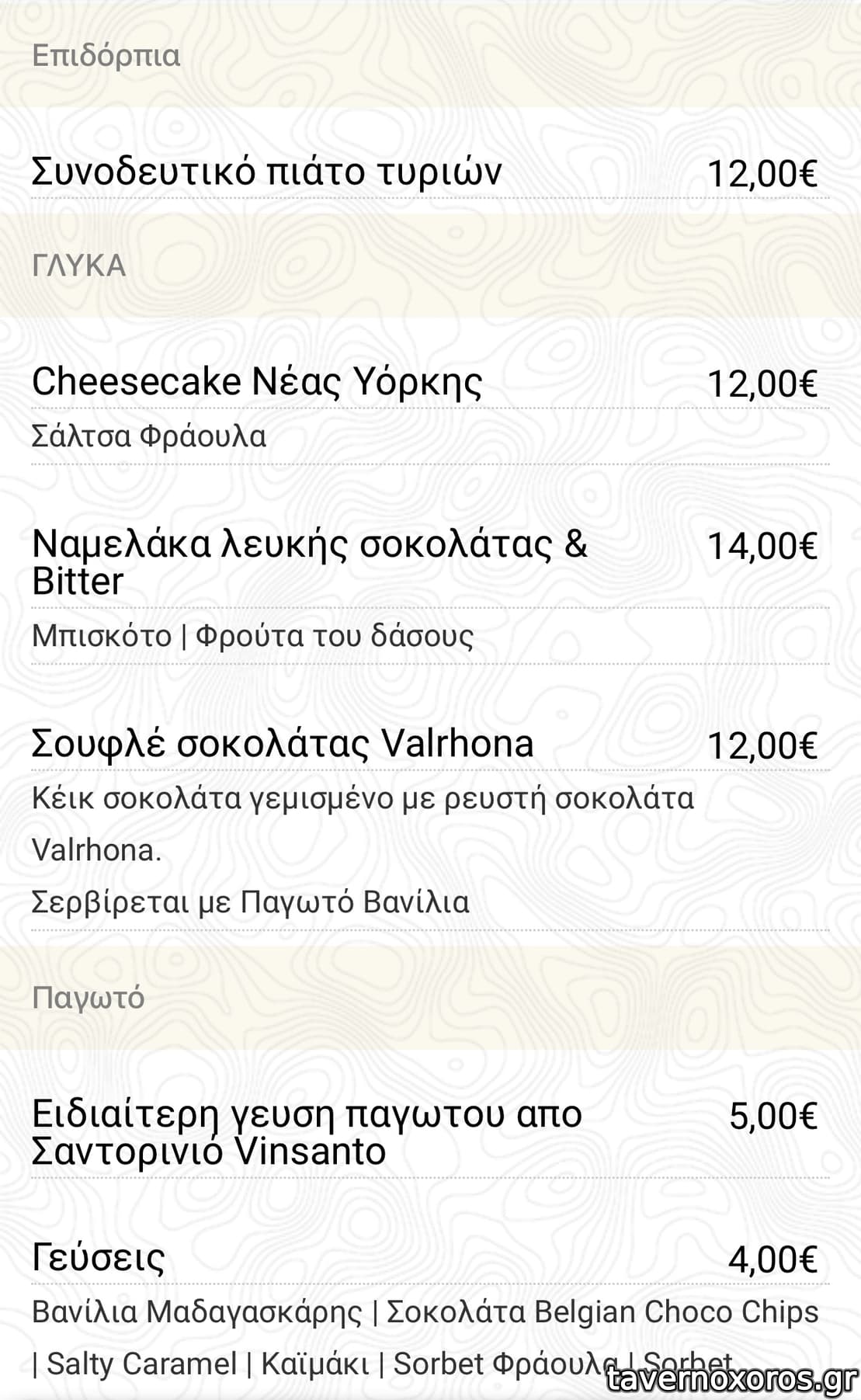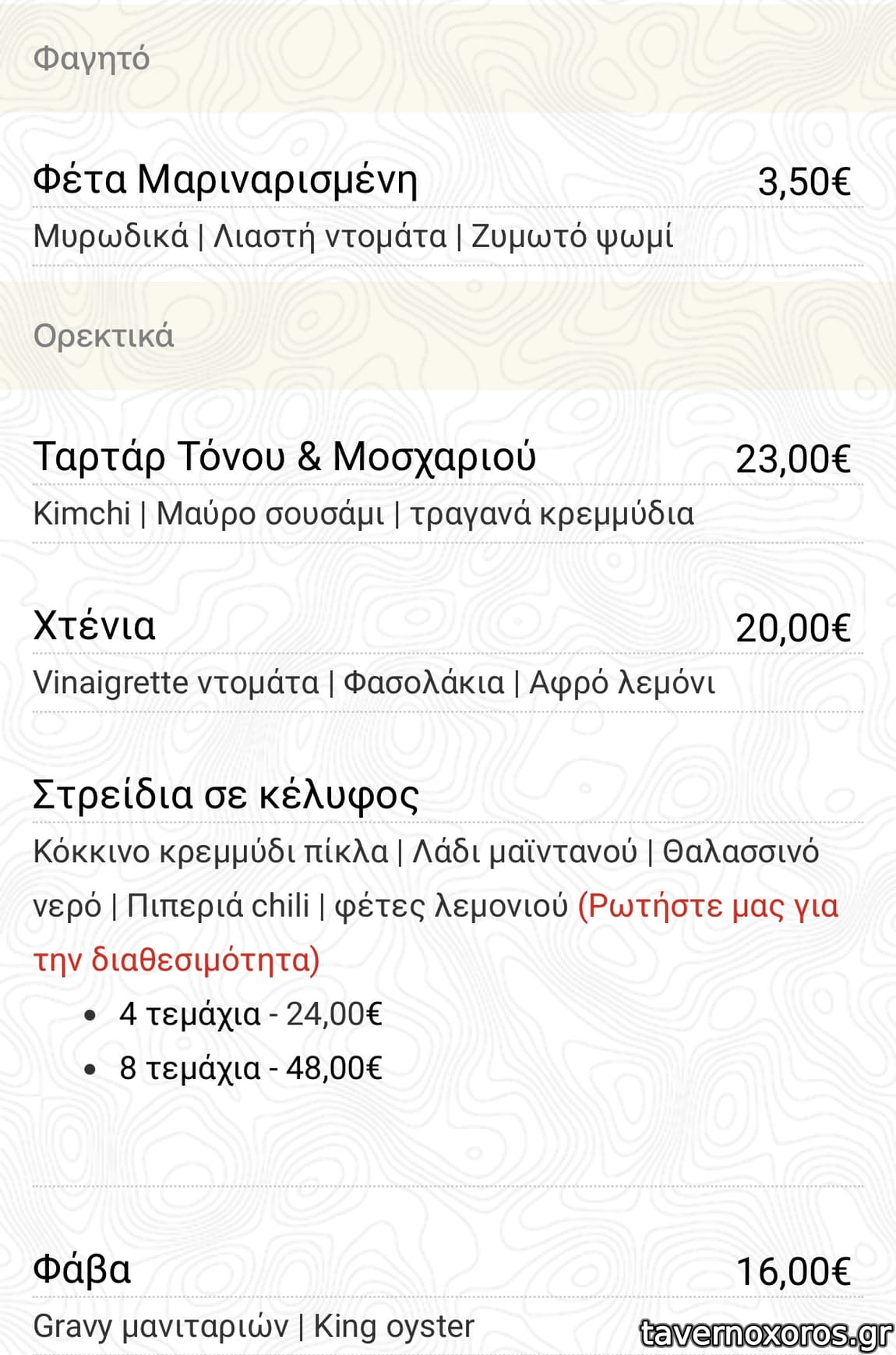 Γεύμα αρχές Οκτώβρη, δοκιμάσαμε, φέτα μαριναρισμένη σε κύβους με ωραίο ζυμωτό ψωμί (μικρό πιάτο σαν καλωσόρισμα), σαλάτα με ψίχα μπλε καβουριού (ok), σκορδομακαρονάδα (νόστιμη) και χταπόδι με φάβα (πολύ καλό), μαζί με 2 σετ γευσιγνωσίας 5 κρασιών = € 121,