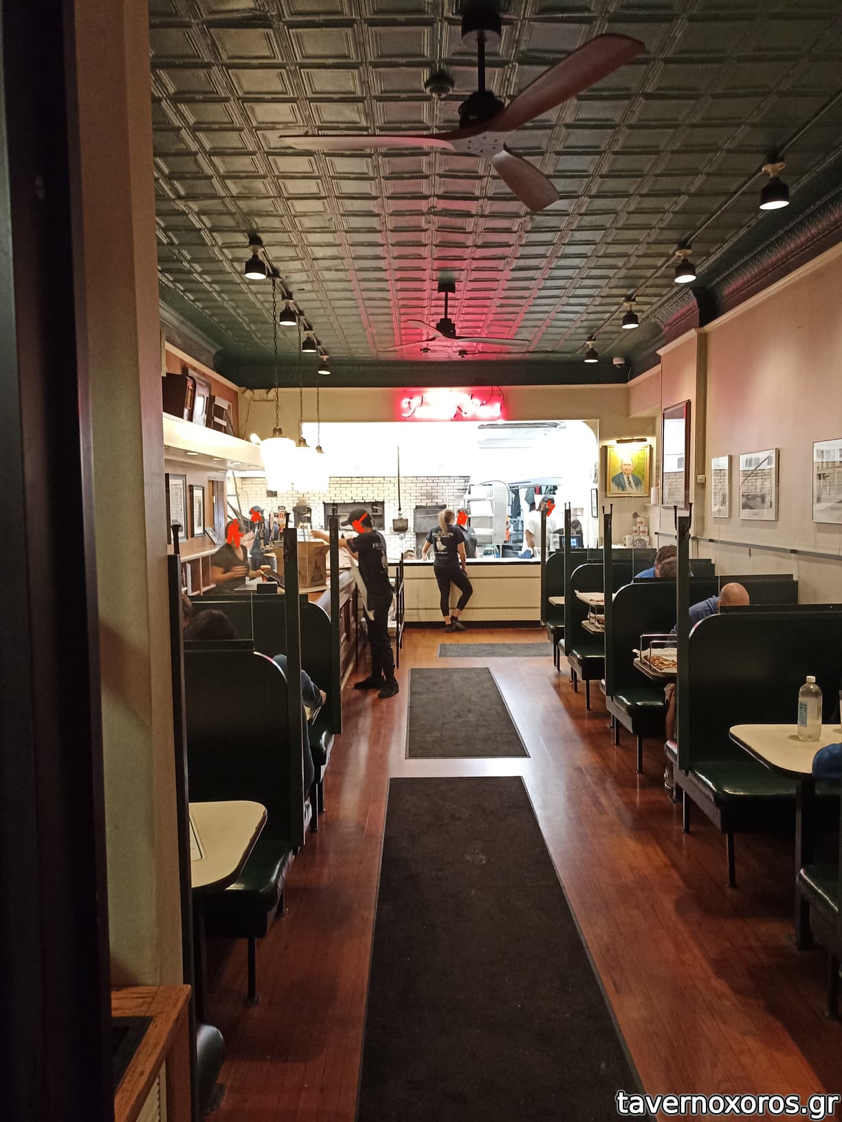 Booth tables δεξιά κι αριστερά, στο βάθος brick oven, όπου ψήνεται η '