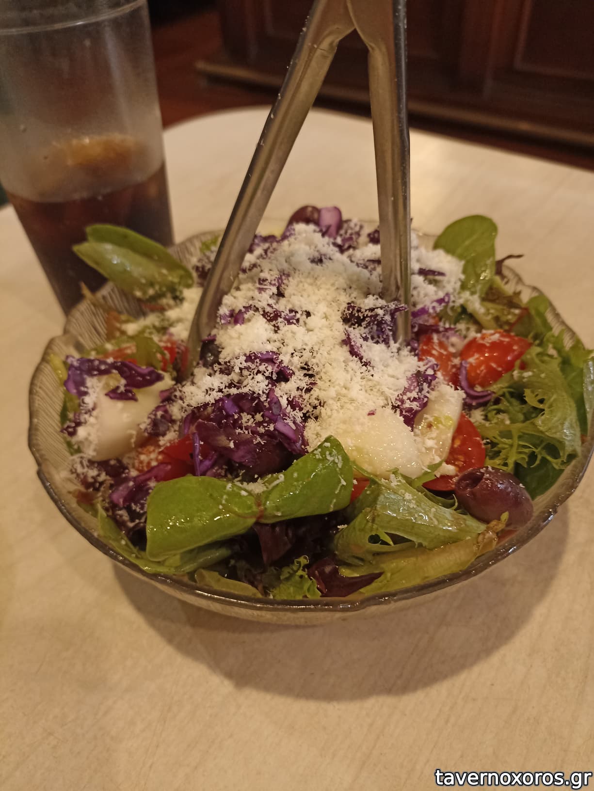 Η πράσινη σαλάτα, όχι κάτι το ιδιαίτερο, αλλά δροσερή. Στα αναψυκτικά έχει απεριόριστο refill.