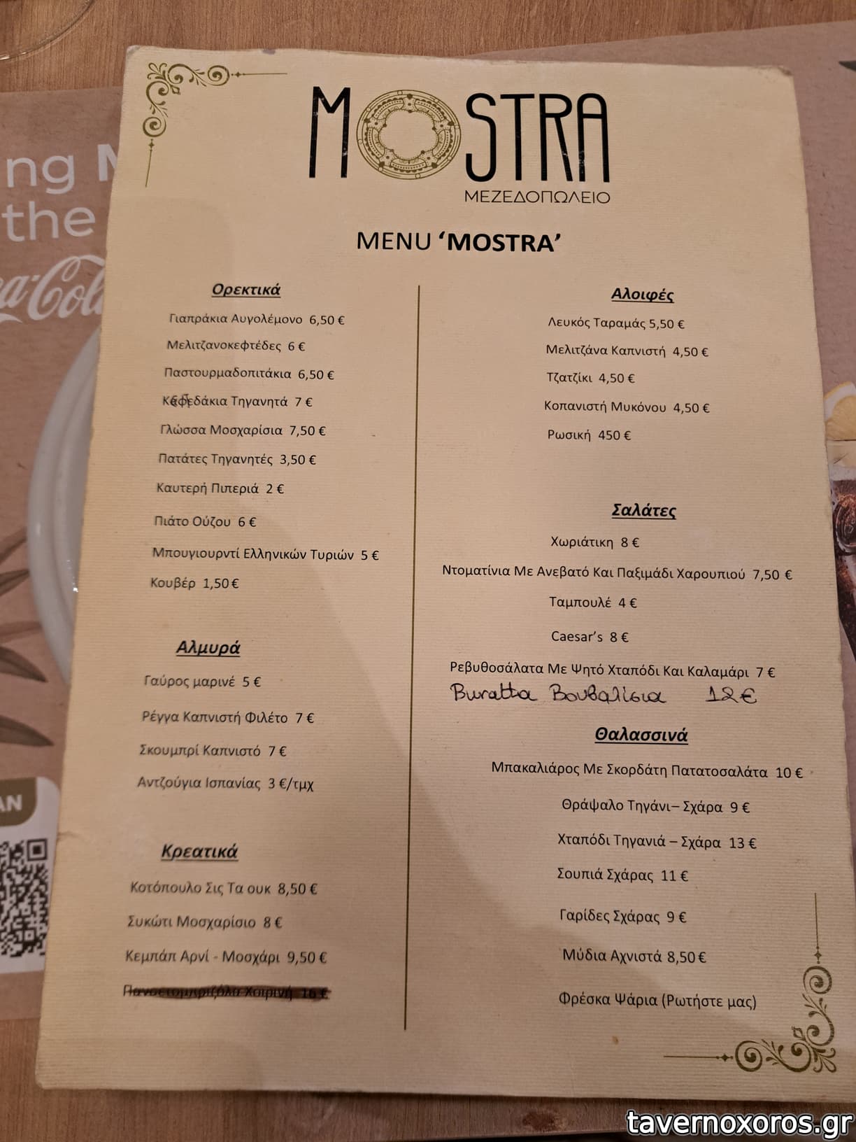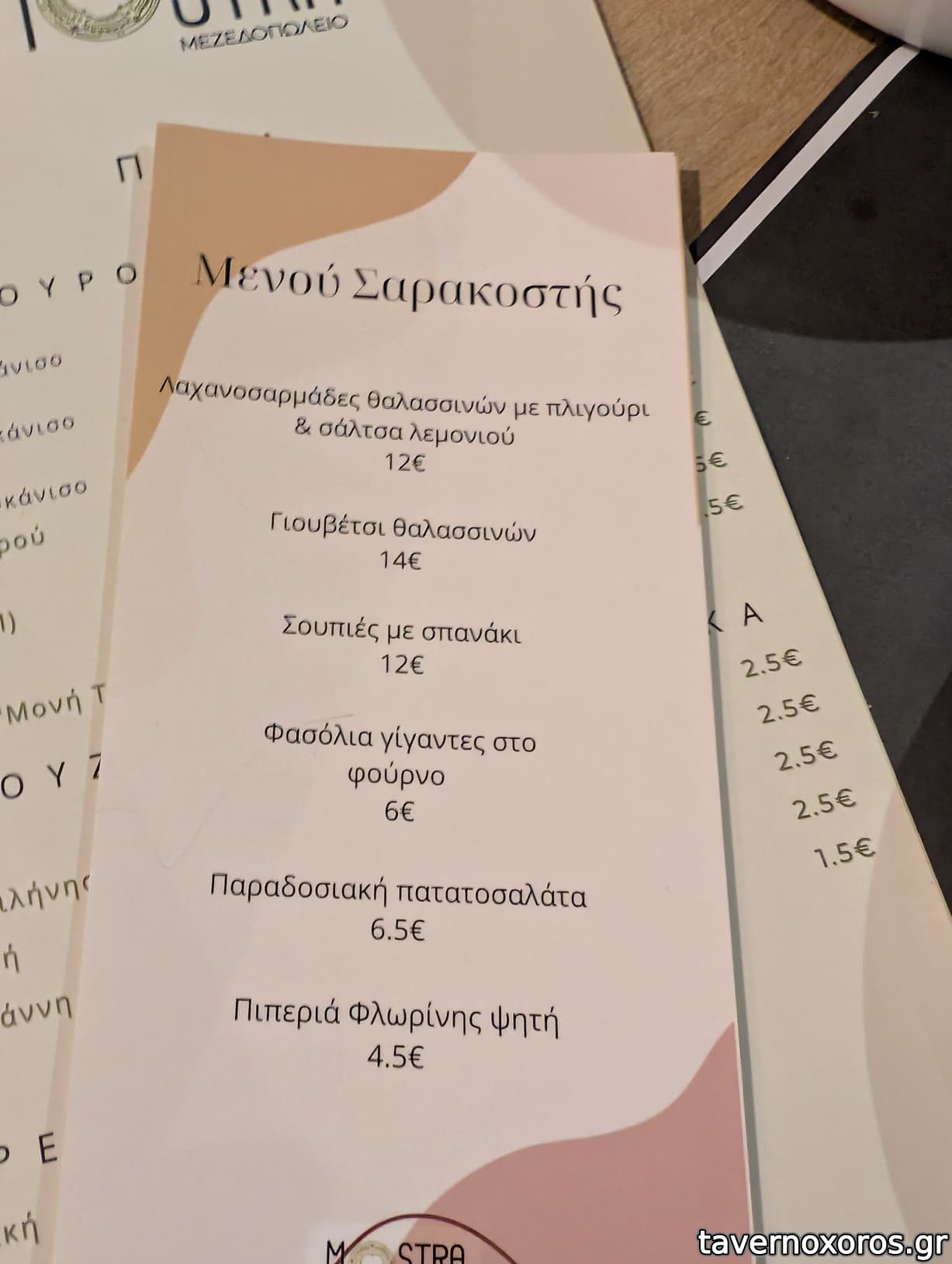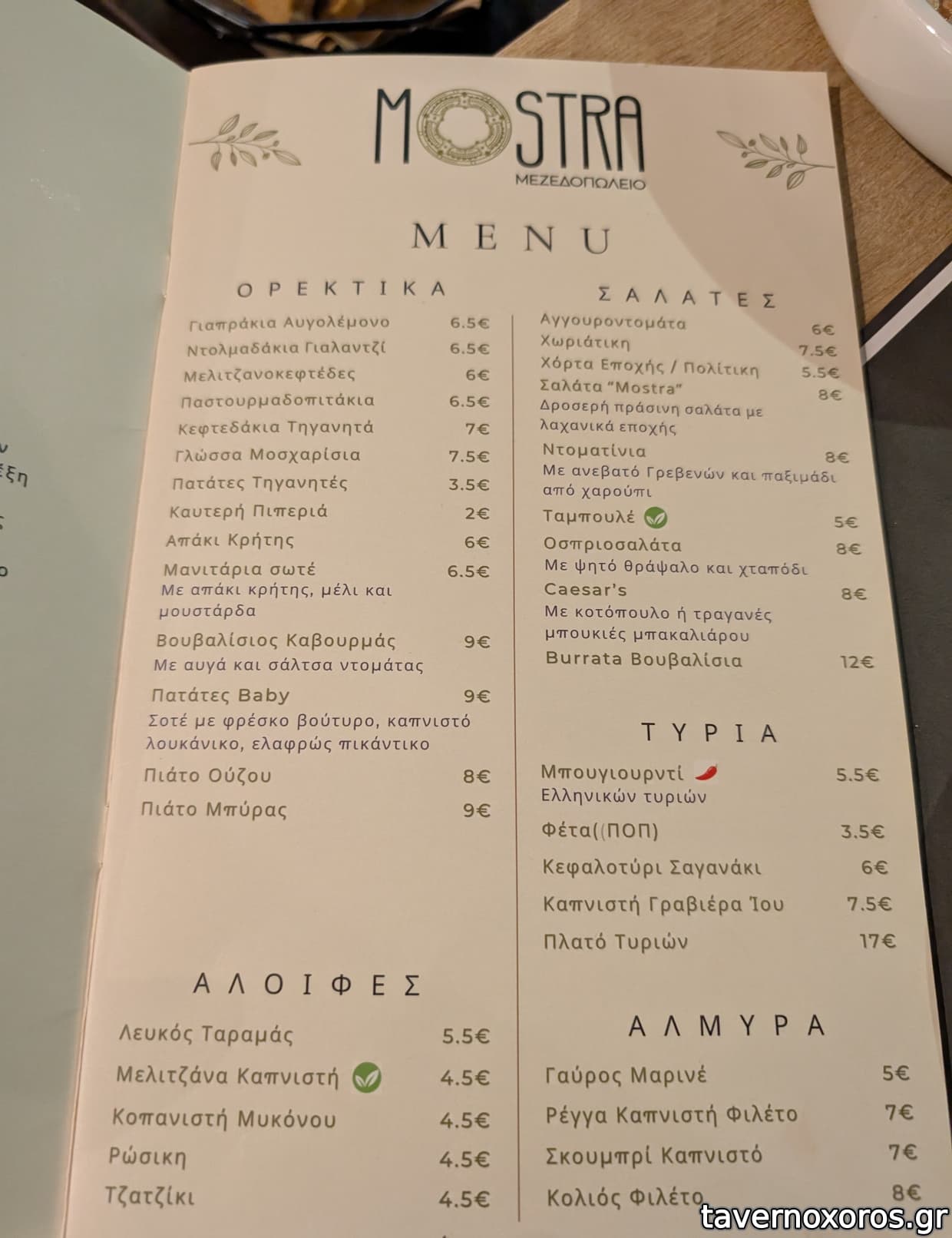 | Λέξεις κλειδιά | Μόστρα, #κοπανιστή, #γιαπράκια, #πανσέτα, #μπιφτέκι, #παστουρμαδόπιτα, #κεφτεδάκια, #ταμπουλέ, #γλώσσα μοσχαρίσια, #ρέγγα, #θράψαλα, #σουπιές, #χταπόδι, #γαρίδες, #μύδια, #μπακαλιάρος σκορδαλιά, #αρνάκι γάστρα, #λουκάνικο, #τηγανιά, #σουτζουκάκια, #μανιτάρια, #ντολμαδάκια, #μελιτζανοκεφτέδες, #απάκι, #καβουρμάς, #βουβάλι, #πλατώ τυριών, #γαύρος μαρινάτος, #κολιός παστός, #κοτόπουλο, #συκώτι τηγανητό, #χοιρινή, #σουπιά κρασάτη, #μυδοπίλαφο, #γαύρος, #σαρδέλα, #κουτσομούρες, #πεσκανδρίτσες, #ψαρόσουπα, #ζυμαρικά |