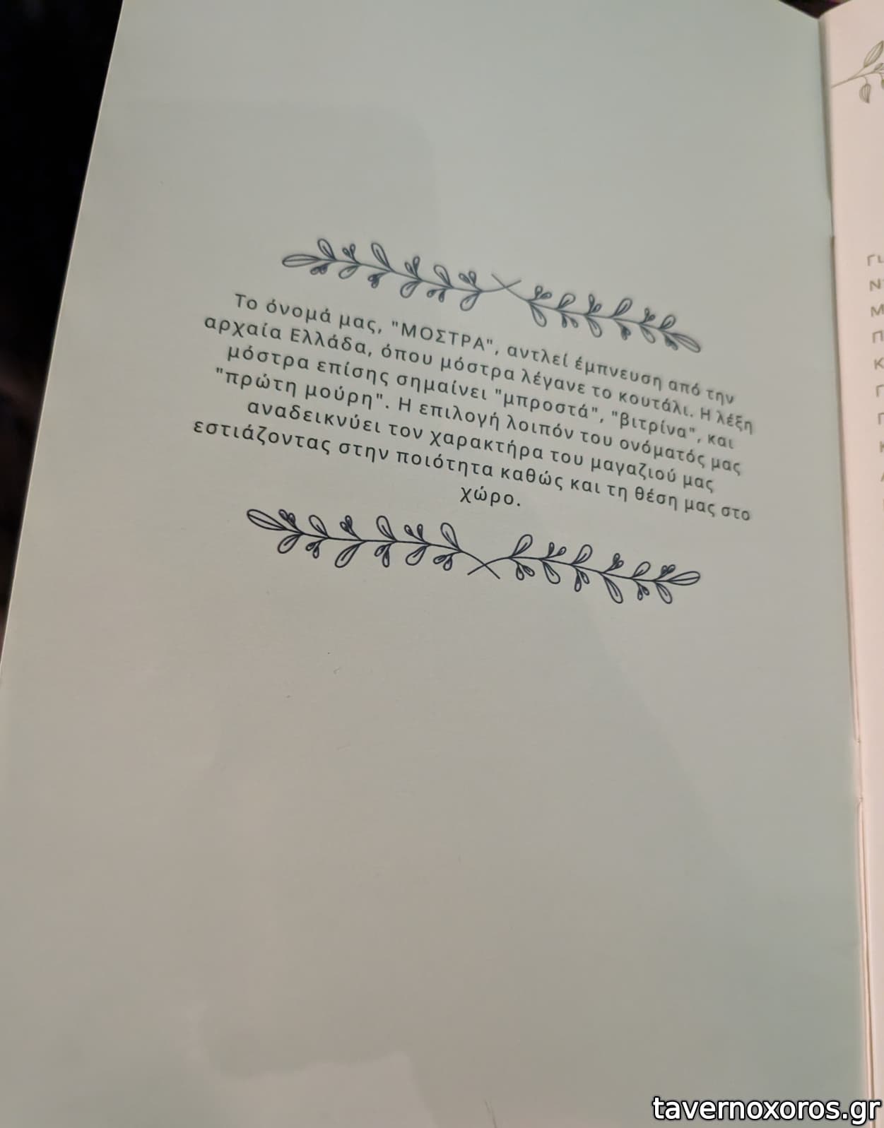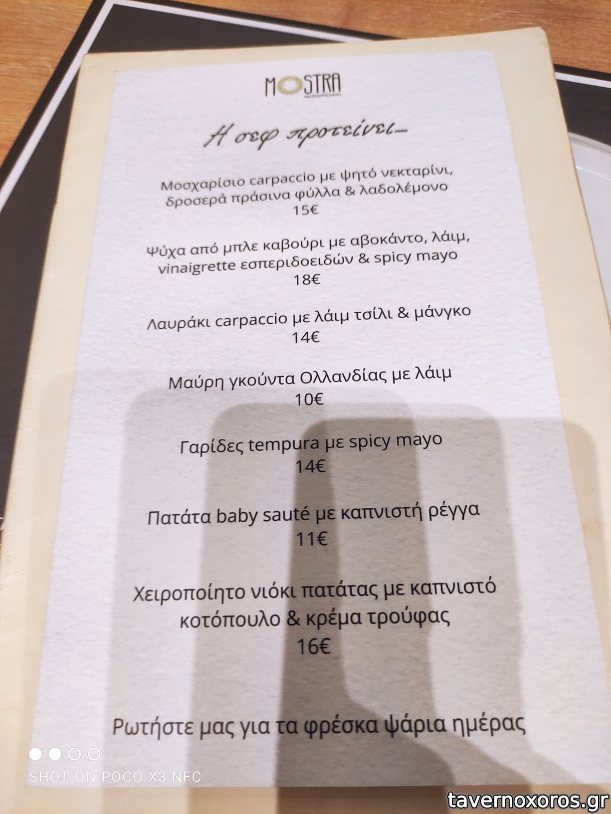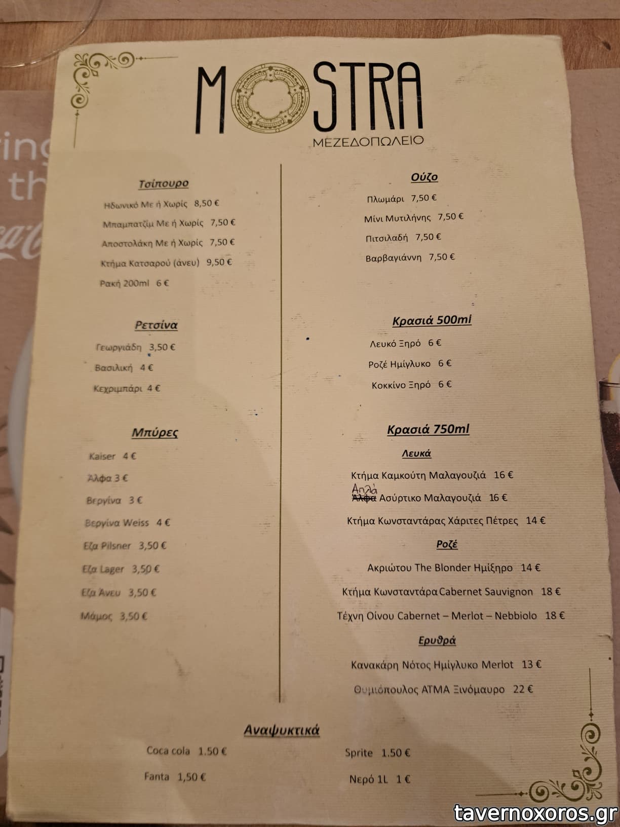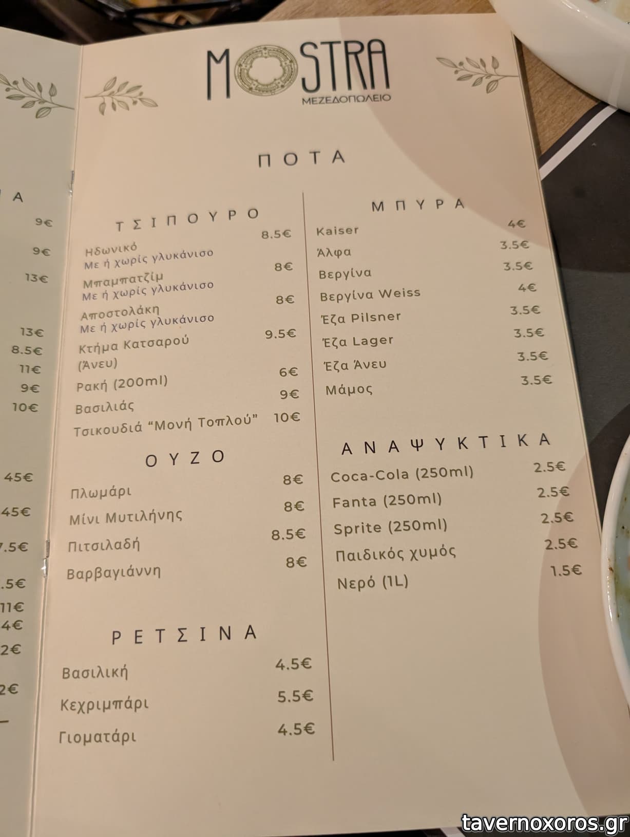 | Λέξεις κλειδιά | Μόστρα, #κοπανιστή, #γιαπράκια, #πανσέτα, #μπιφτέκι, #παστουρμαδόπιτα, #κεφτεδάκια, #ταμπουλέ, #γλώσσα μοσχαρίσια, #ρέγγα, #θράψαλα, #σουπιές, #χταπόδι, #γαρίδες, #μύδια, #μπακαλιάρος σκορδαλιά, #αρνάκι γάστρα, #λουκάνικο, #τηγανιά, #σουτζουκάκια, #μανιτάρια, #ντολμαδάκια, #μελιτζανοκεφτέδες, #απάκι, #καβουρμάς, #βουβάλι, #πλατώ τυριών, #γαύρος μαρινάτος, #κολιός παστός, #κοτόπουλο, #συκώτι τηγανητό, #χοιρινή, #σουπιά κρασάτη, #μυδοπίλαφο, #γαύρος, #σαρδέλα, #κουτσομούρες, #πεσκανδρίτσες, #ψαρόσουπα, #ζυμαρικά |