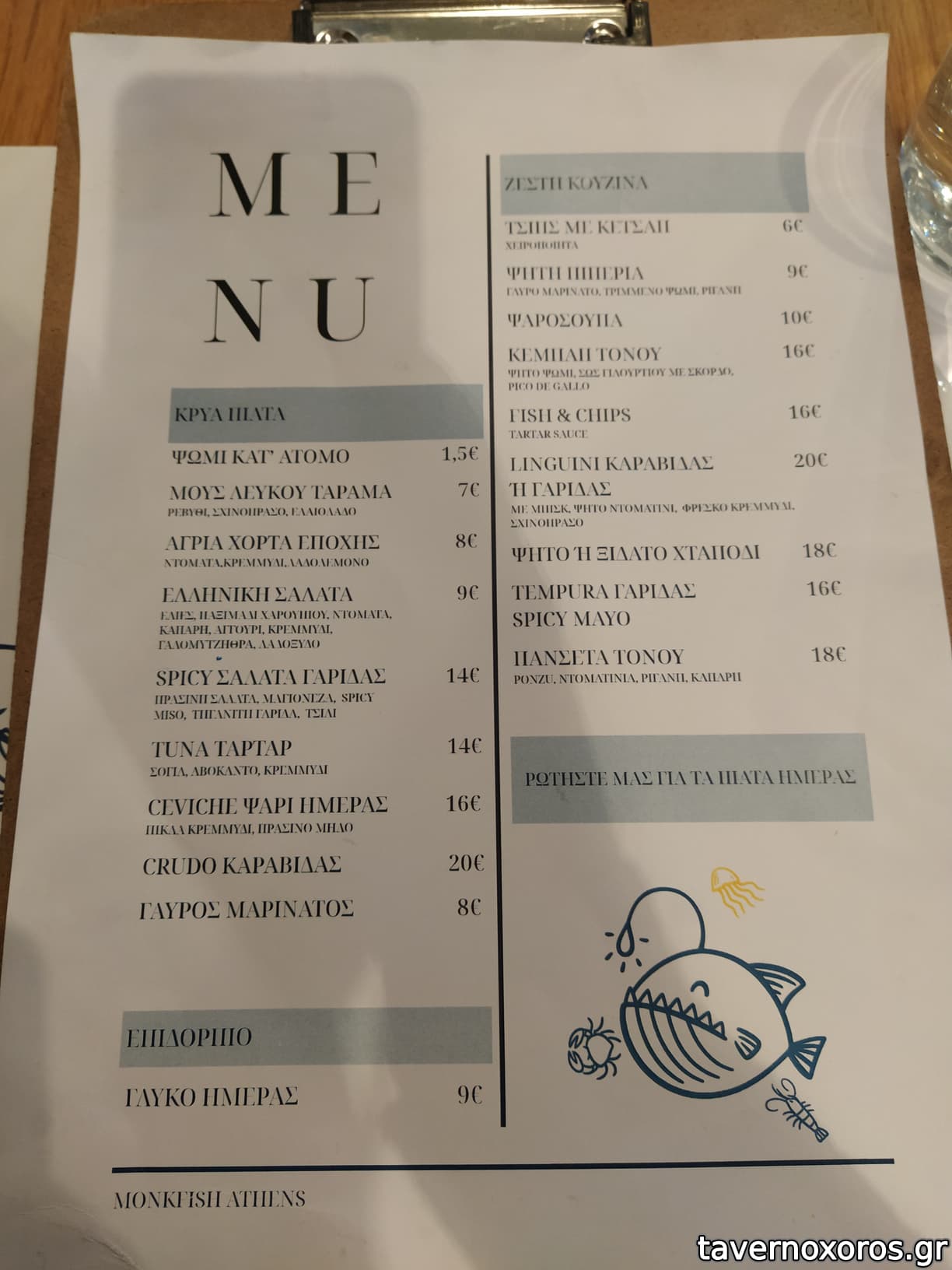 | Λέξεις κλειδιά | Monkfish, #εξωτερική θερμάστρα, #ψαρόσουπα, #χταπόδι, #όστρακα, #χτένια, #μύδια, #γαρίδες, #μπαρμπούνια, #καραβίδες, #αχινοσαλάτα, #κουτσομούρες, #γαύρος |