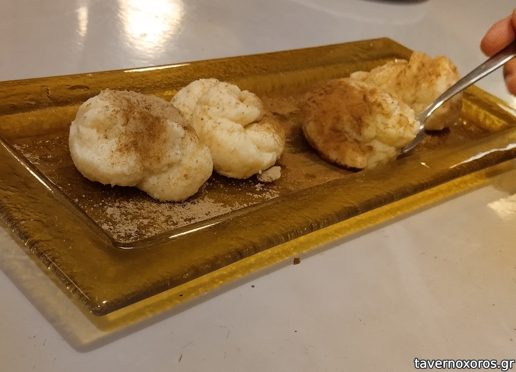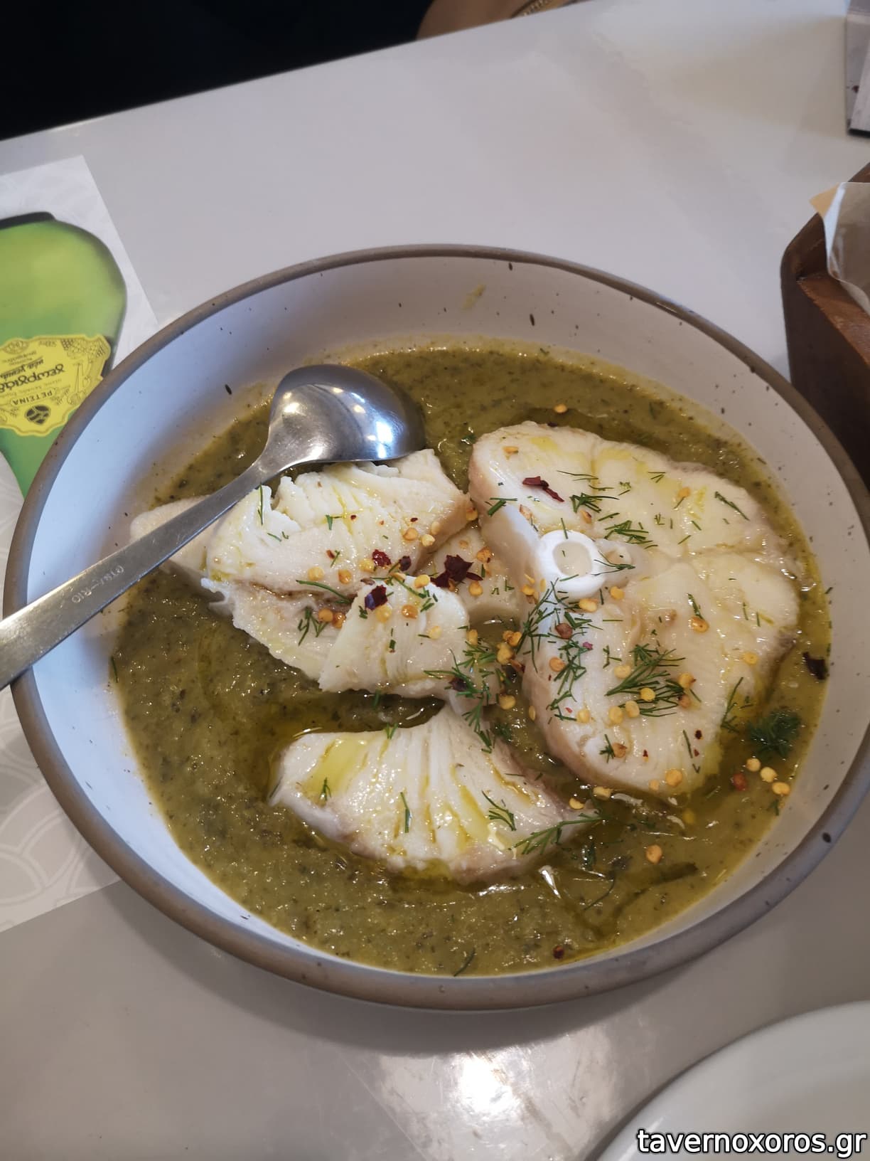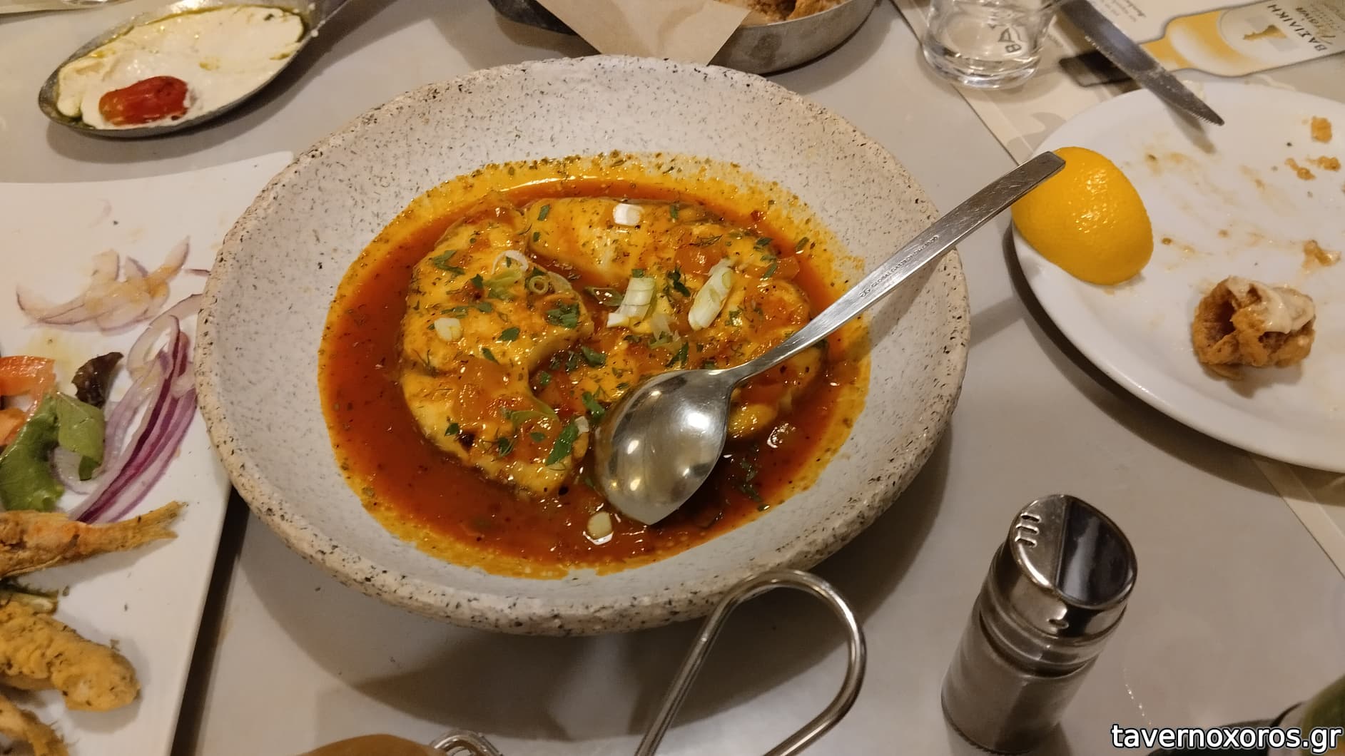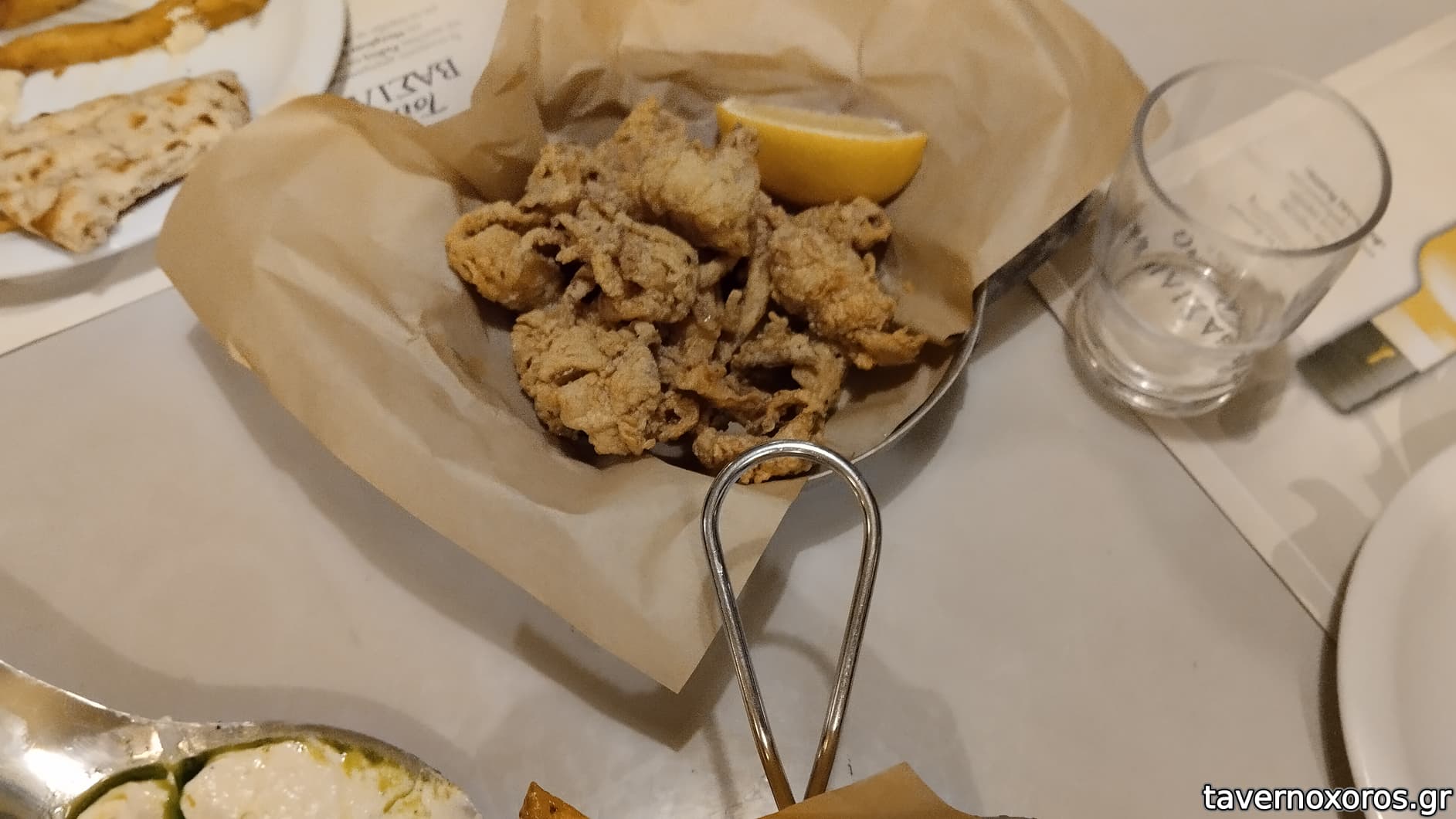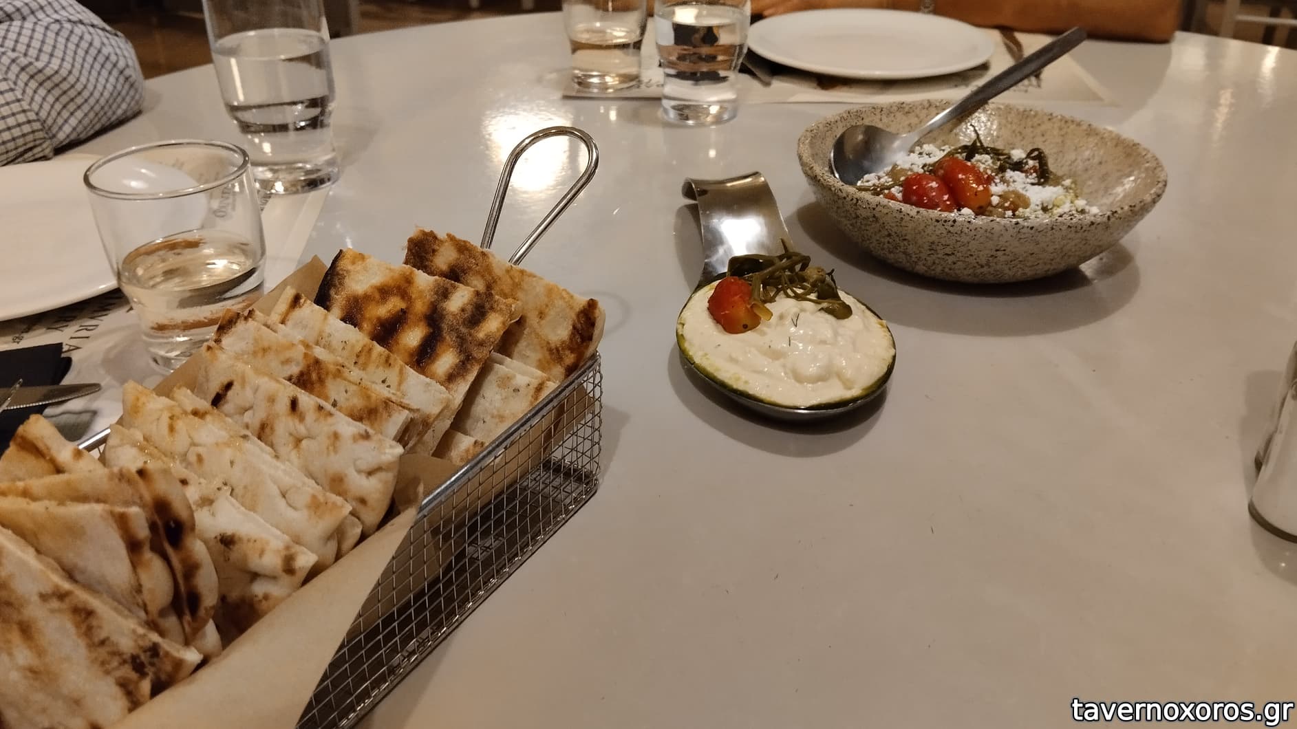 Γενικά οι μερίδες ήταν αστεία μικρές. Χαρακτηριστικά θα αναφέρω το λευκό ταραμά με κριταμο και κάπαρη ο οποίος κόστιζε 6€ και όταν ήρθε μαζί με τις πίτες ως πρώτο πιάτο νόμιζα ότι ήταν ντιπάκι καλωσορίσματος! (Βλέπε φωτό)