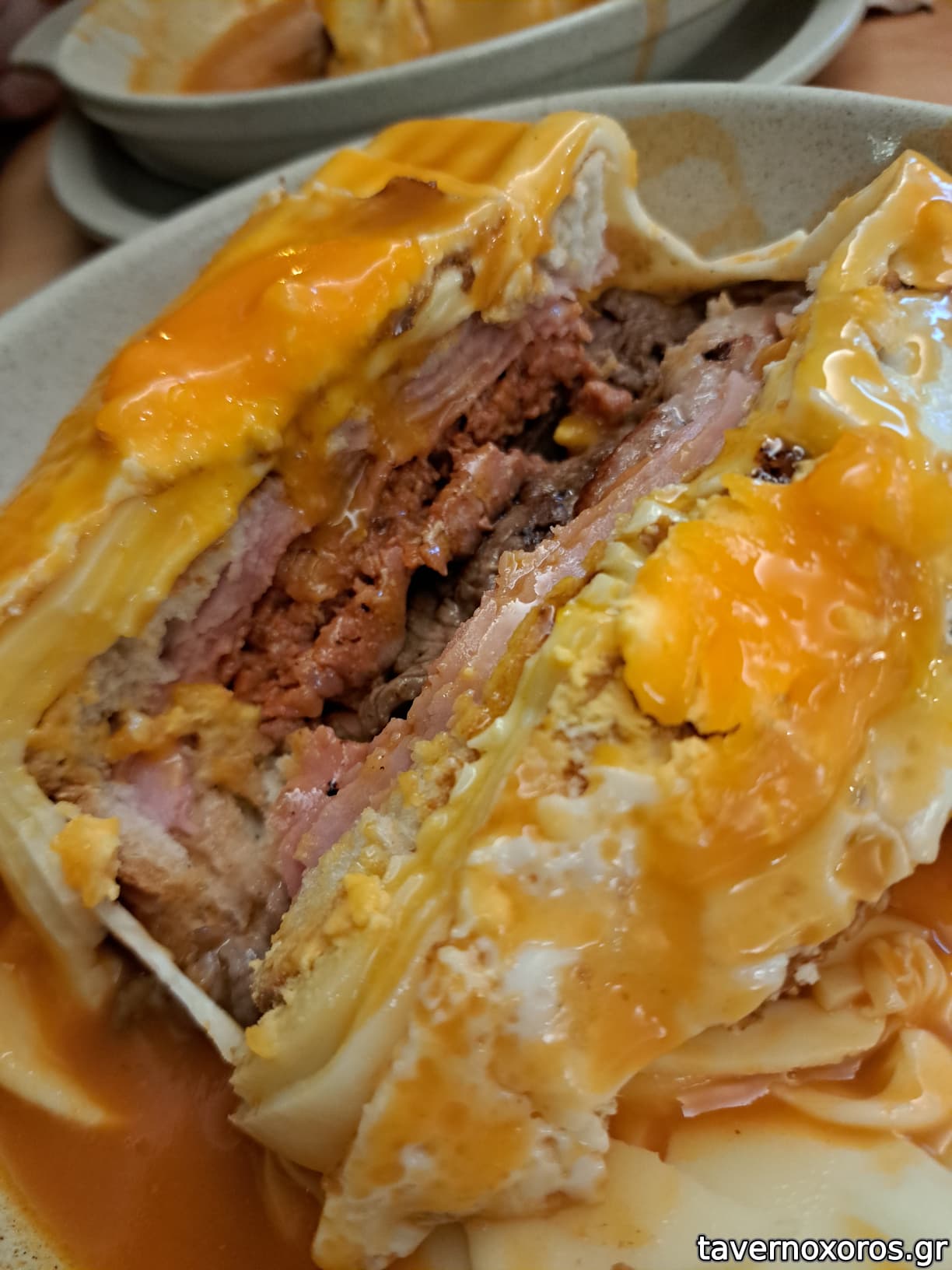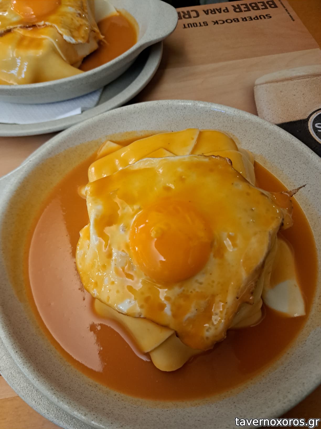 Η francesinha έρχεται από τους χειρότερους εφιάλτες του καρδιολόγου σου. Ψωμί, μπριζόλα, λουκάνικο, ζαμπόν, λιωμένο τυρί, τηγανητό αυγό και σάλτσα piri piri. Συνοδεύεται με πατάτες τηγανητές.