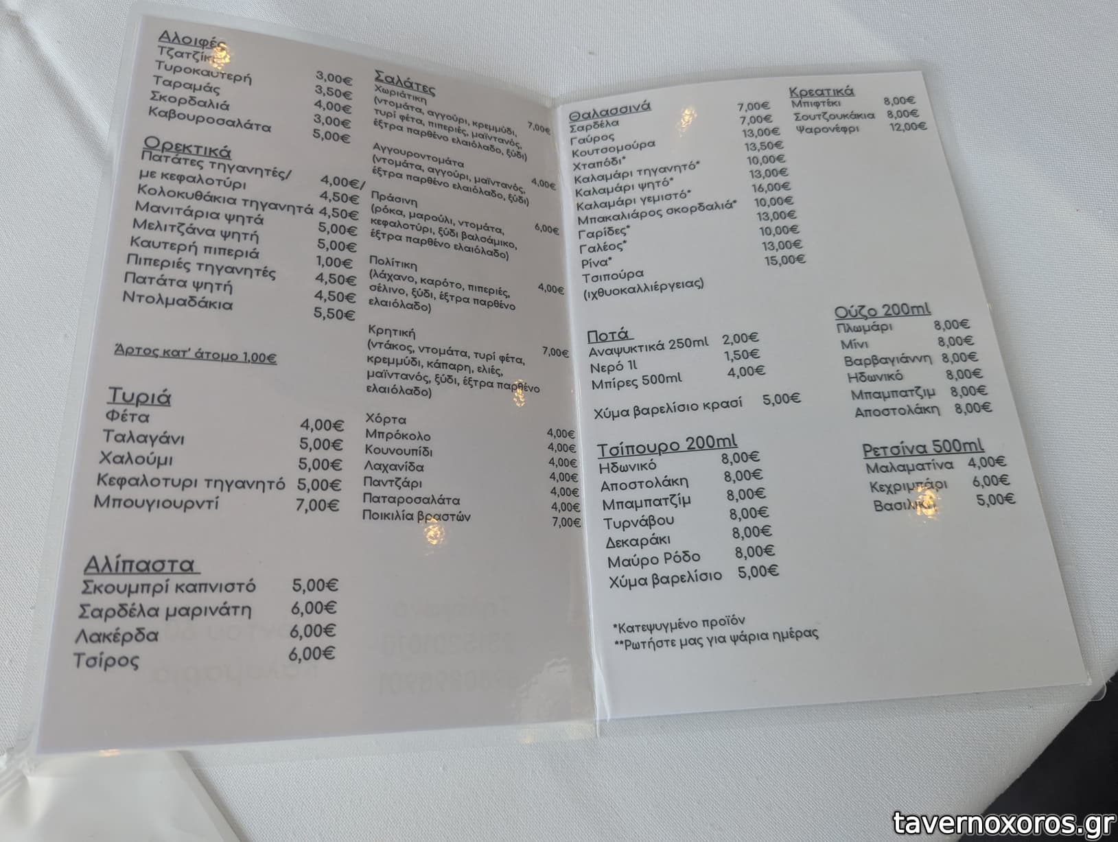 γαύρος, χταπόδι, καλαμαρακια τηγανιτά, μπακαλιάρος σαγανακι (Δοκιμαστη τρέχα για βουτιές), παντζάρια. ψωμάκι ψητό.