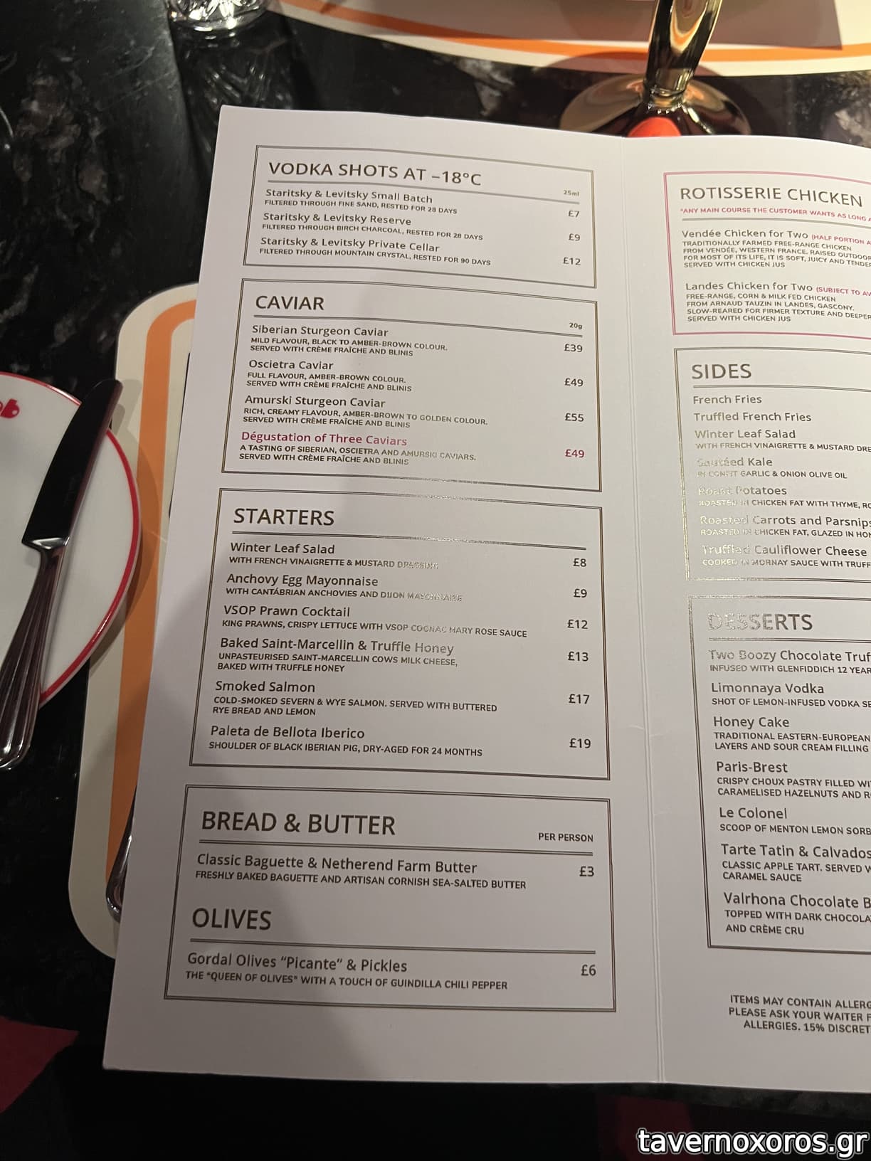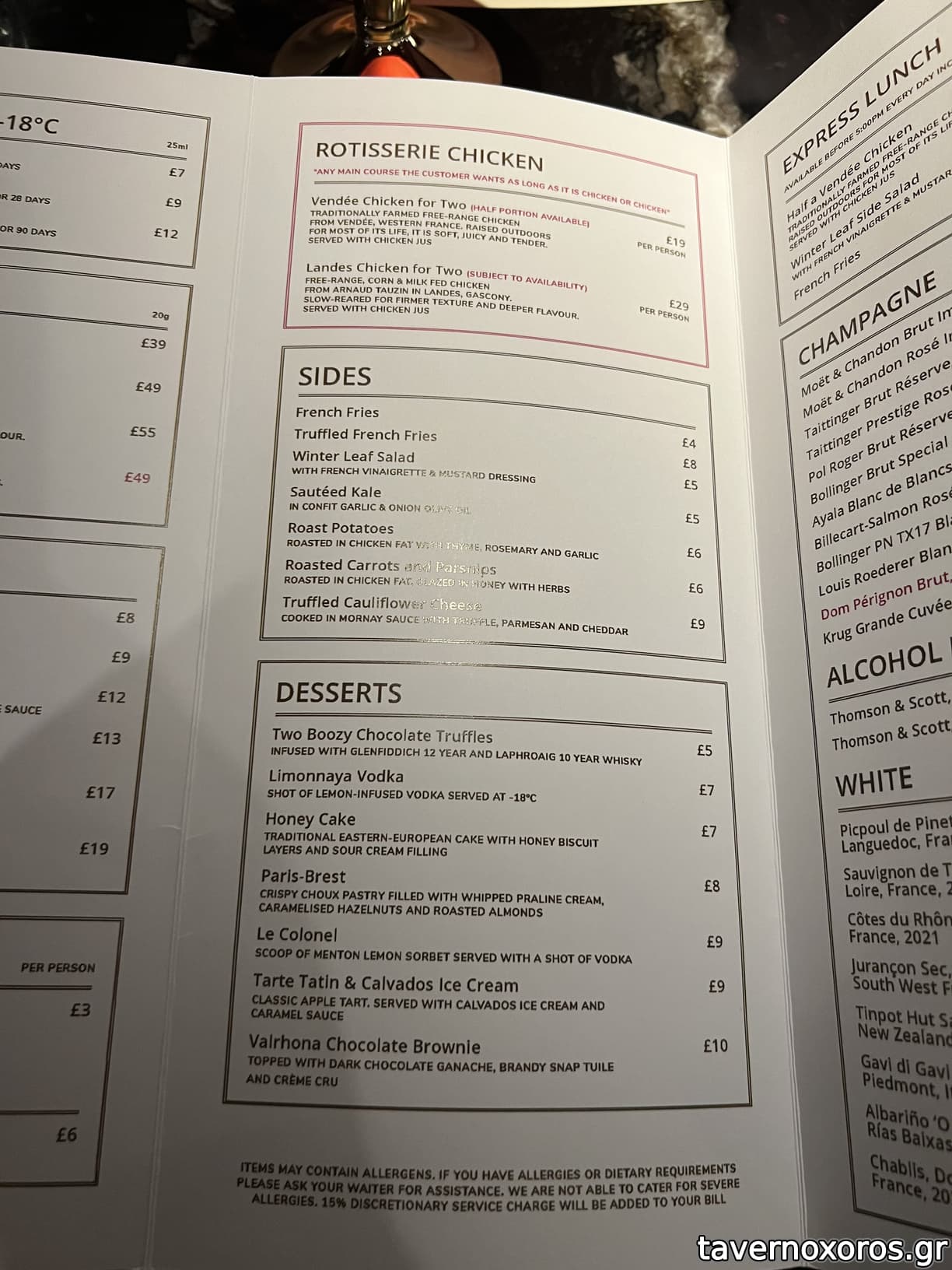 Το κοτόπουλο που δοκίμασα έκανε £29 το μισό, το οποίο θεωρώ πολύ ακριβό. Καλοψημένο και ζουμερό όντως, αλλά 60 ευρώ για ένα κοτόπουλο, είναι υπερβολή κατά την άποψη μου. Οι πατάτες ήταν καλές, η σαλάτα μέτρια, ωραίος χώρος, καλό σέρβις.