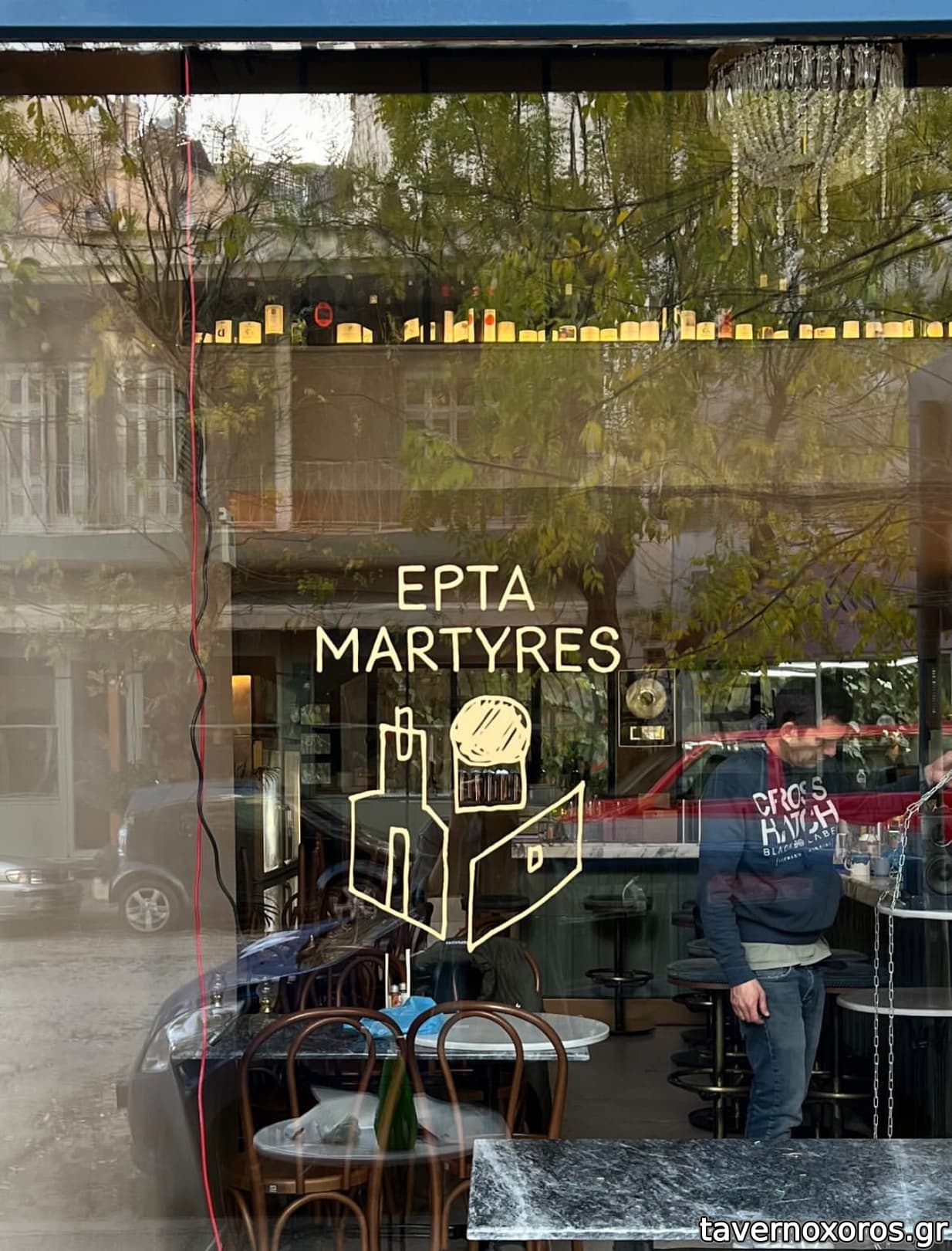 (Σε ρωτάνε για αλλεργίες κλπ ) είδα να τρώνε δίπλα ταραμά ,μύδια αχνιστά κλπ μου φάνηκαν μια χαρά …η κατηγοριοποίηση κρασιών γίνεται με τα ονόματα των επτά μαρτύρων π.χ. Iάμβλιχος shoots magnum, Μαρτίνος drinks fizz, Ιωάννης sinks white, Διονύσιος likes orange, Εξακουστωδιανός licks rosé, Μαξιμίνος wears red, Αντώνιος goes hard.