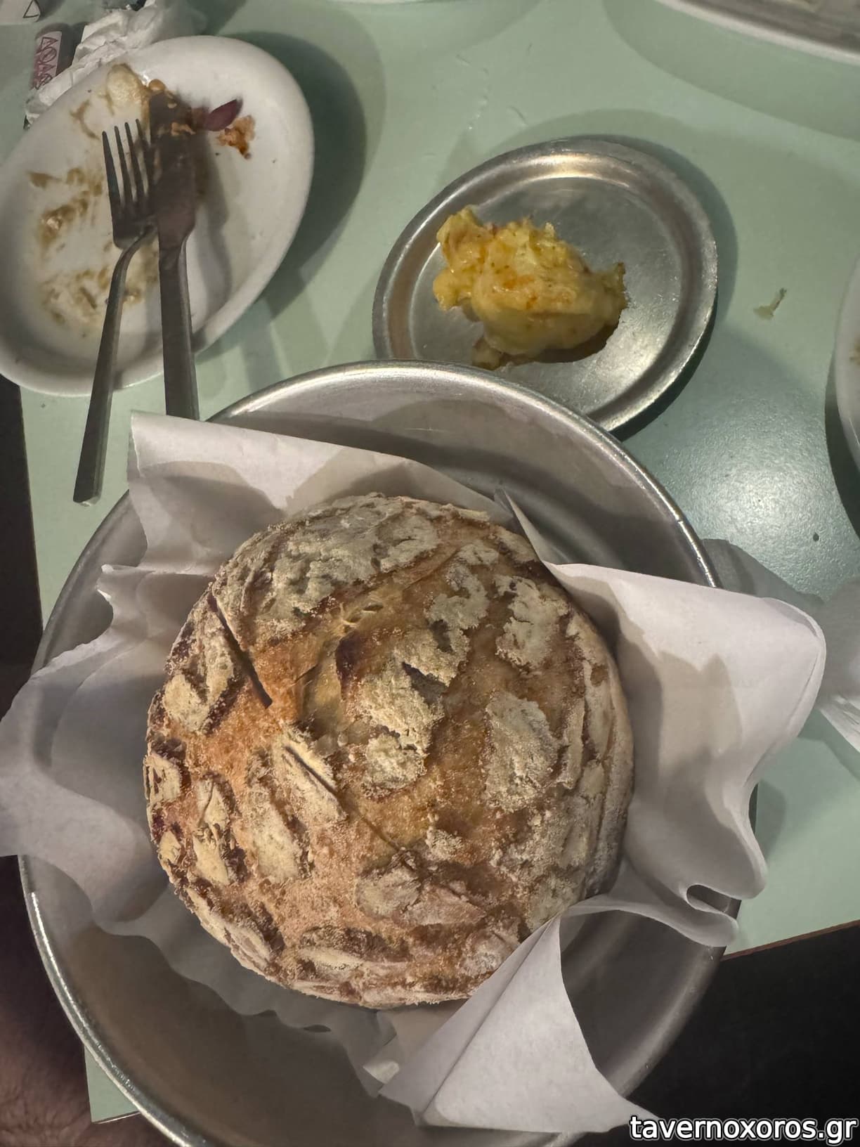 Προζυμένιο καρβέλι με βούτυρο (μέτριο, λόγω του ότι είχε ψηθεί πριν από αρκετή ώρα, κατά τα άλλα νόστιμο)