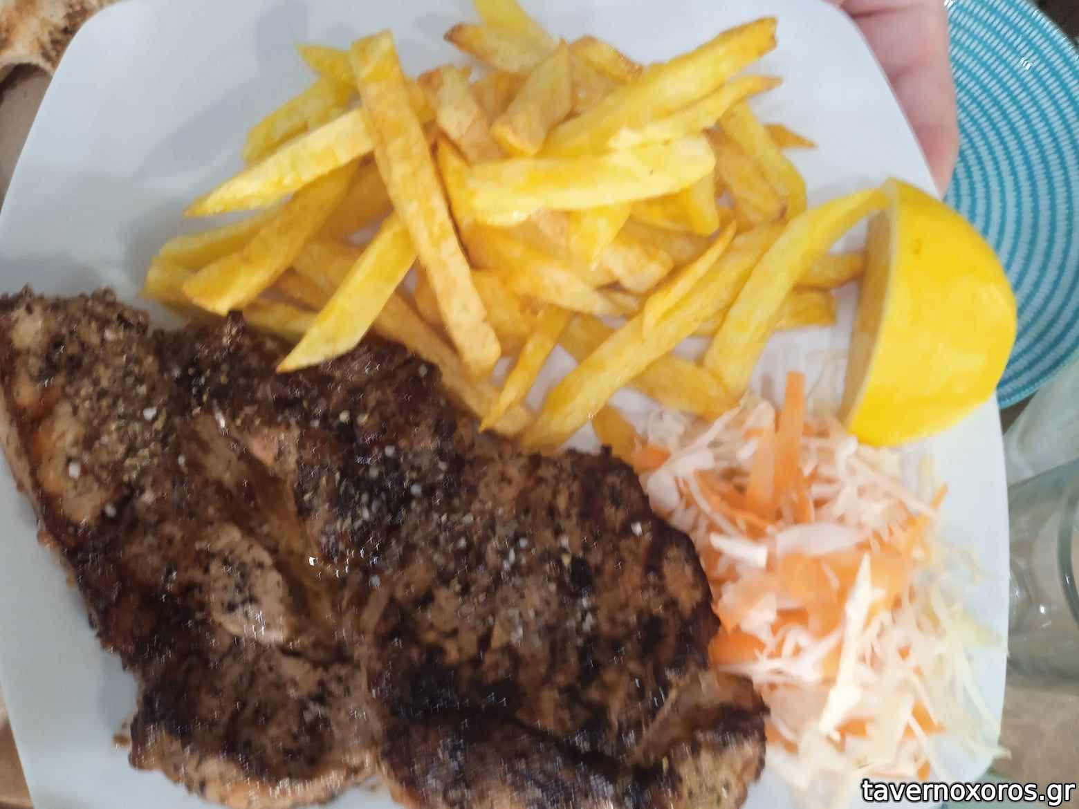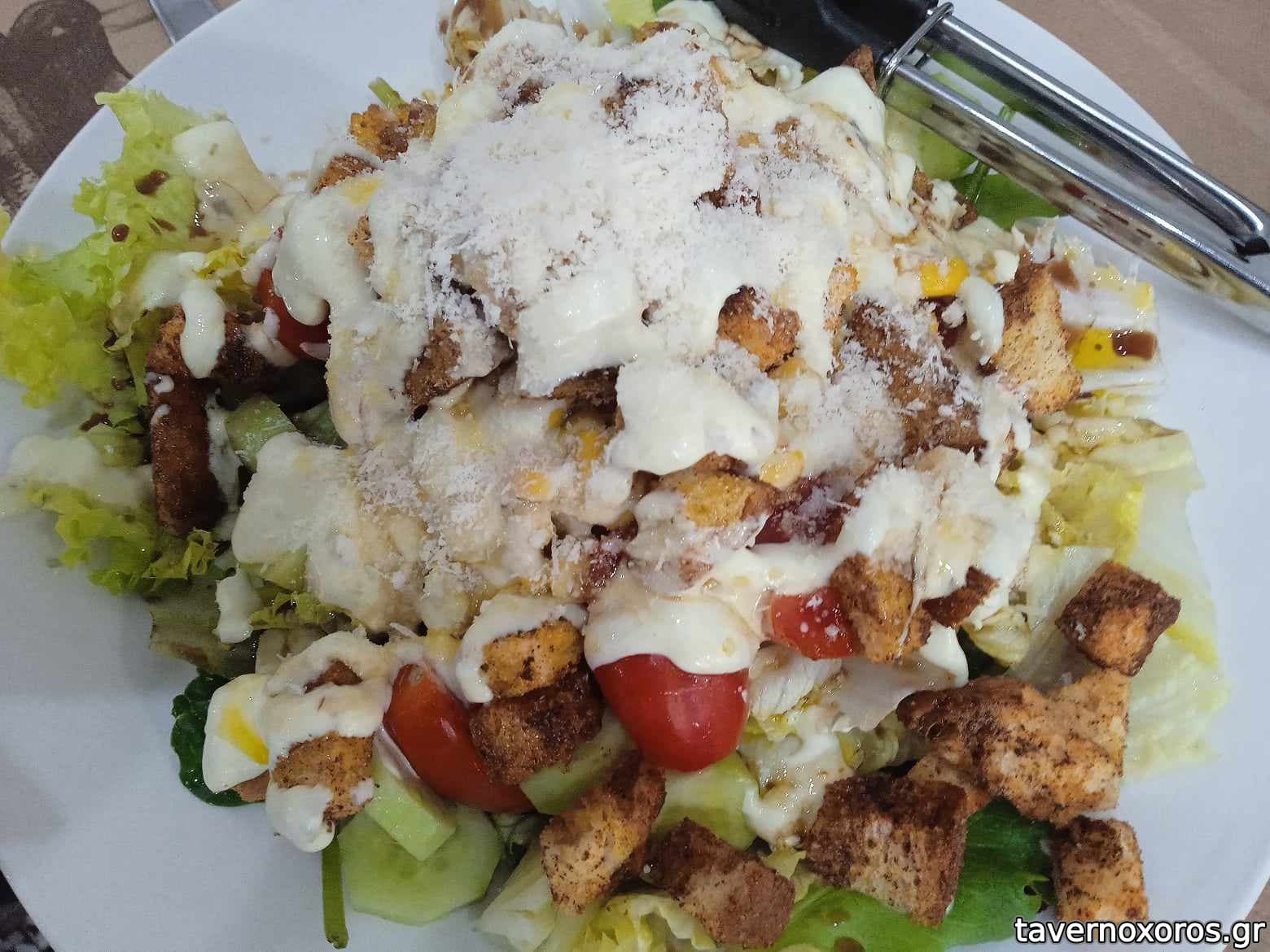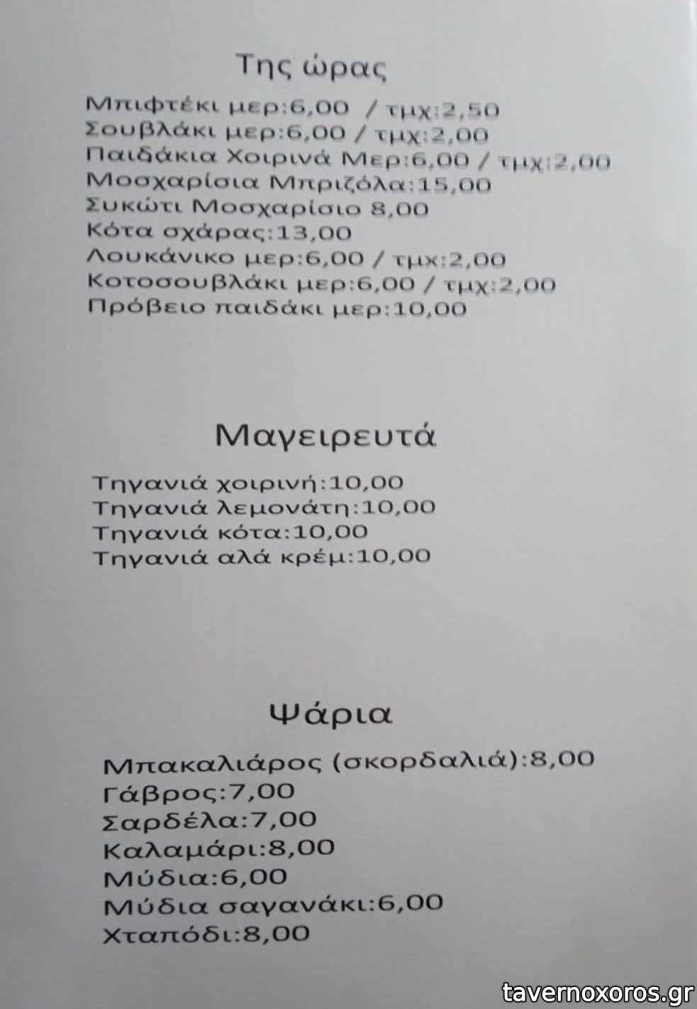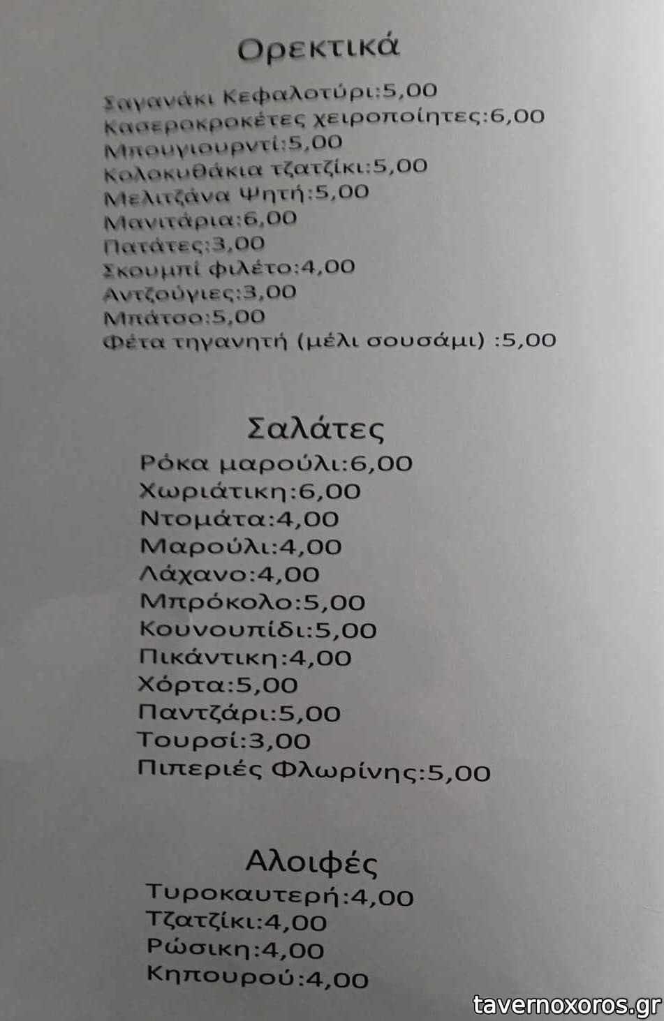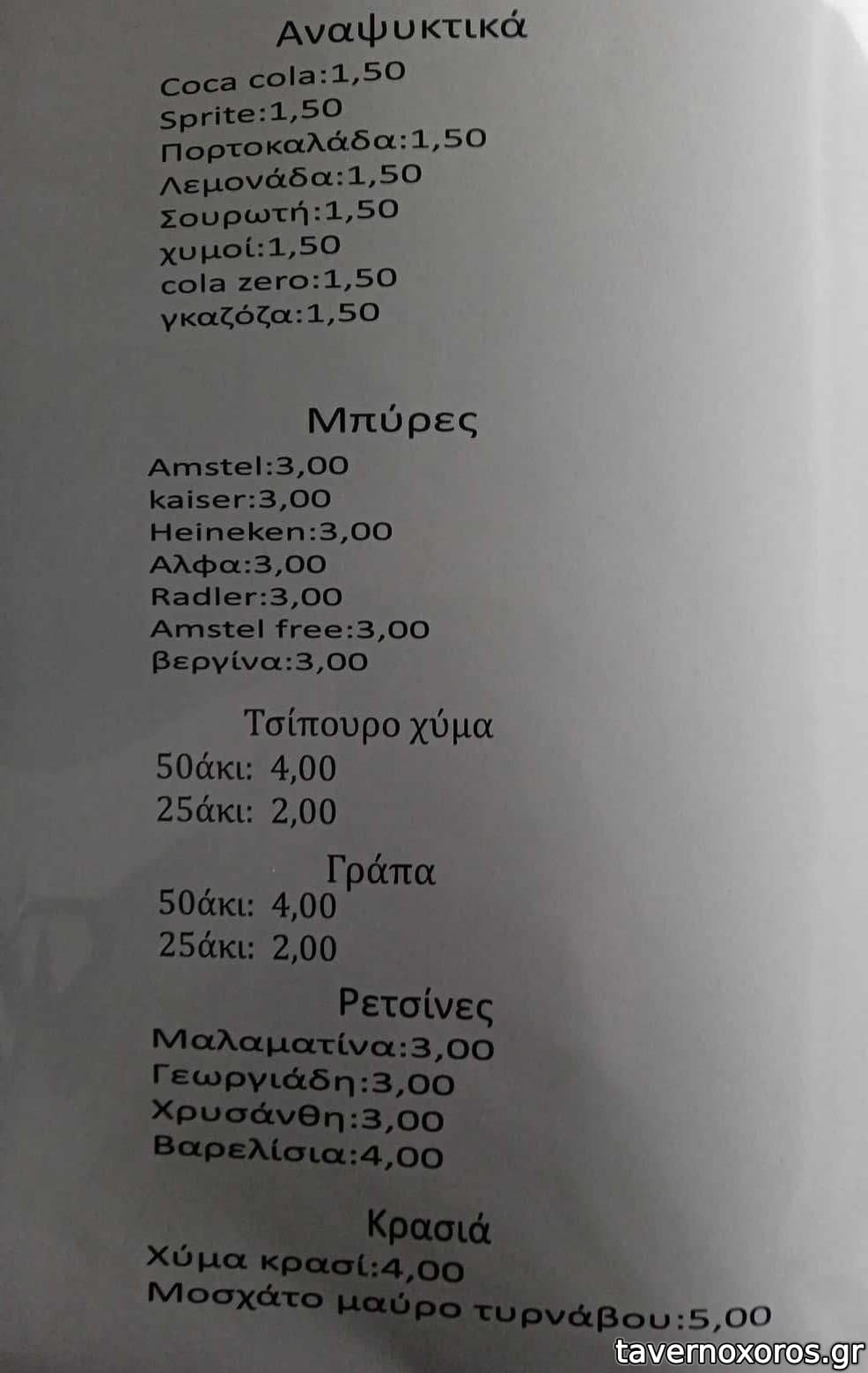 Φεβρουάριος 2024, παρέα 6 ατόμων. Παραγγείλαμε ψωμί ψητό, 1 χόρτα, 1 τυροκαυτερή, 1 πικάντικη σαλάτα (δεν ήταν πικάντικη, αλλά λάχανο καρότο αγγούρι), 1 μελιτζάνα ψητή (ήρθε ένα πήλινο, στο οποίο κάτω κάτω είχε μελιτζανοσαλάτα εμπορίου και από πάνω άφθονο λευκό τυρί ή ίσως μυζήθρα και μπόλικα λάδια), 1 σαλάτα ρόκα μαρούλι (δεν υπήρχε καθόλου ρόκα στο πιάτο, αλλά υπήρχαν μαρούλι, αγγούρια, ντοματίνια, καλαμπόκια, κρουτόν, σάλτσα ντρέσινγκ με σκόρδο και τριμμένη ξηρή μυζήθρα), 2 πατάτες τηγανητές φρέσκιες (πολύ καλές), 3 μερίδες πρόβεια παϊδάκια (εξαιρετικά), 1 μπριζόλα χοιρινή, 1 κοτοσουβλάκια (στον κατάλογο έγραφε 2 τμχ., η σερβιτόρα είπε «θα σας βάλω 3»), 1 λουκάνικο (στον κατάλογο έγραφε 2 τμχ., η σερβιτόρα είπε «θα σας βάλω 3», ζητήθηκε χωριάτικο, είπε «δεν έχουμε, θα σας φέρουμε γερμανικό»!), 2 τηγανιές χοιρινές λεμονάτες με κρεμμύδια και πράσινες πιπεριές, γλυκιές και καυτερές (καταπληκτικές οι τηγανιές, το κρέας αφρός, μάλλον λαιμός), 1 Σουρωτή και 3 ρετσίνες Χρυσανθή από Vaeni Νάουσας, ελαφρές και δροσερές (βλ. φωτο).