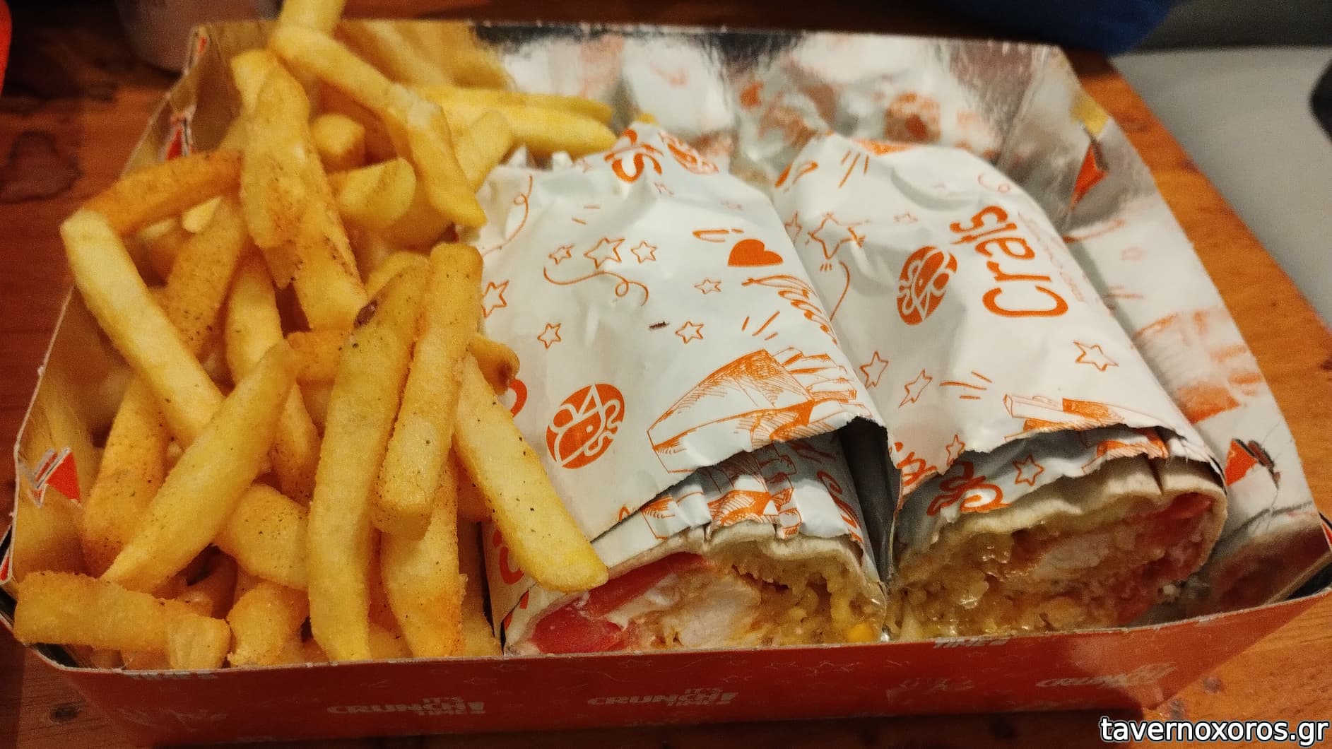 Μπουρίτο κοτόπουλο, με buttermilk τηγανητό κοτόπουλο … κοτομπουκιές, ένα ρύζι απροσδιόριστο, γκουακαμόλε προκάτ, φασόλια, μπέικον, λίγη πρασινάδα… γεύση μια μπουκιά και φτύσιμο.