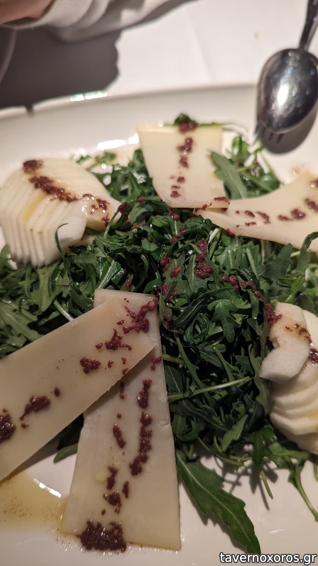 Σαλάτα ρόκα, αχλάδι, ένα σκληρό τυρί αρκετά έντονο και περιχυμένο με πάστα ελιάς, προσφέρθηκε λάδι-ξύδι γιατί ήρθε τελείως στεγνή)