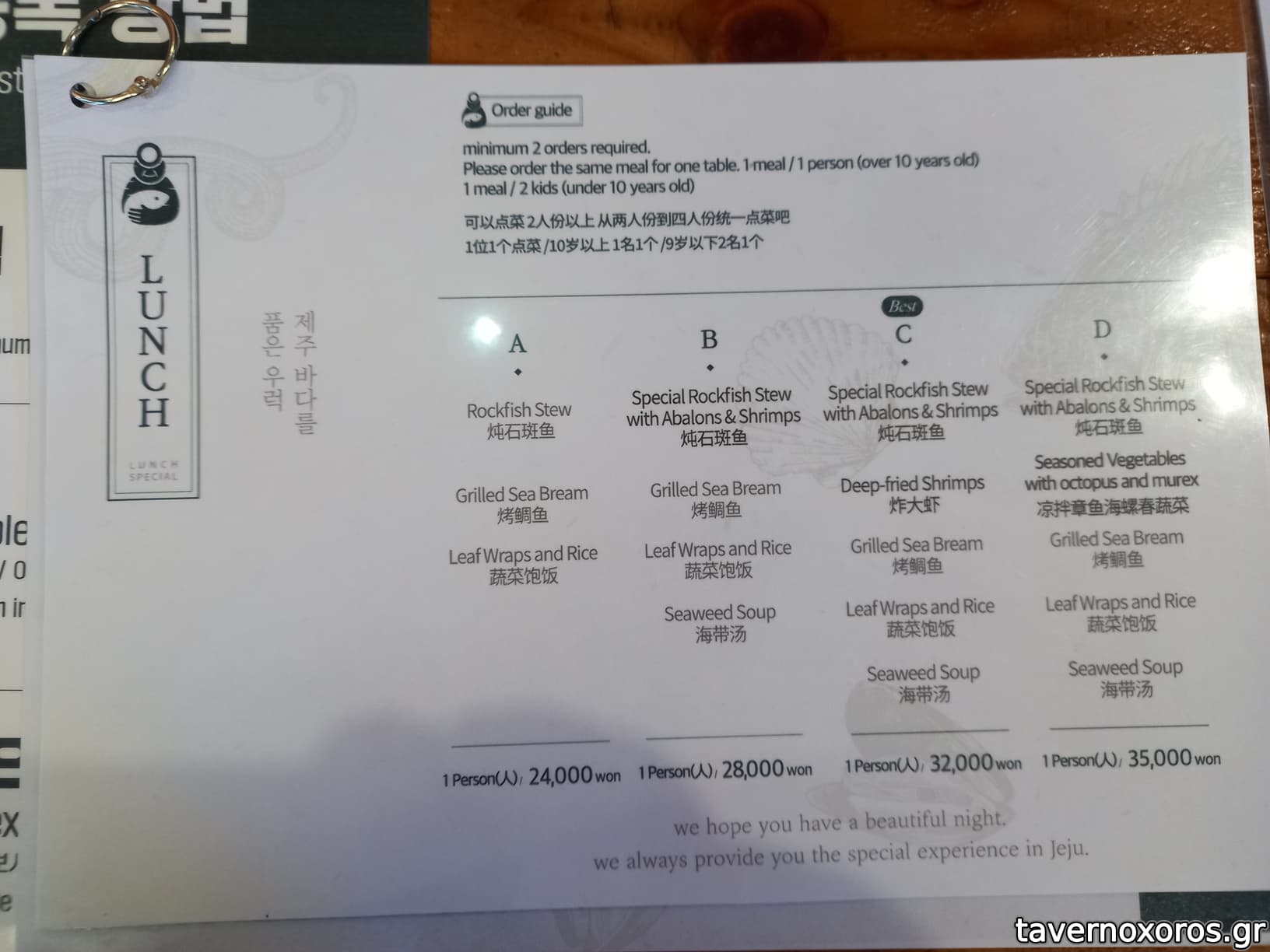 Πήγα Απρίλιο του 2024. Εστιατόριο που ειδικεύεται σε ψαρόσουπες. Πολύ δημοφιλές, χρειάστηκε να περιμένουμε πάνω από 45 λεπτά (δε δέχονται κρατήσεις), αλλά θεωρείται must για όσους θέλουν να δοκιμάσουν ψάρια στο νησί. Παραγγείλαμε ένα από τα 4 διαθέσιμα σετ μενου για 2 άτομα, το οποίο ήταν τέραστιο και περιλάμβανε ψαρόσουπα και τηγανητά ψάρια. Ειδική μνεια στο abalone που ήταν μέρος της ψαρόσουπας και θεωρείται ιδιαίτερος μεζές. Μου φάνηκε καλό, όπως και τα υπόλοιπα του σετ μενού. Ίσως επειδή δεν είμαι μεγάλος οπαδός των ψαριών, δεν μπόρεσα να εκτιμήσω τόσο πολύ το εστιατόριο, που θεωρείται κορυφαίο από τους ντόπιους...